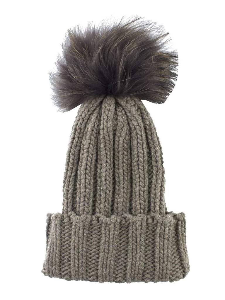 Ribbed knit beanie topped with tonal soft fur pompom.