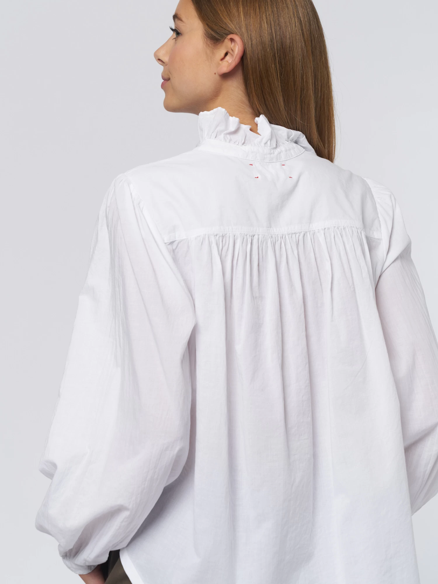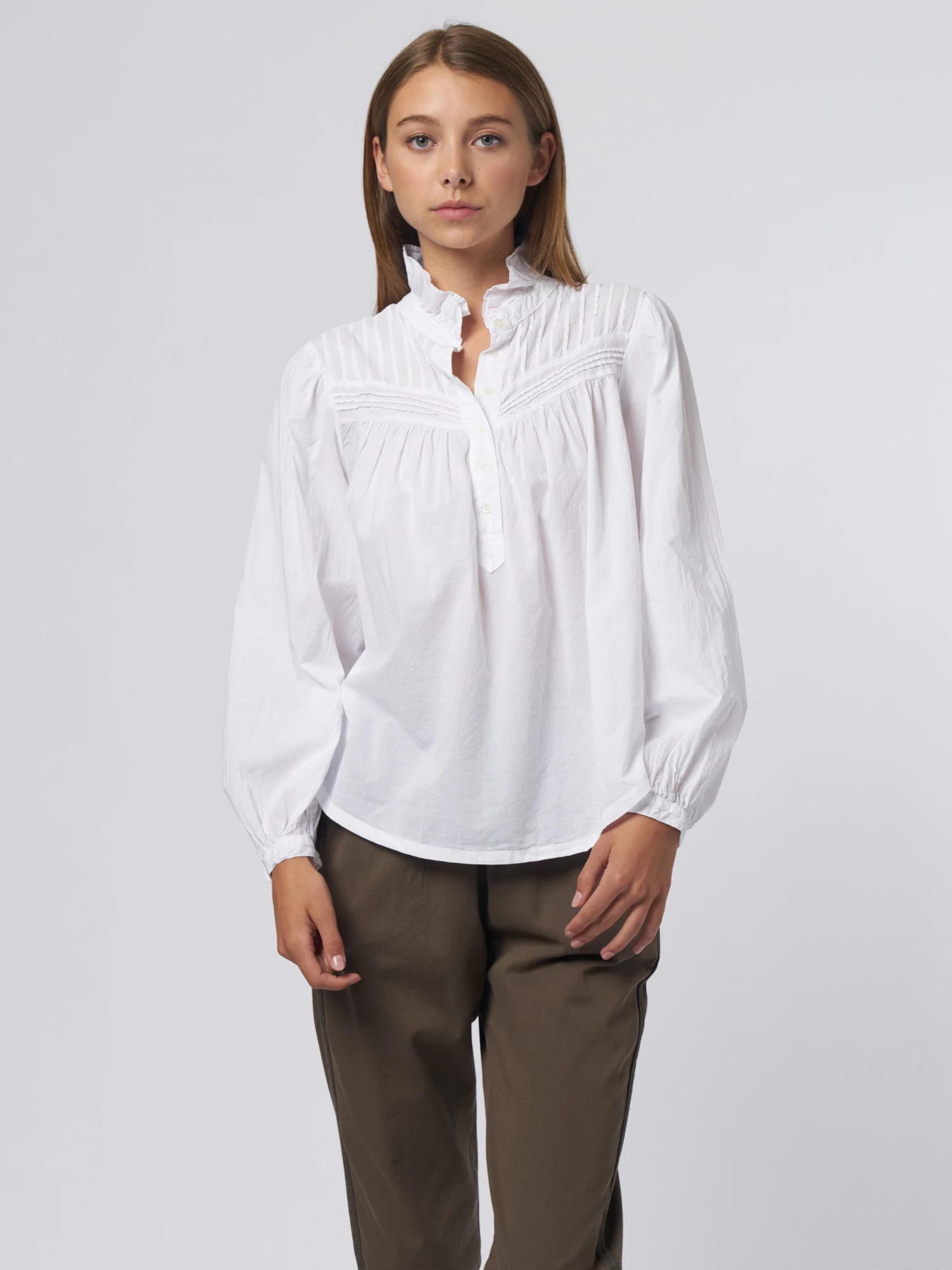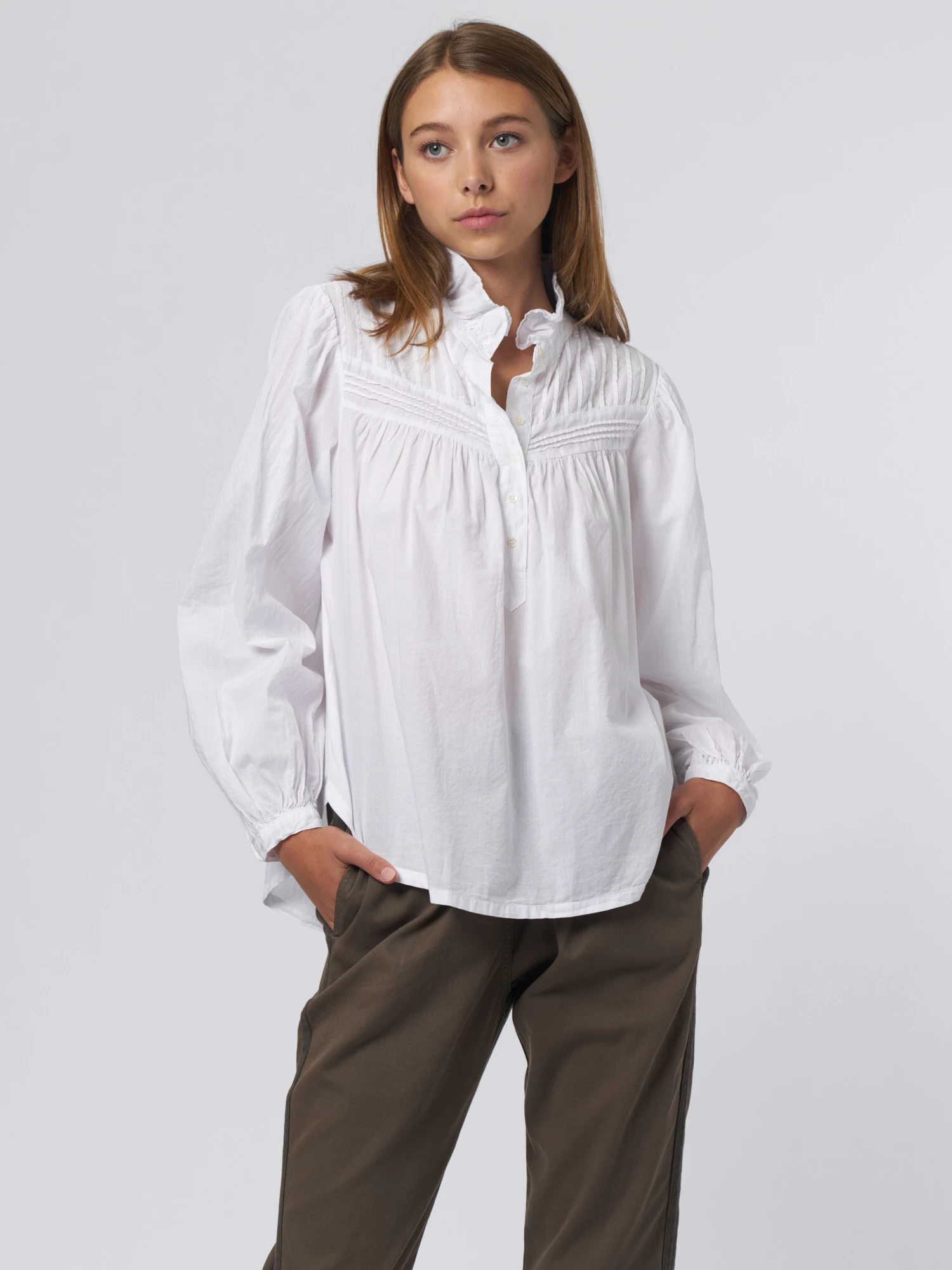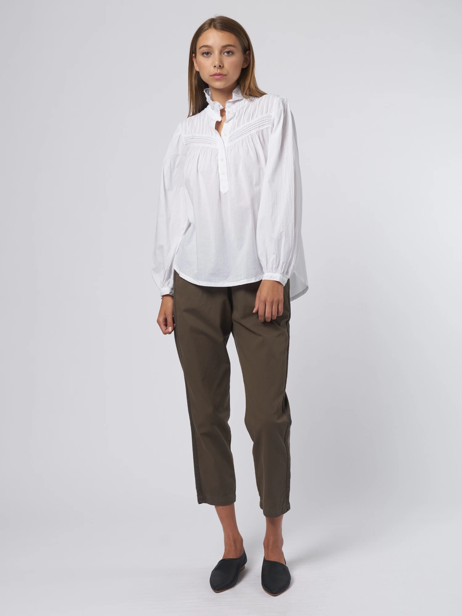 The cotton poplin blouse has a ruffle-neck top with a button-front, pintuck details, back yoke, and button cuff.