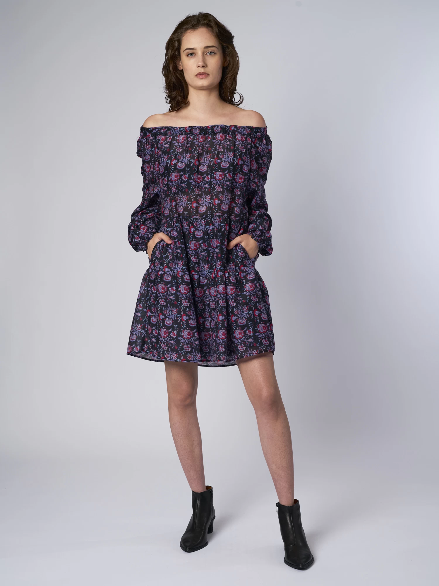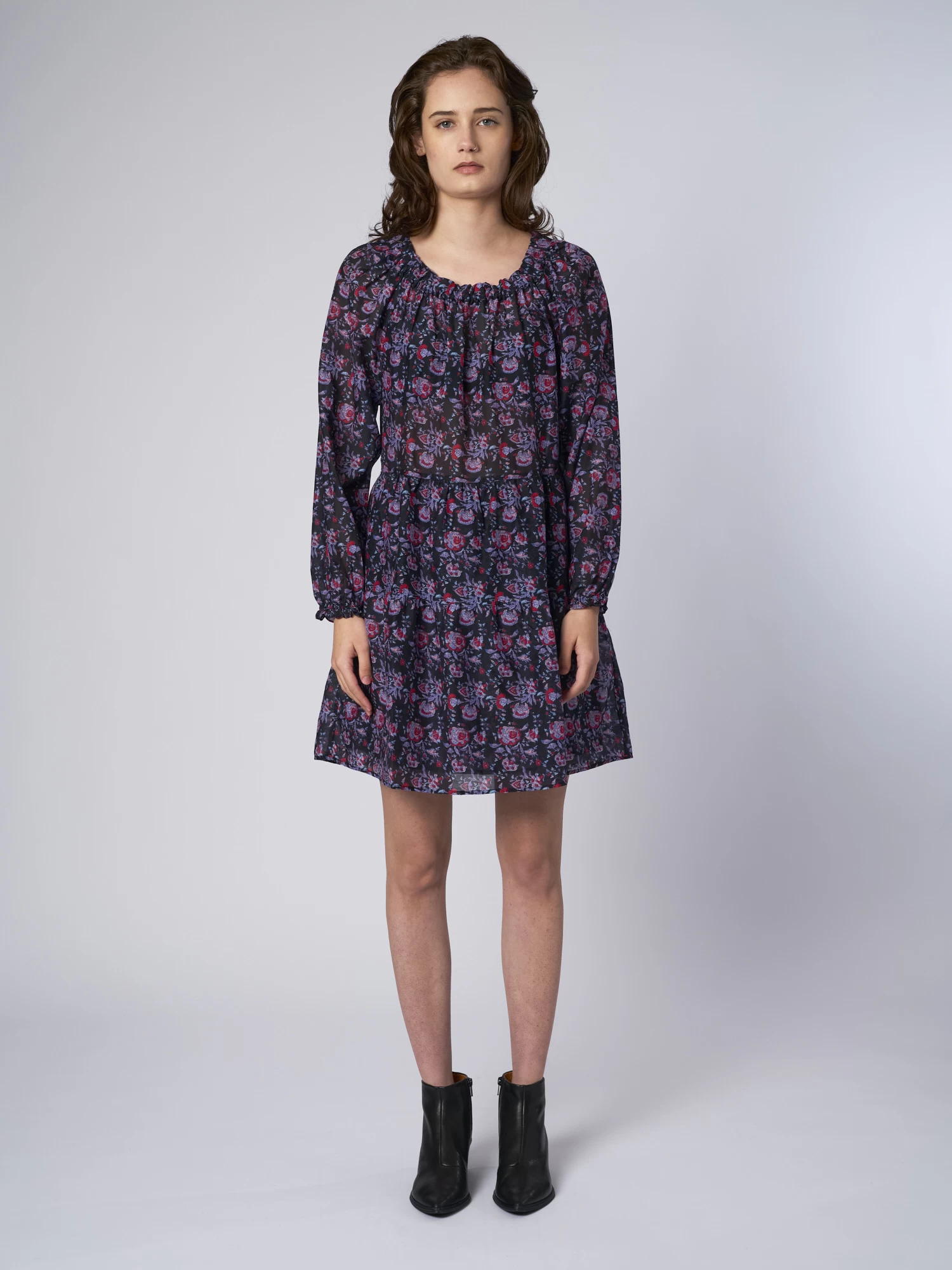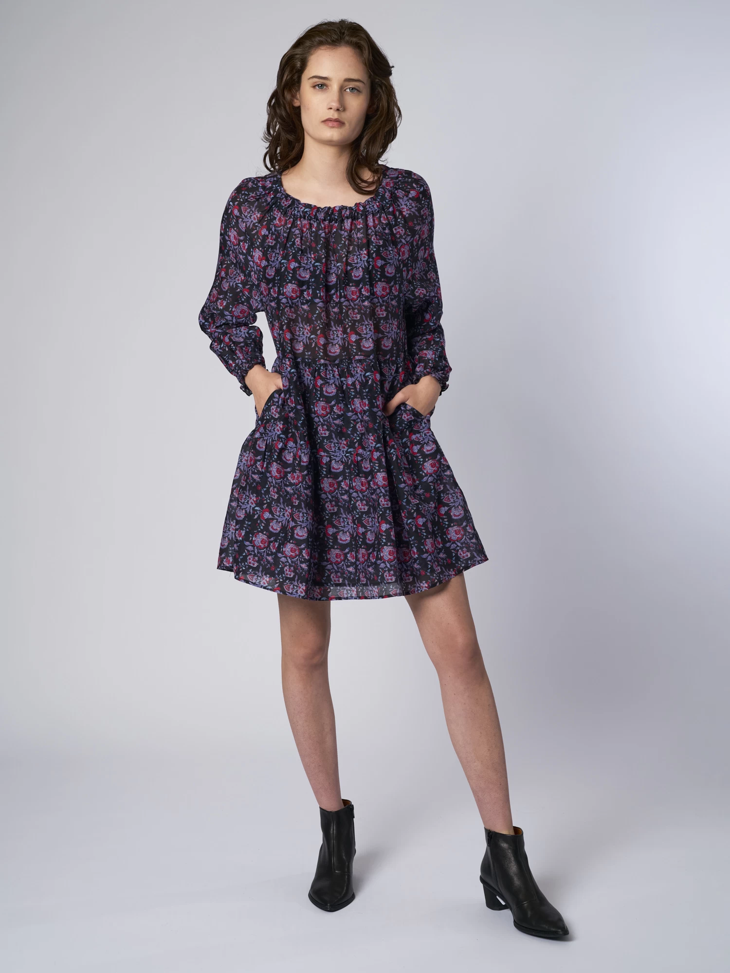 Cotton Silk Voile floral mini dress has elastic shirred neckline and ruffles detailing. Swingy, easy fit with side seam pockets.