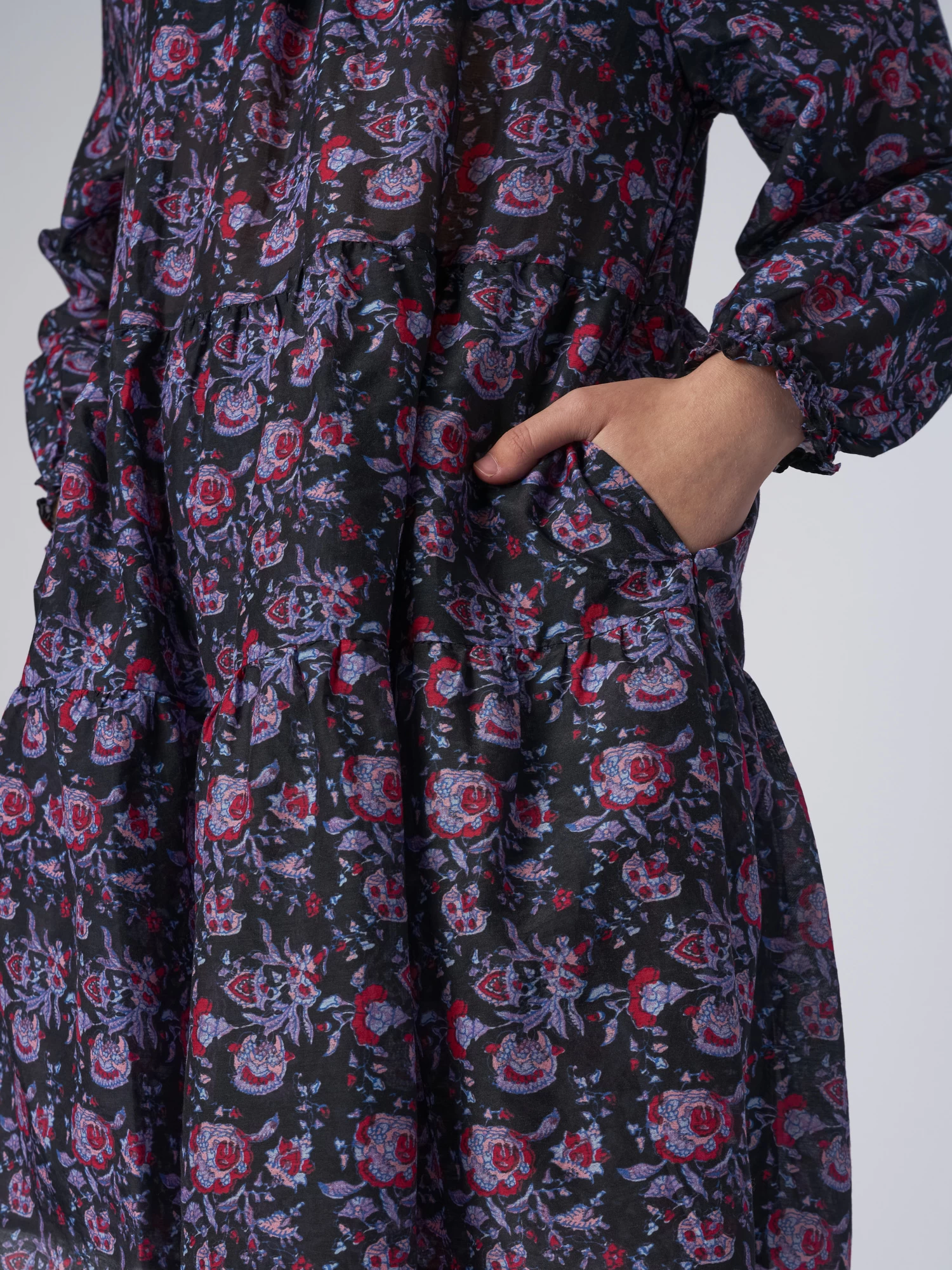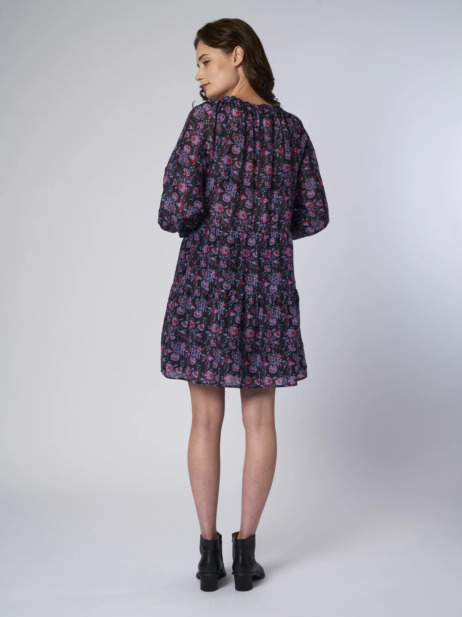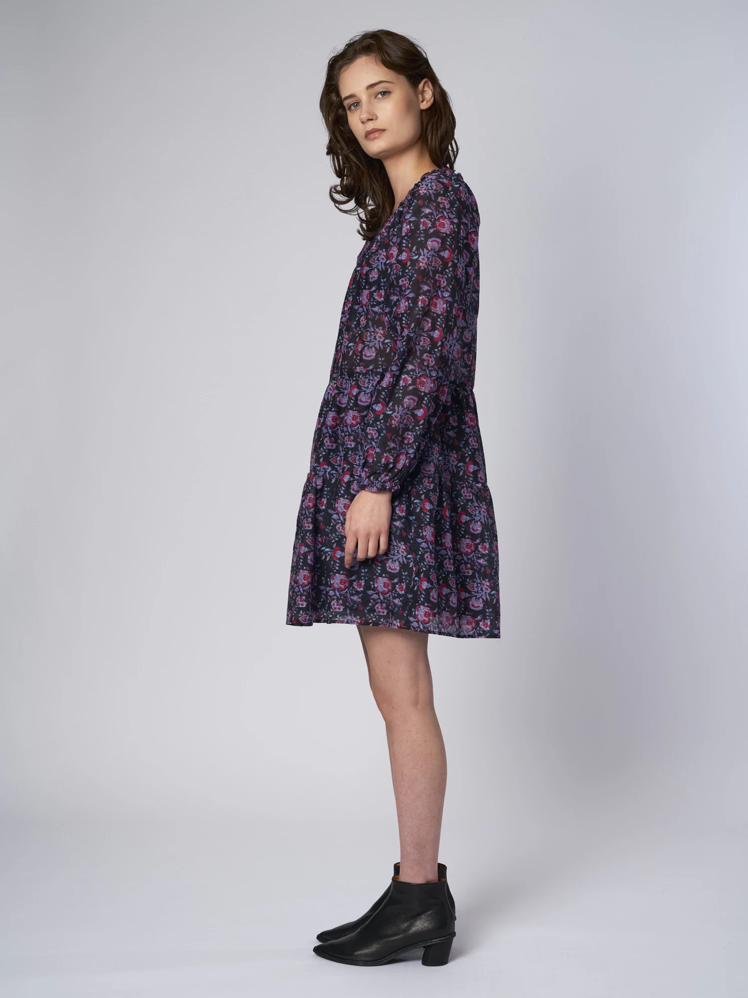 Cotton Silk Voile floral mini dress has elastic shirred neckline and ruffles detailing. Swingy, easy fit with side seam pockets.