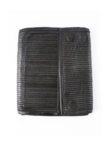 Line textured leather iPad case with magnetic flap closure and interior credit card slots and leather iPad frame.