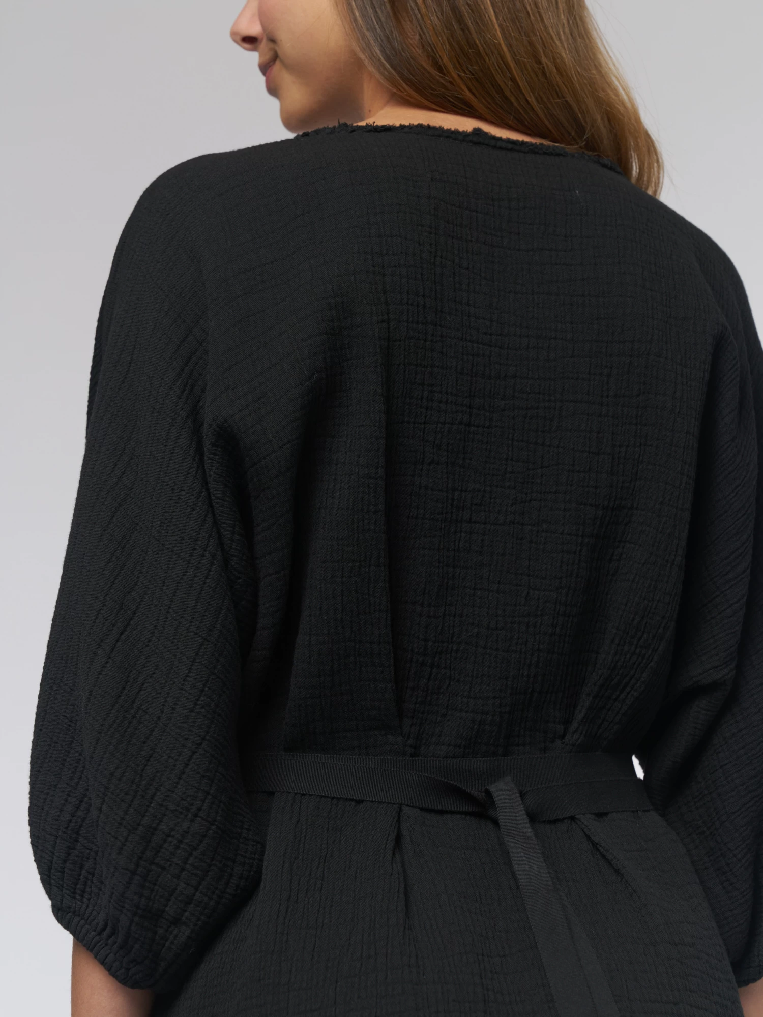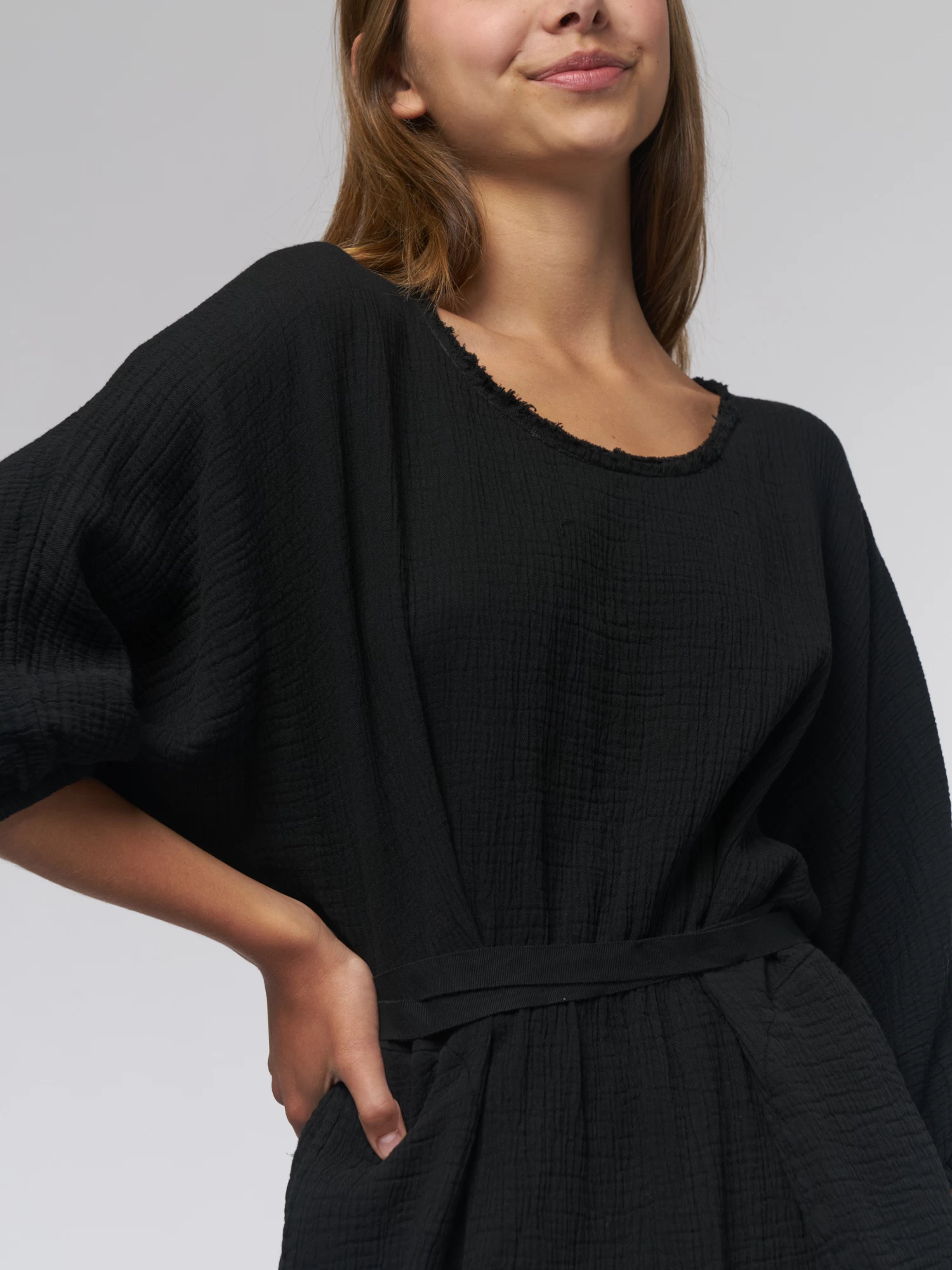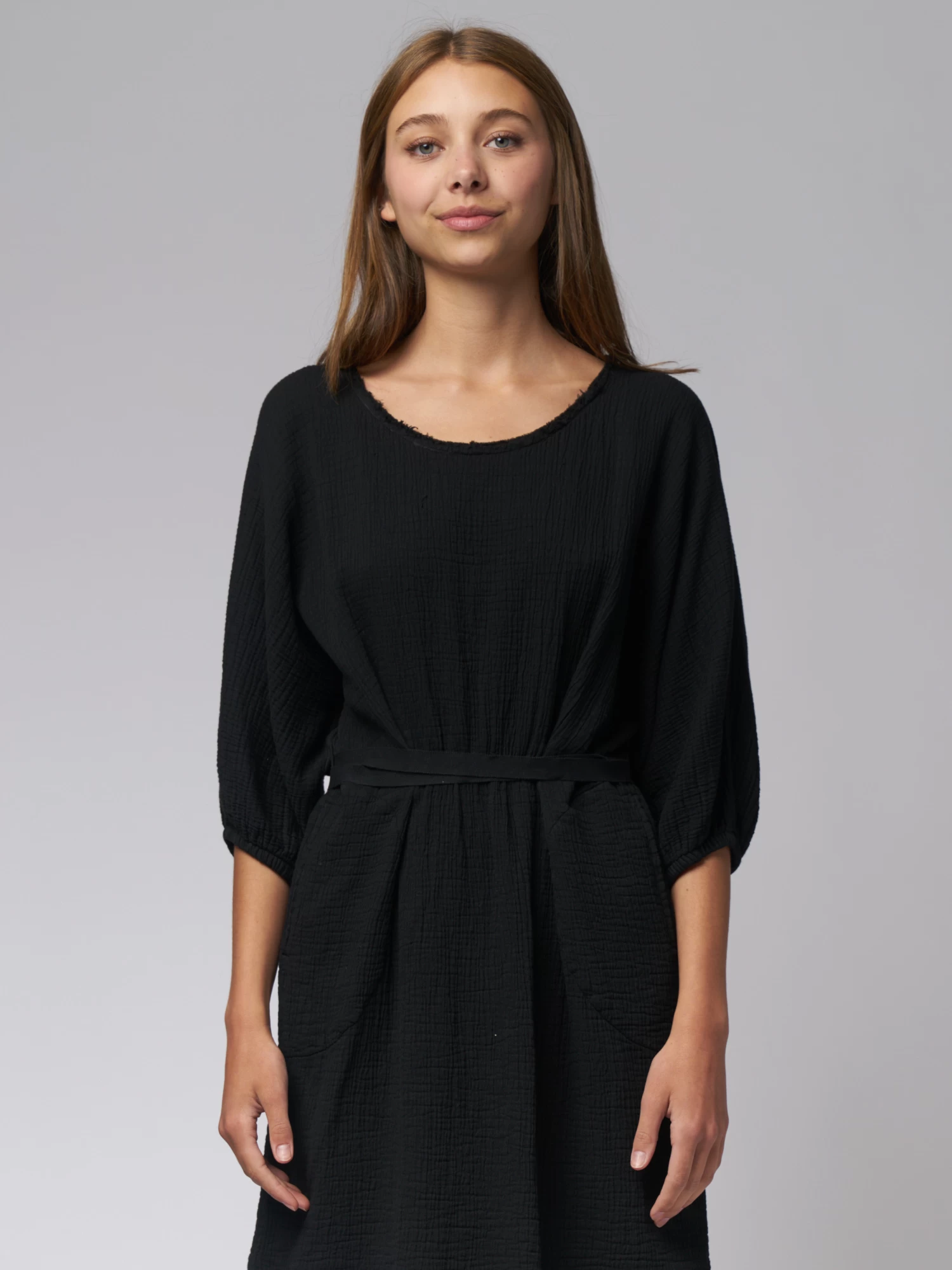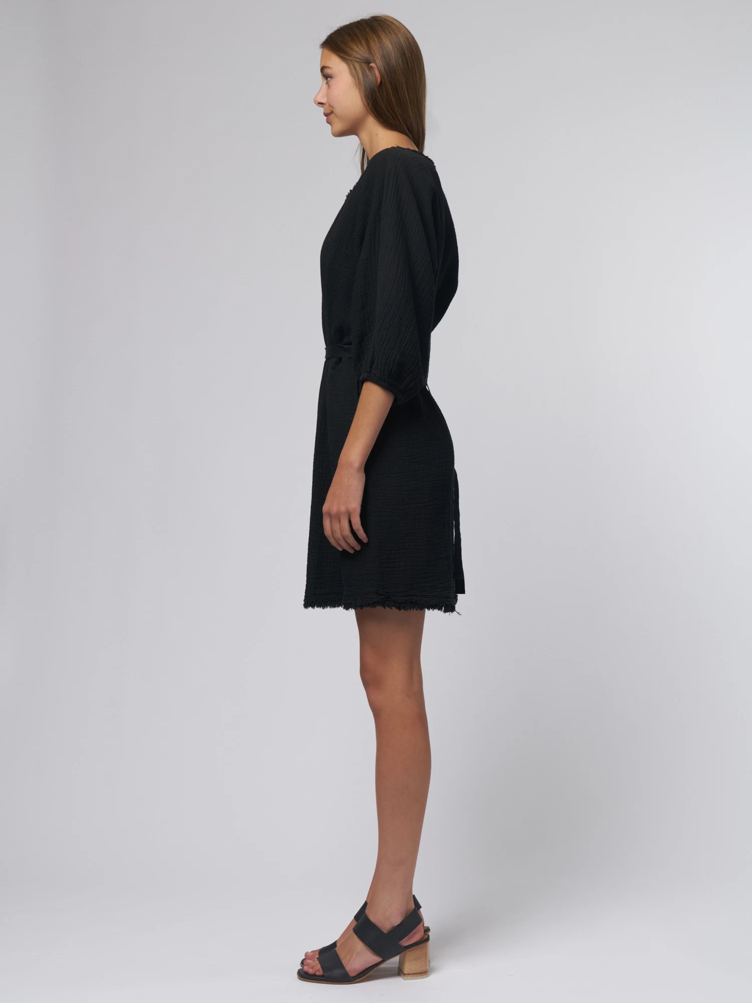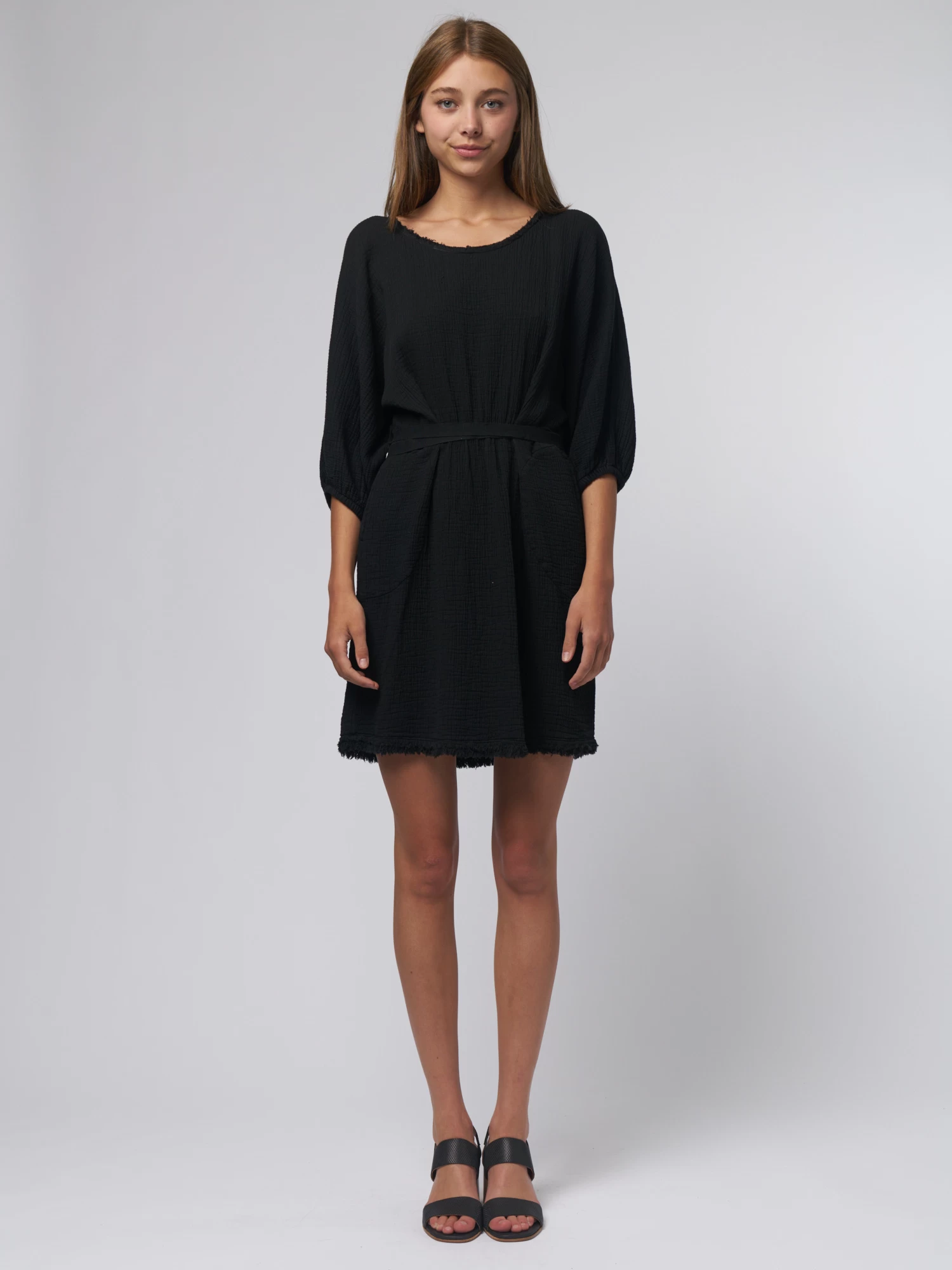 An open neckline with three-quarter gauze tunic dress features gathering at the waist and side seam pockets.
