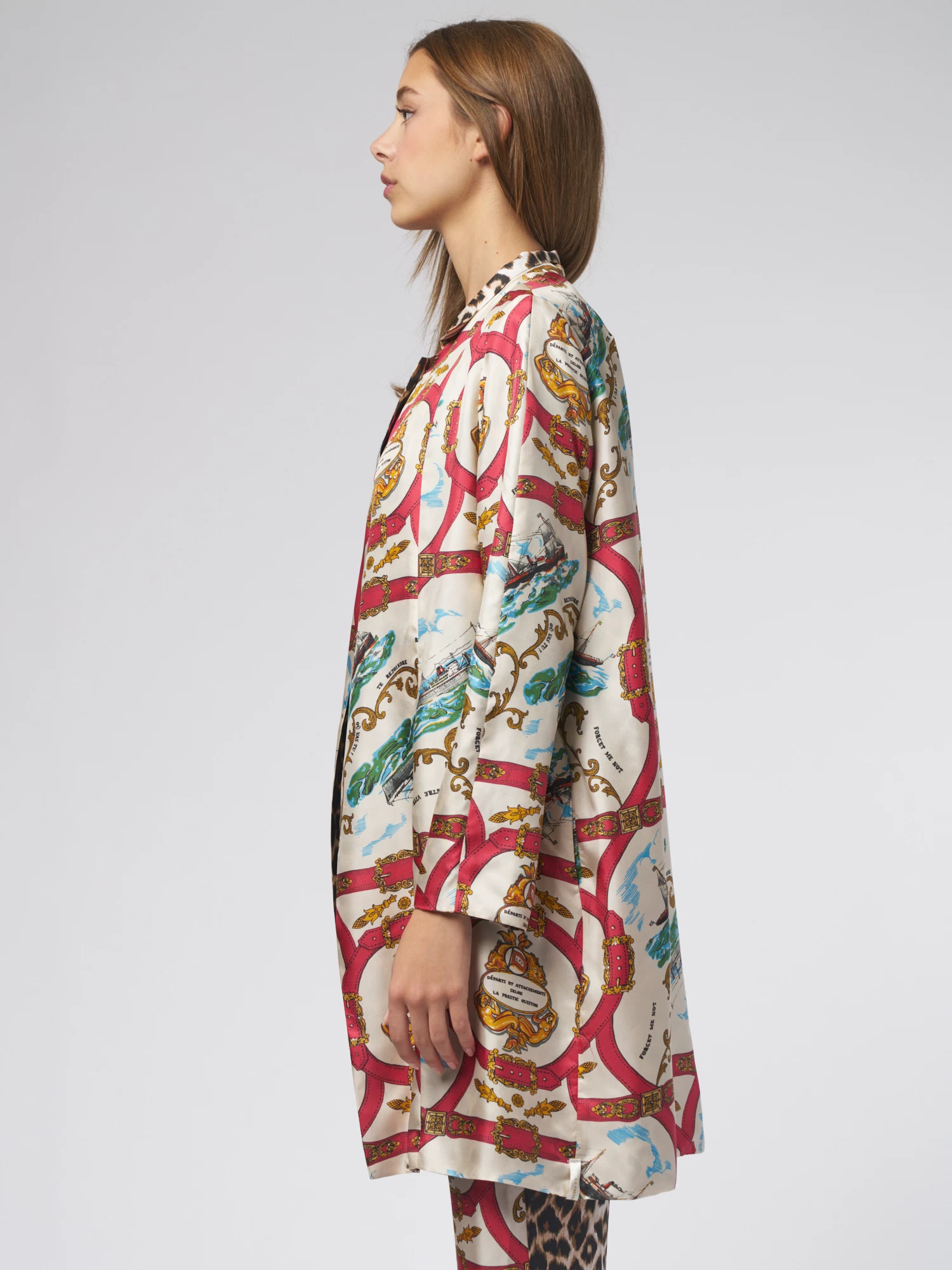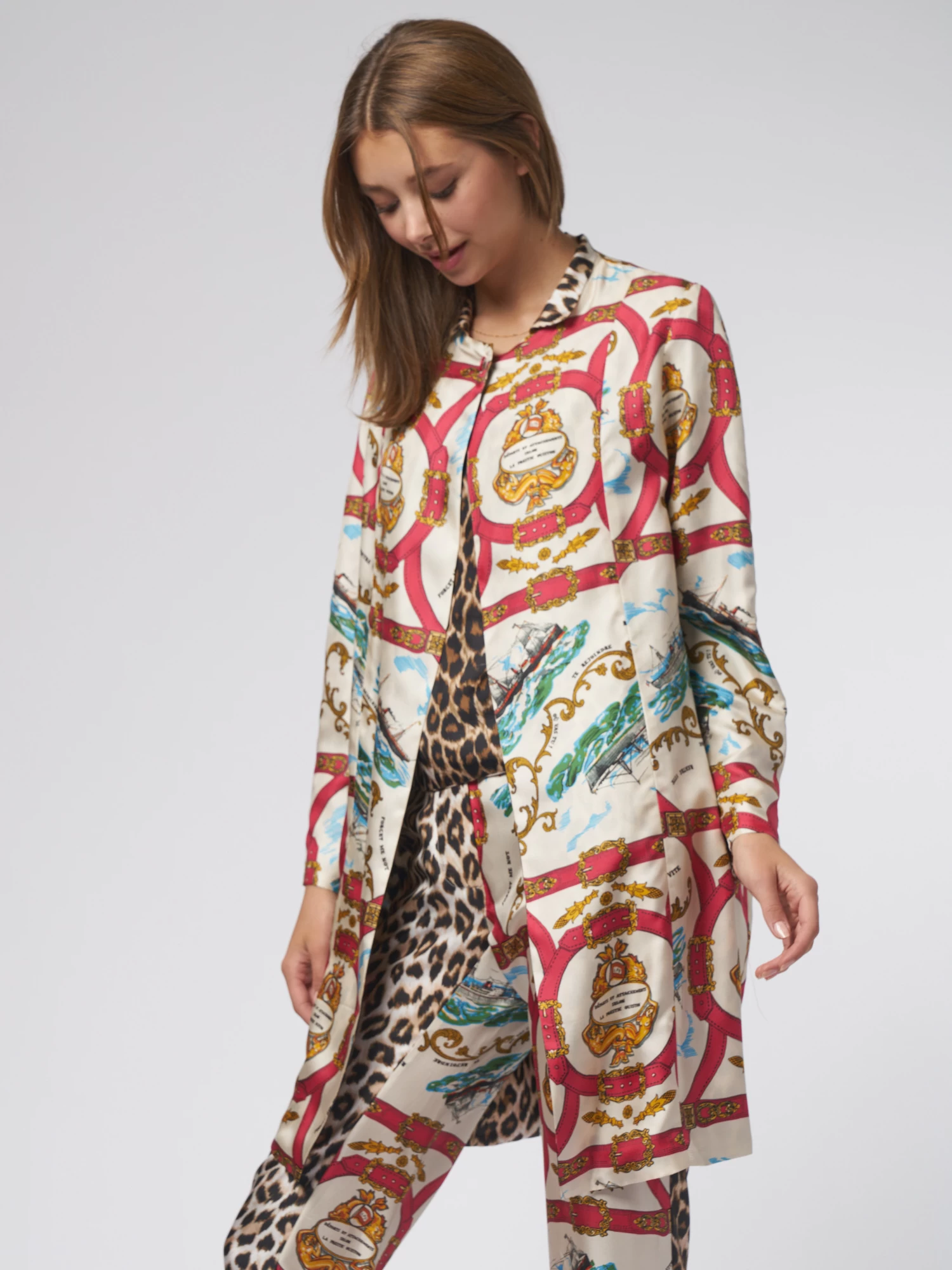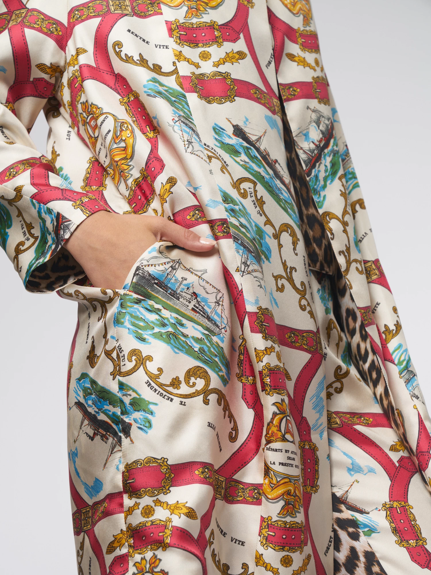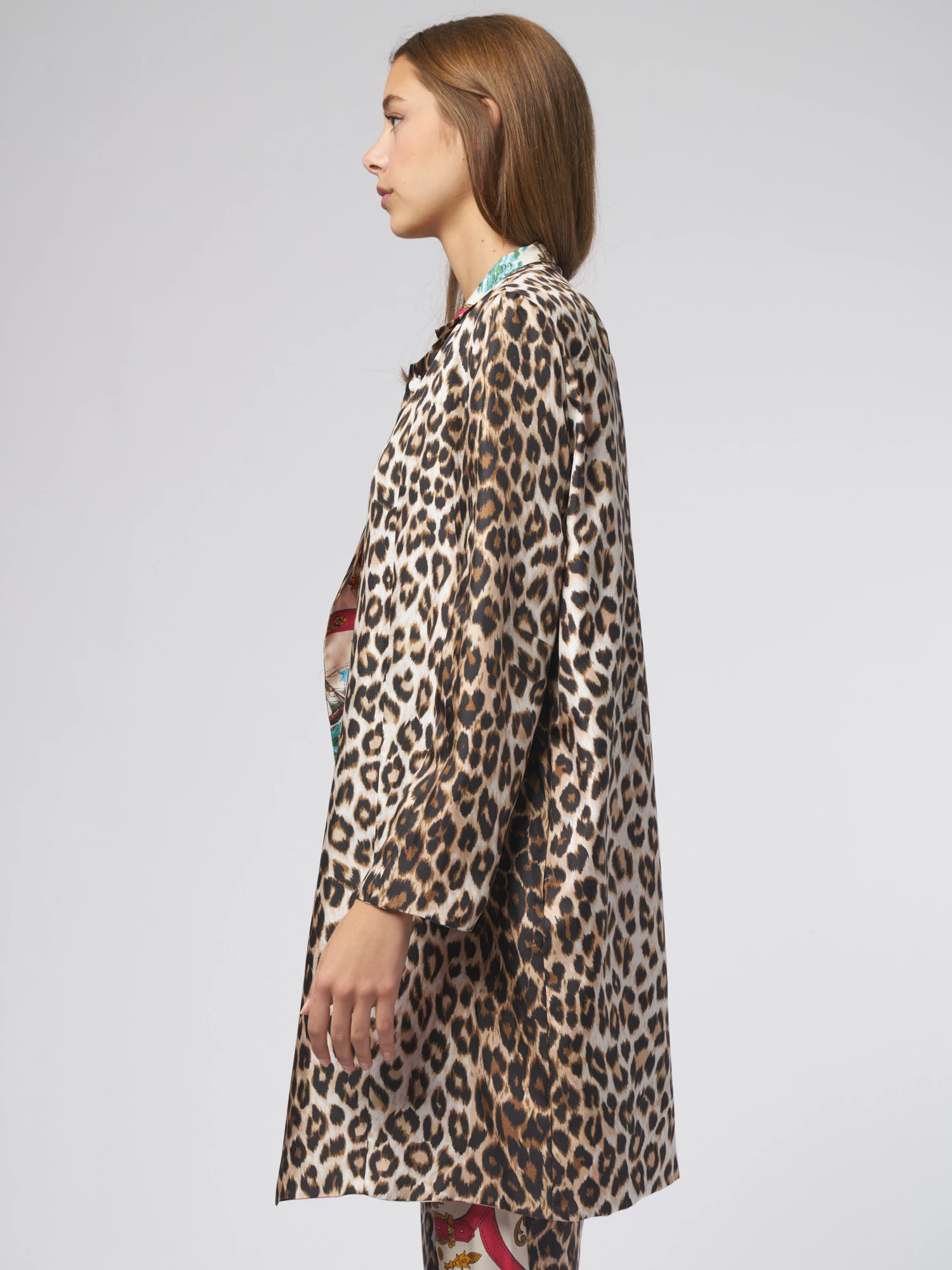 Reversible silk twill trench coat with pockets, one button on the collar. Attachement” and “Panther” prints.