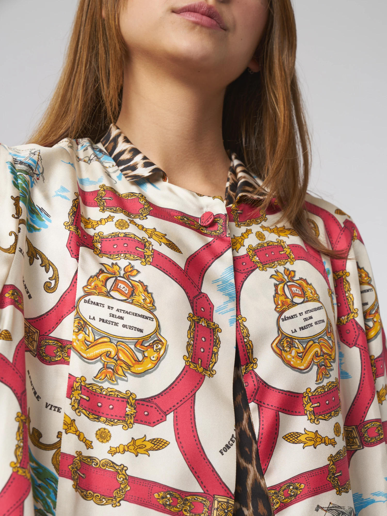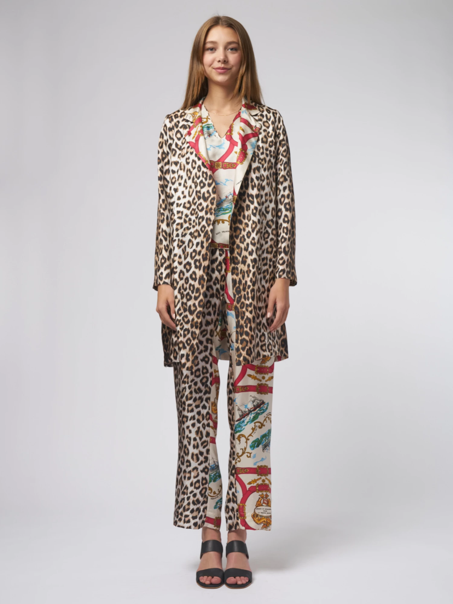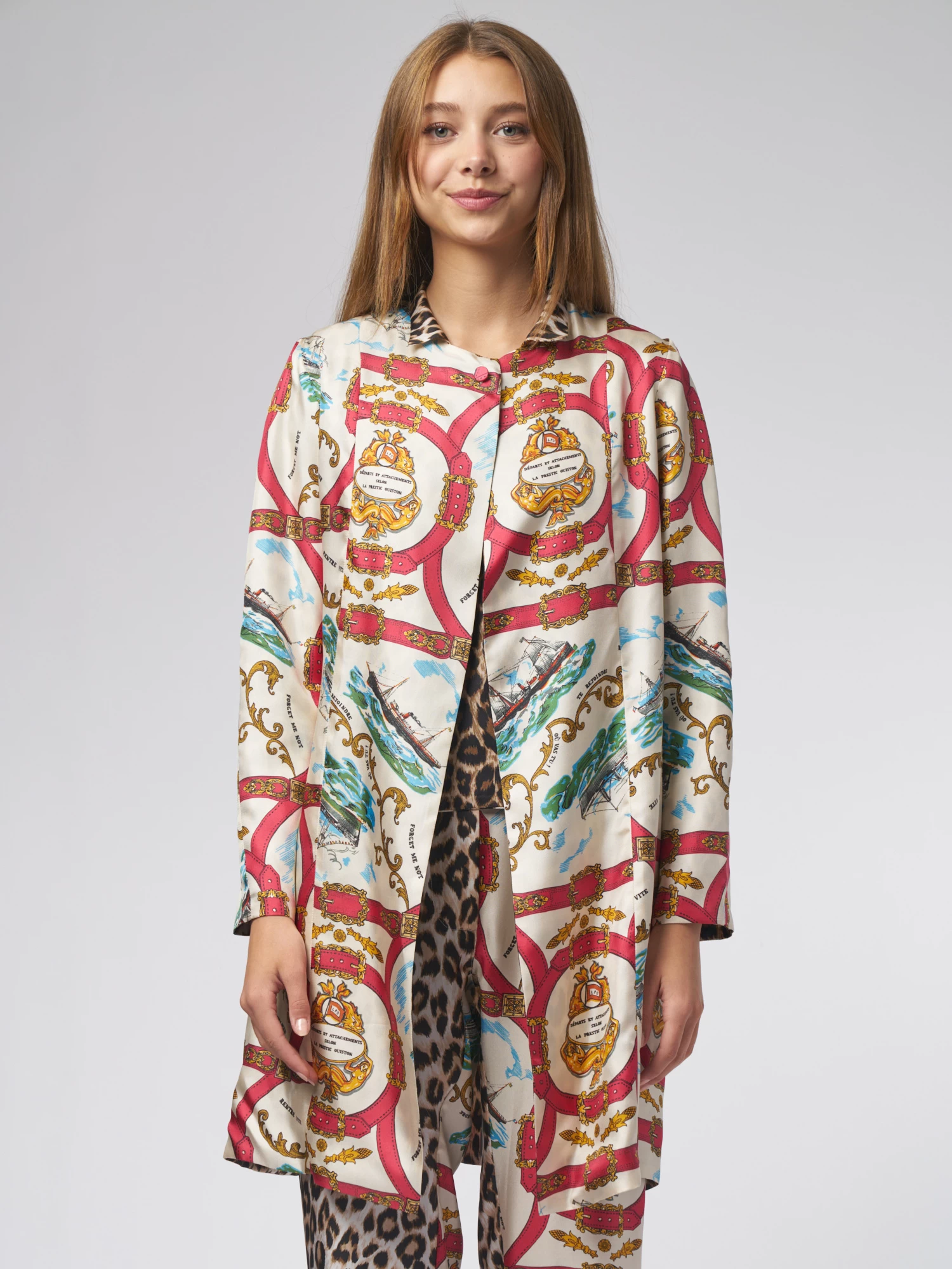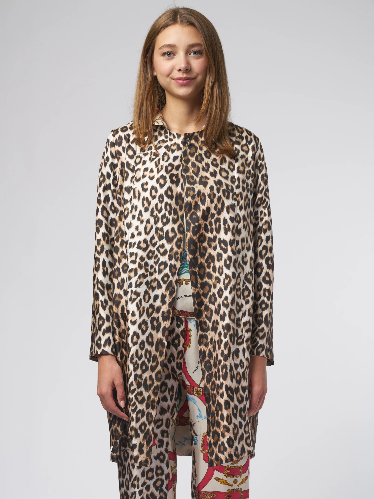 Reversible silk twill trench coat with pockets, one button on the collar. Attachement” and “Panther” prints.