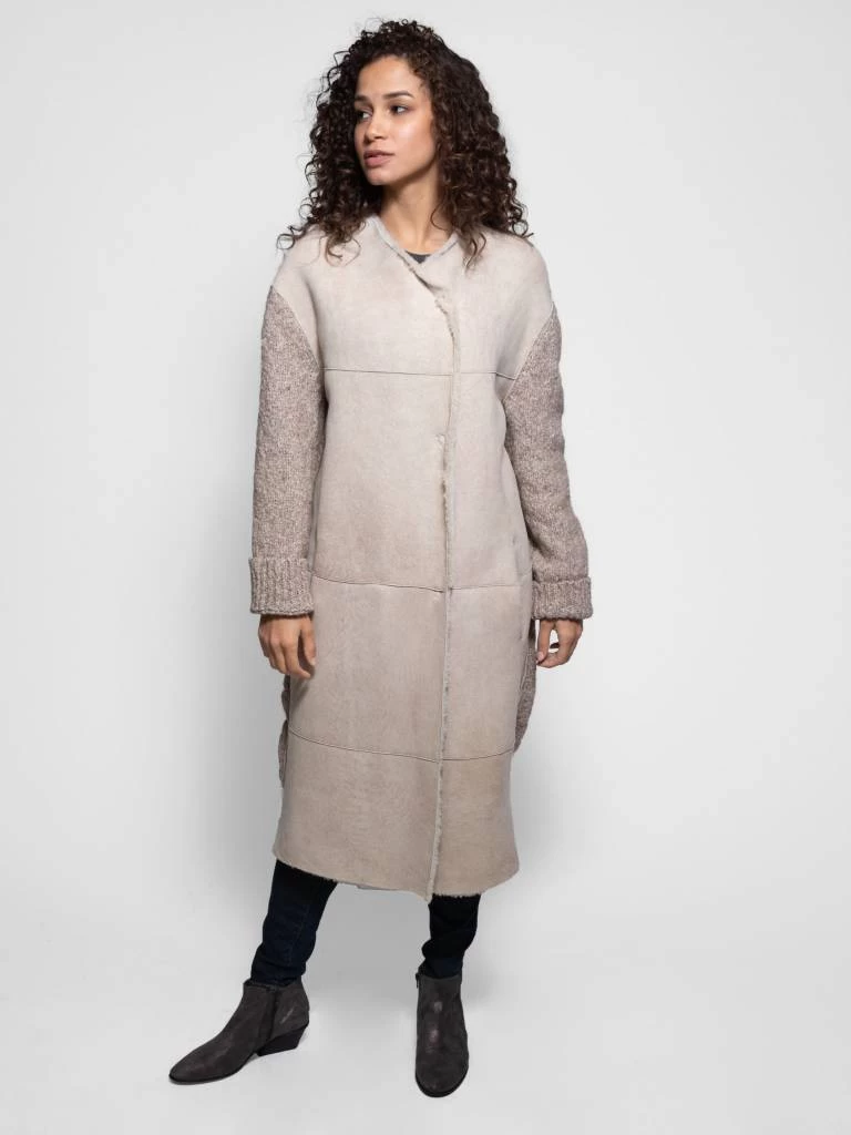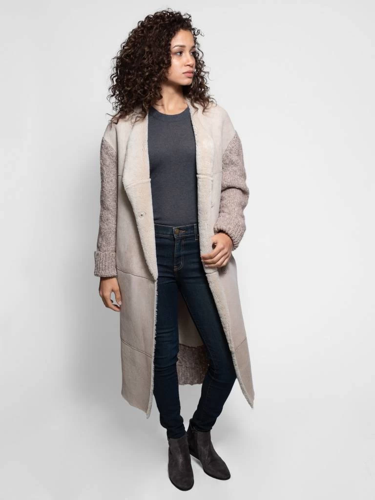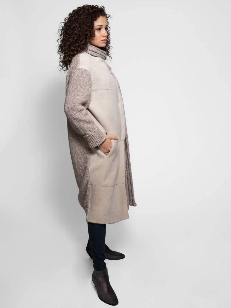 Long sleeve sueded leather coat with shearling inner detail, two front pockets, knit back and sleeves, and knit scarf that can be buttoned in or out at neckline.