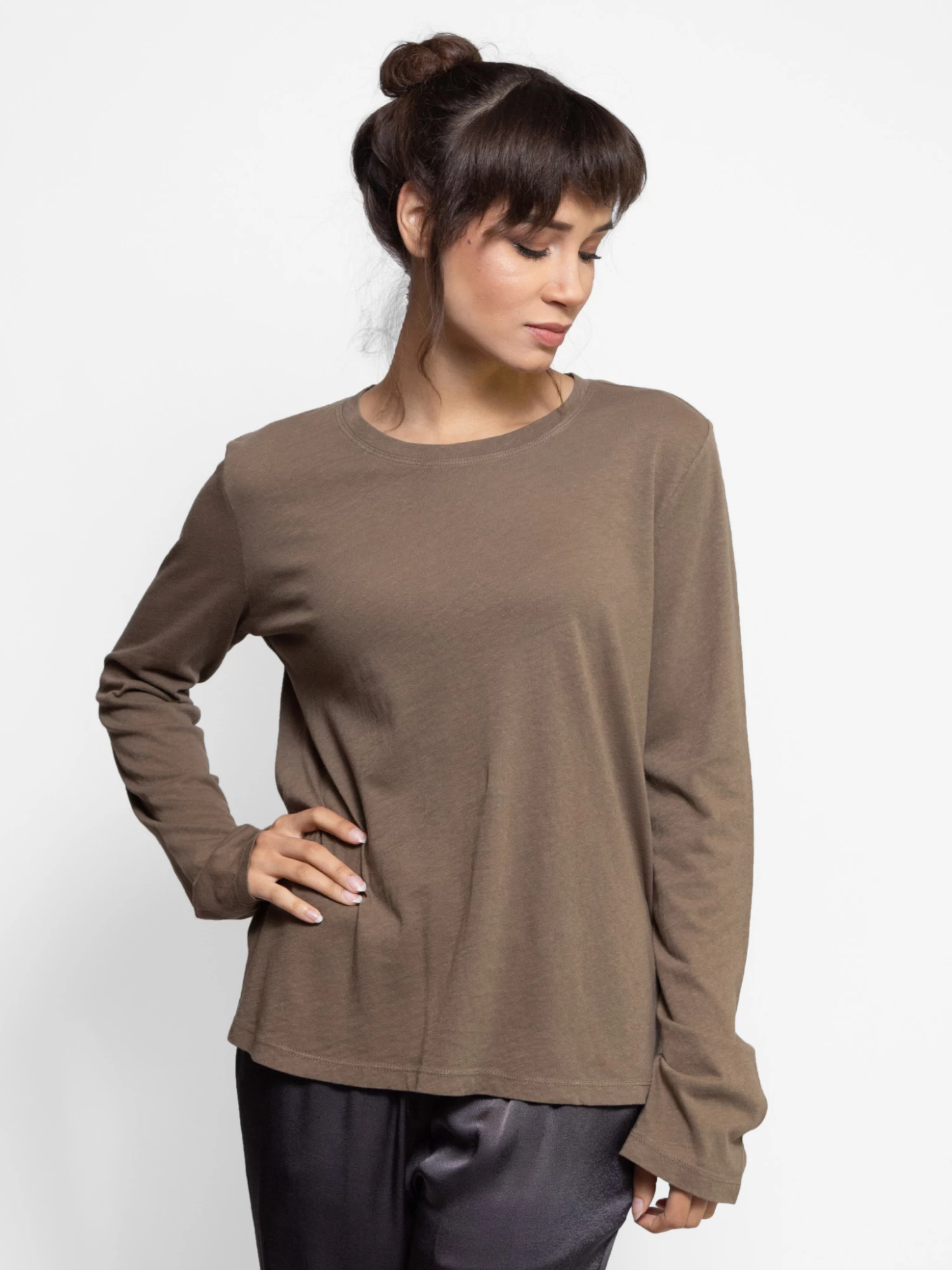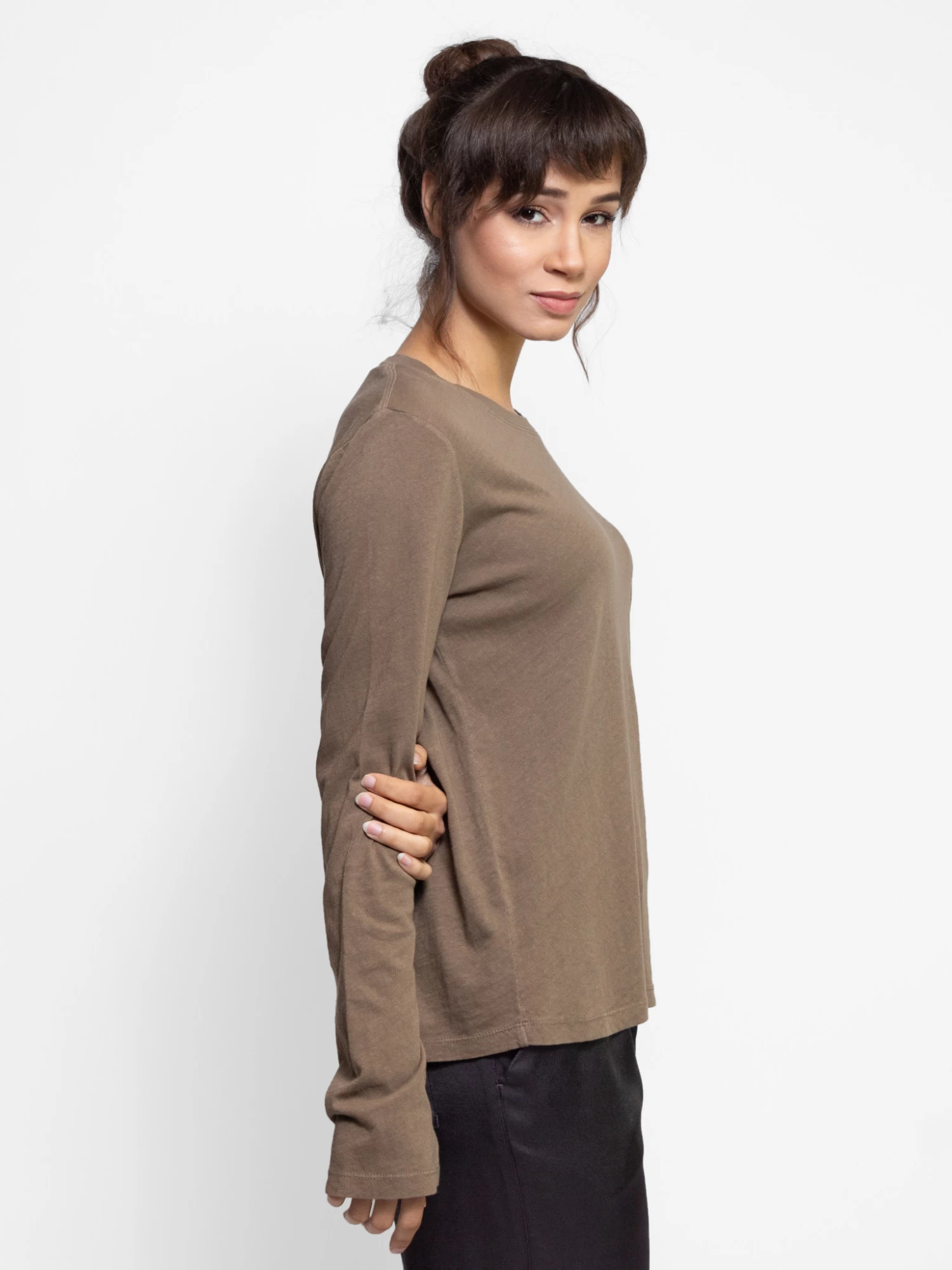 A long sleeve crew neck tee in a muted army green nubby cotton jersey.