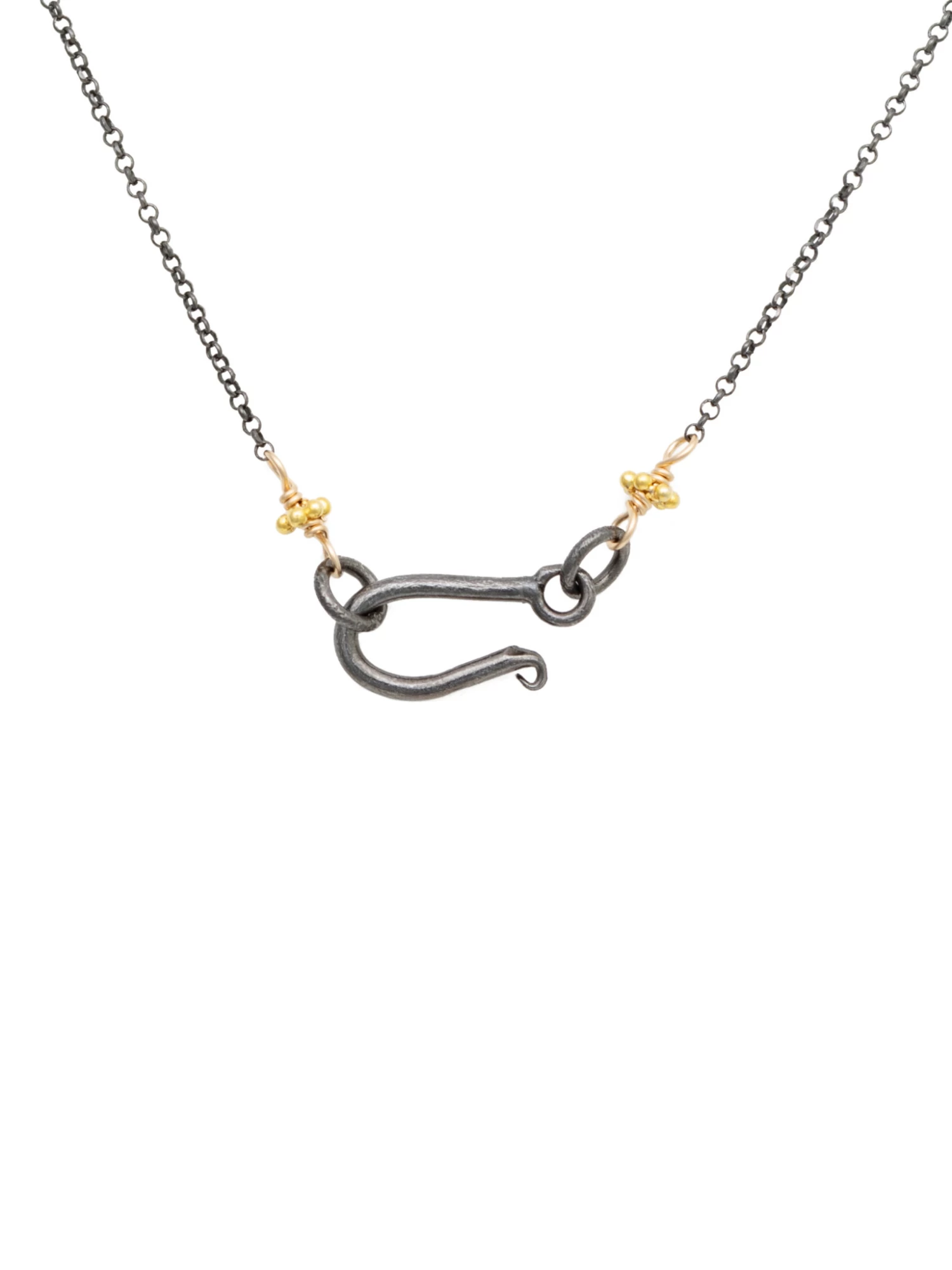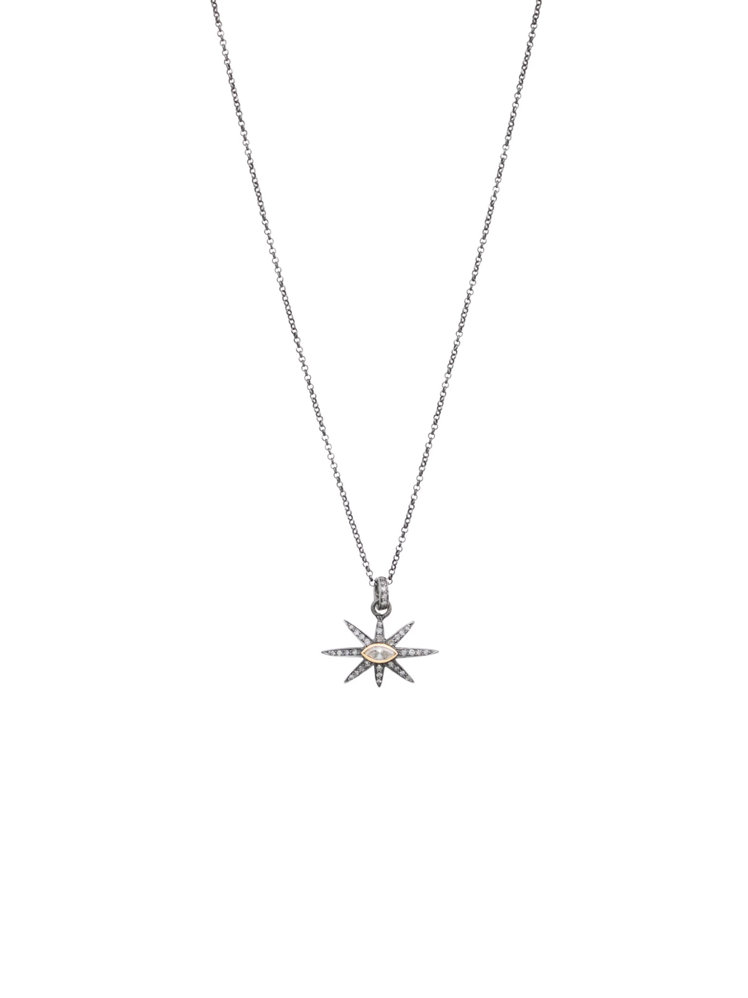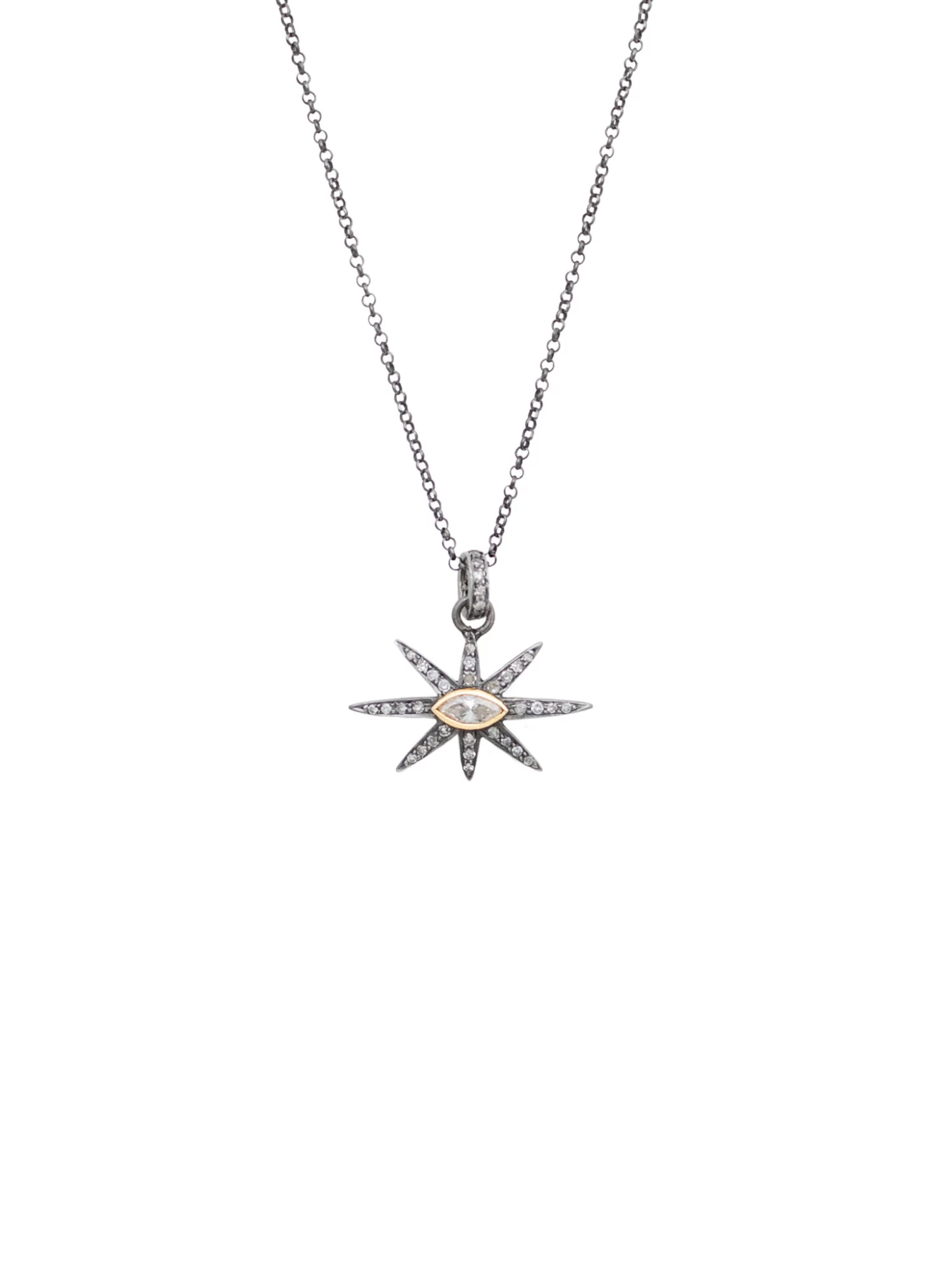 A silver pendant necklace features a gold set marquise shaped diamond within a champagne pave diamond eight point star and a hook and eye clasp.