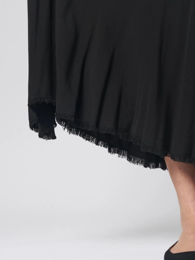 Flowy tea-length skirt with an elastic waist features an asymmetrical hem fringe finish detail and hidden pockets