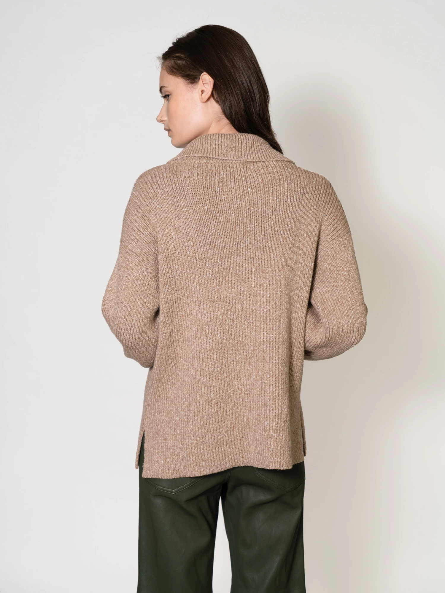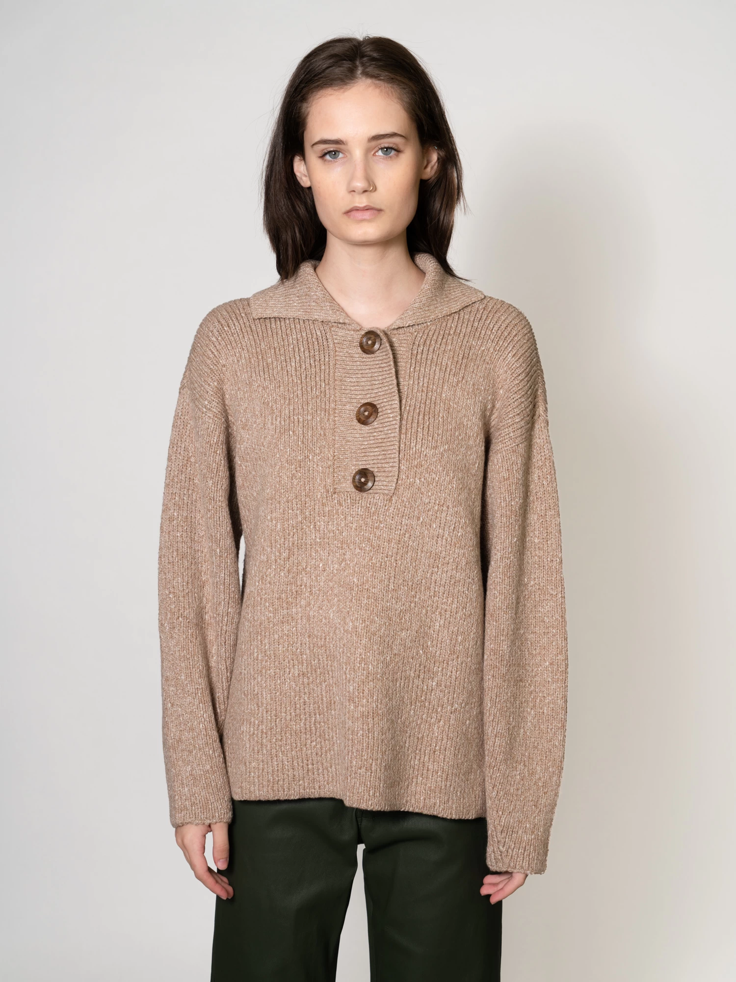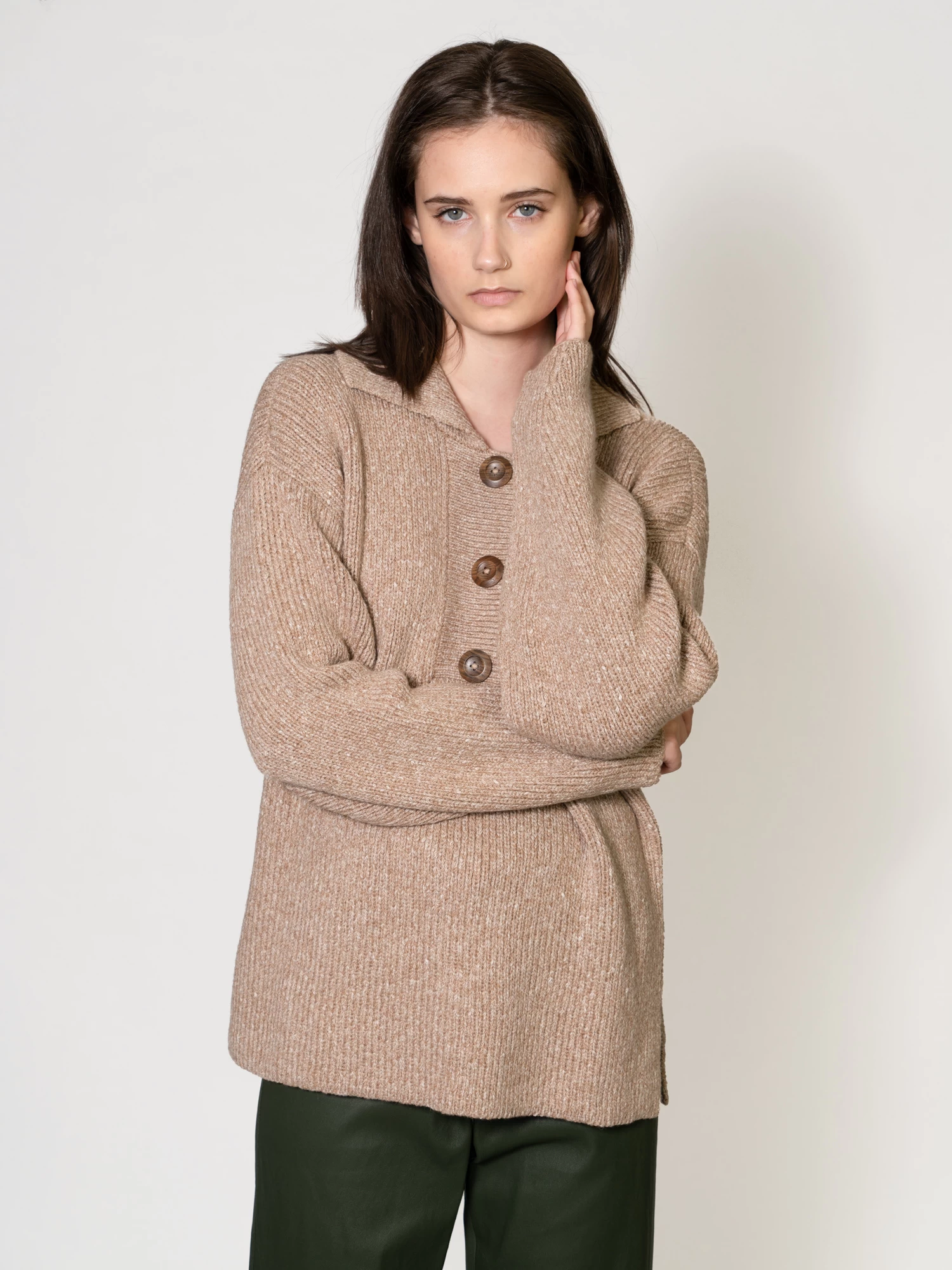 Relaxed fit knit from botanically-dyed yarn has a flat collar, wooden button closure, and drop shoulder sleeves.