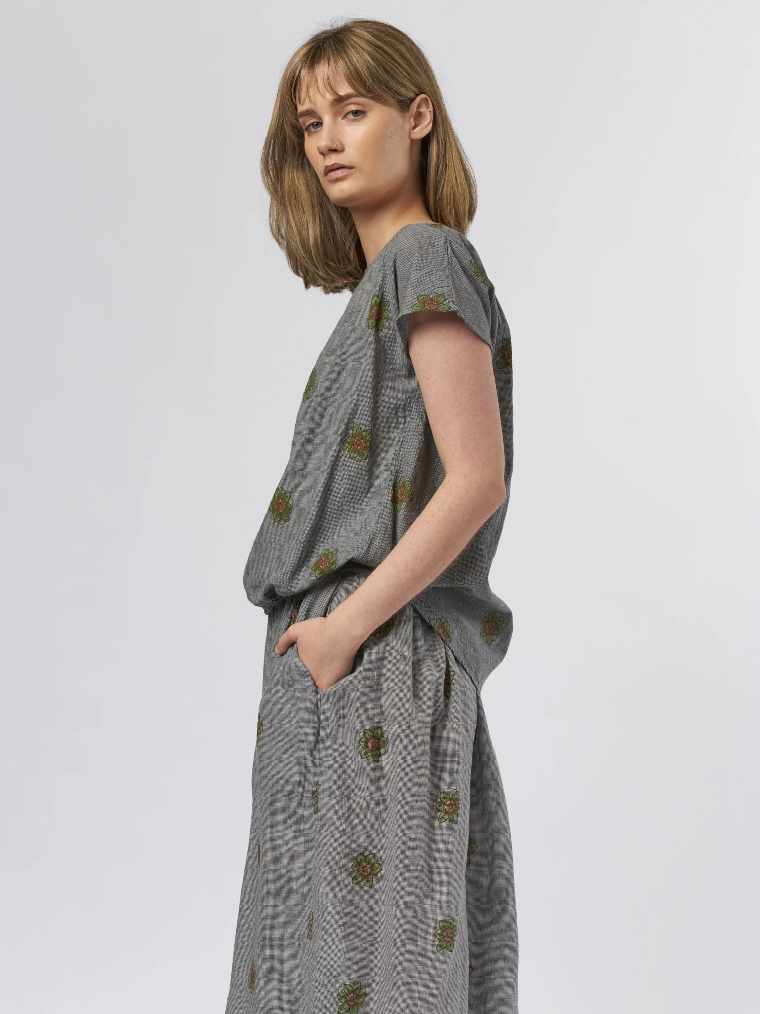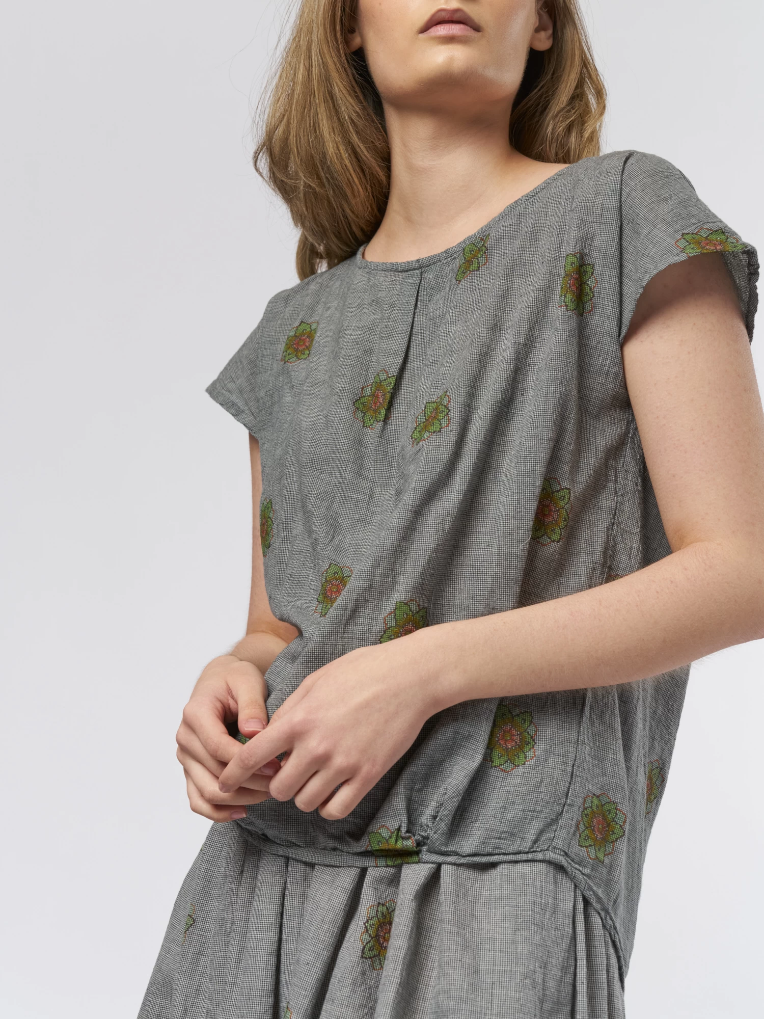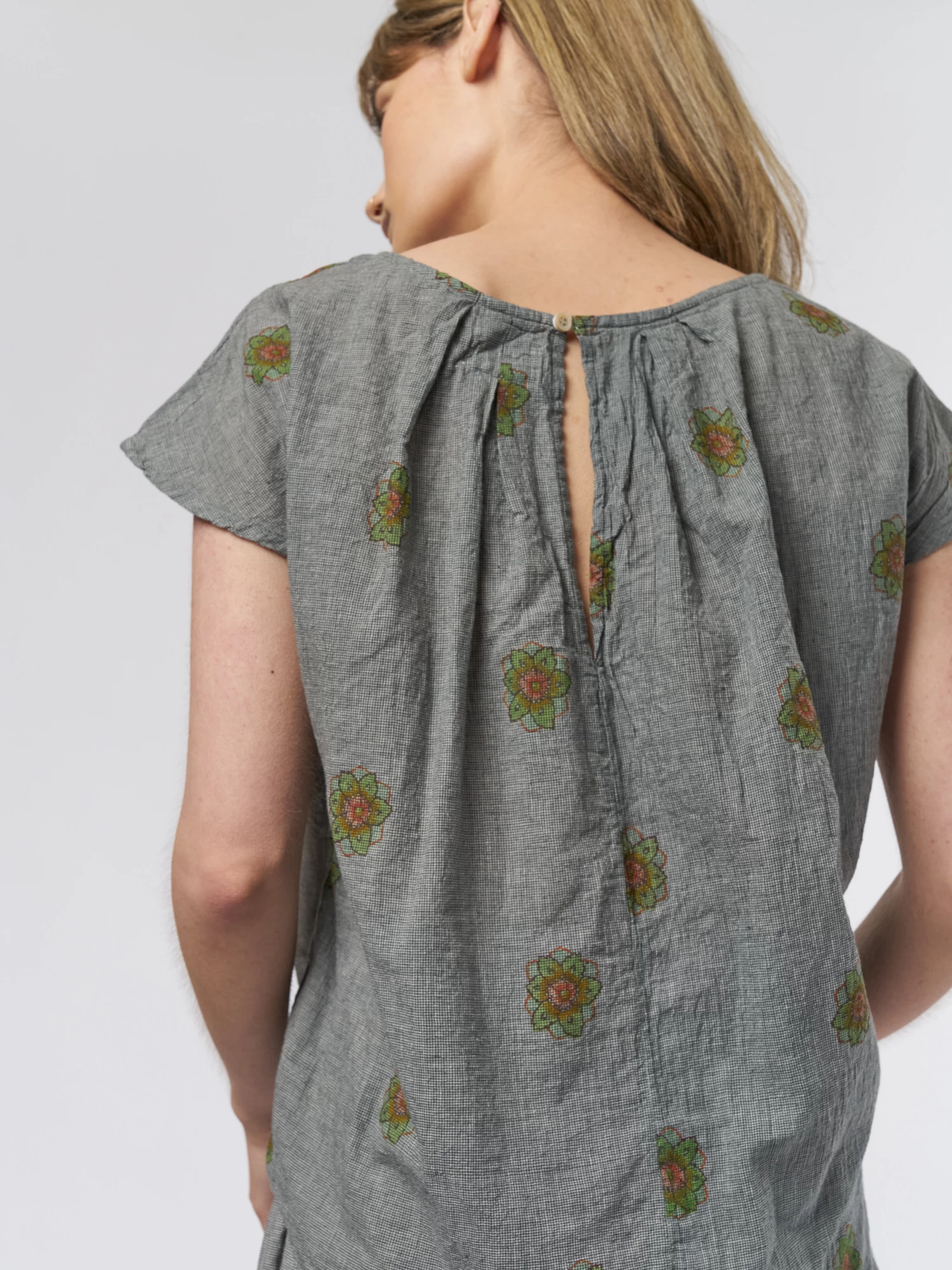 The Khadi Cotton shirt in Masa has short sleeves, a round neck with pleats in the front, and a little button in the back.