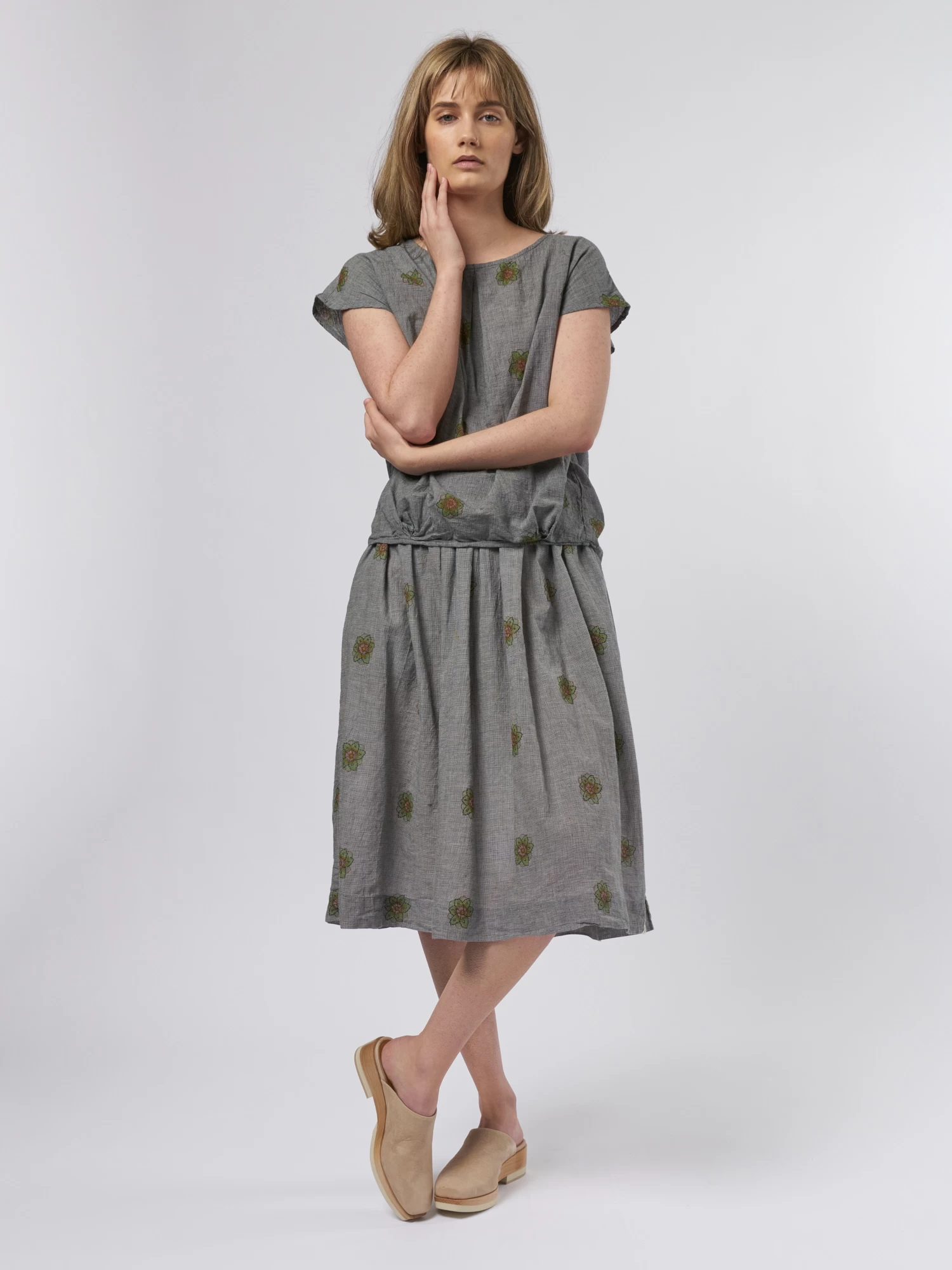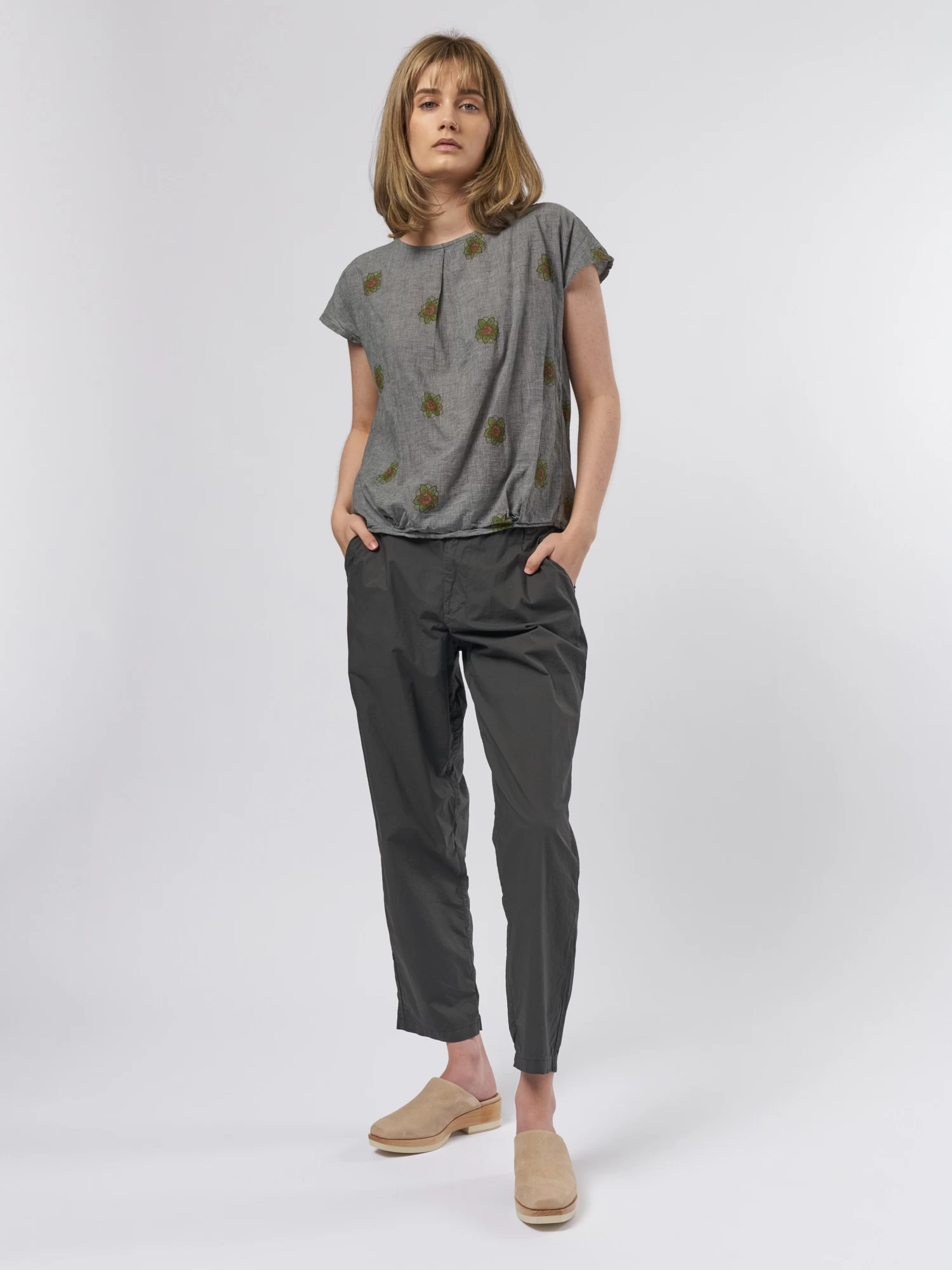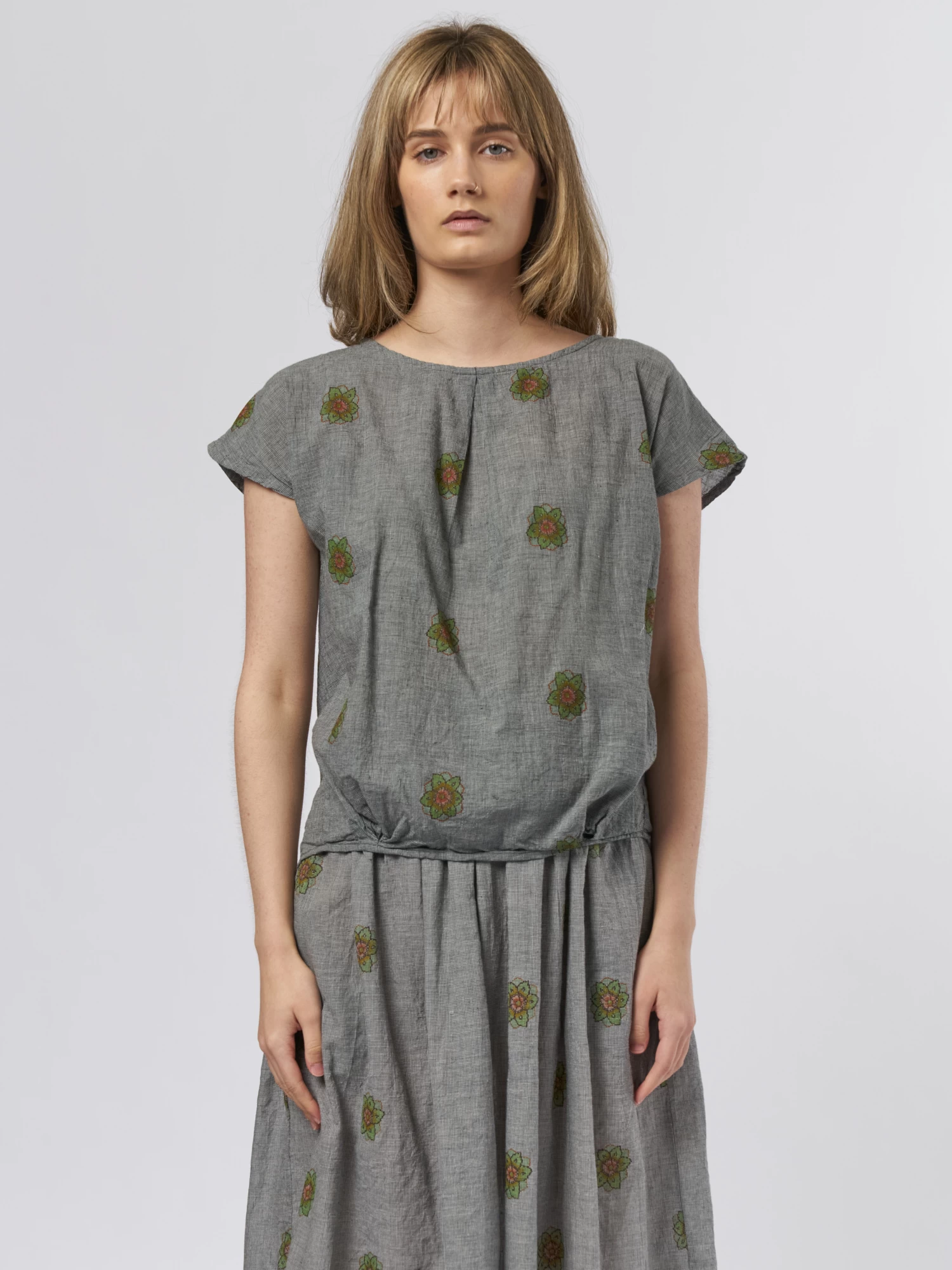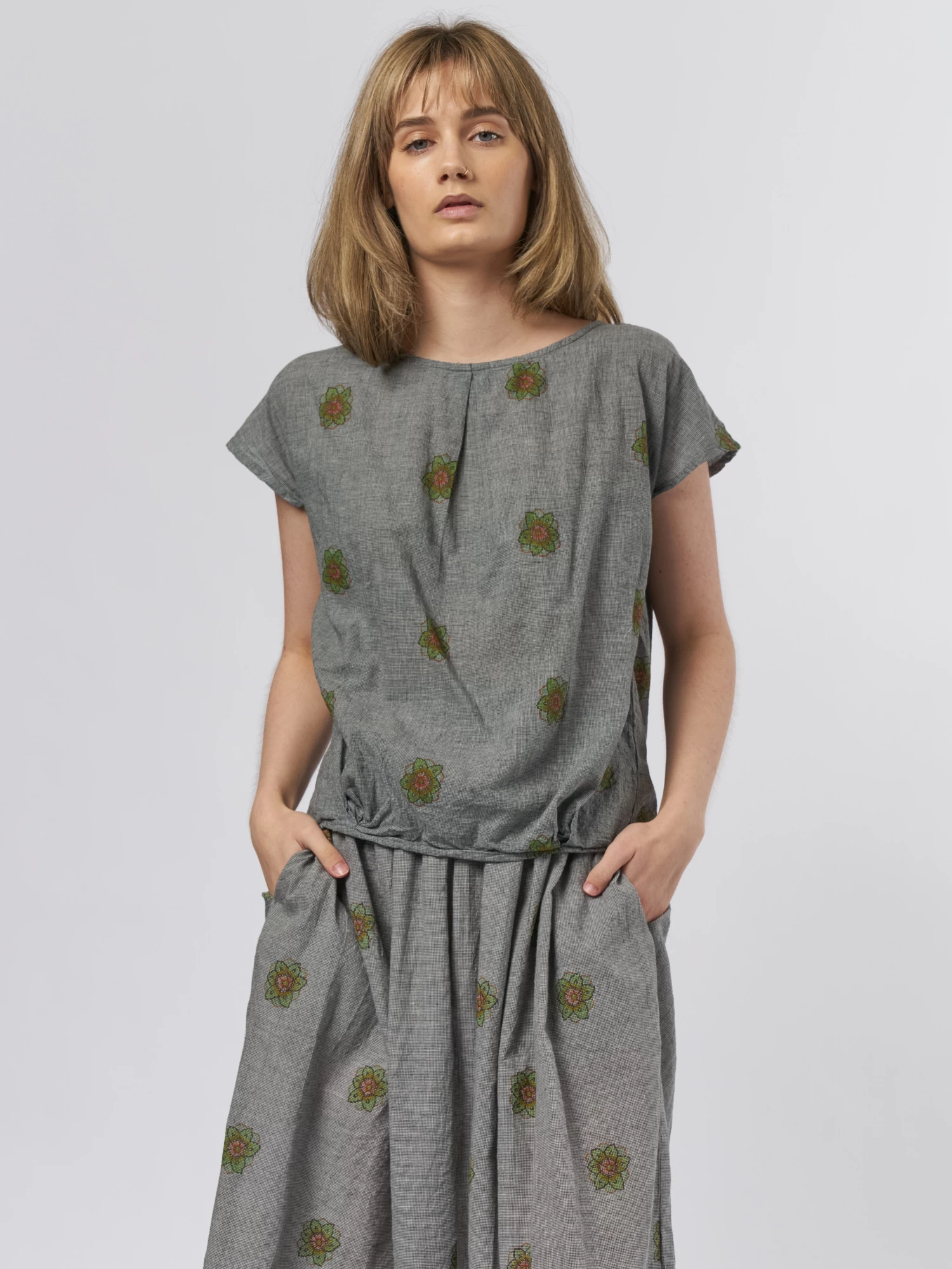 The Khadi Cotton shirt in Masa has short sleeves, a round neck with pleats in the front, and a little button in the back.