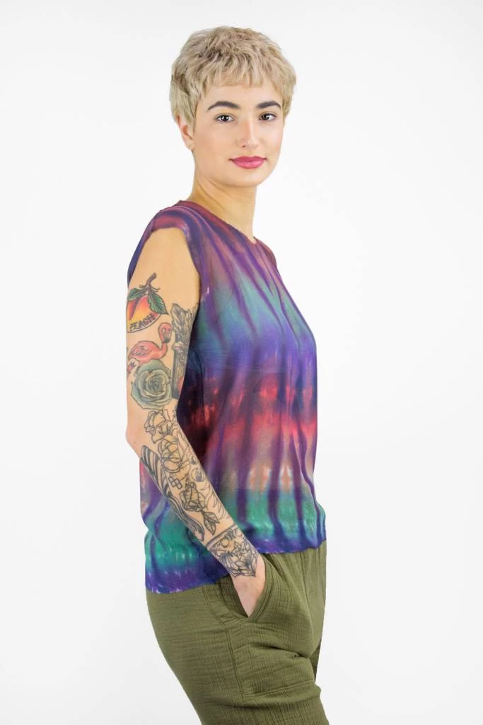 A sleeveless muscle tee featuring rainbow tie dye and soft raw hems.