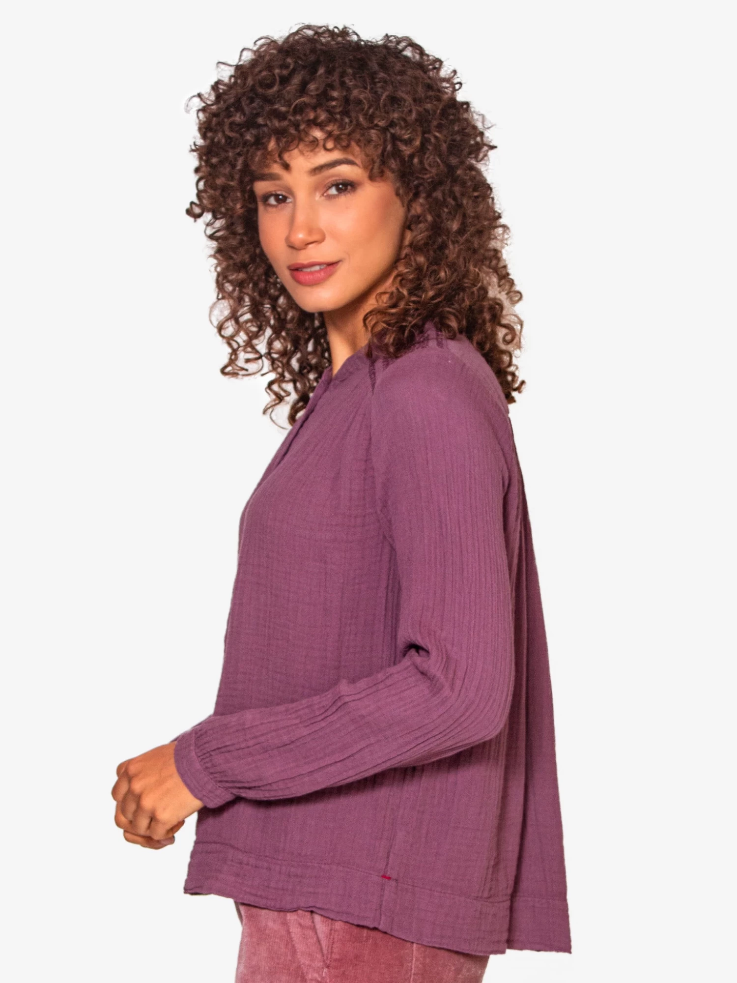 Comfortable top with stunning shoulder details, a button neckline, and long sleeves.