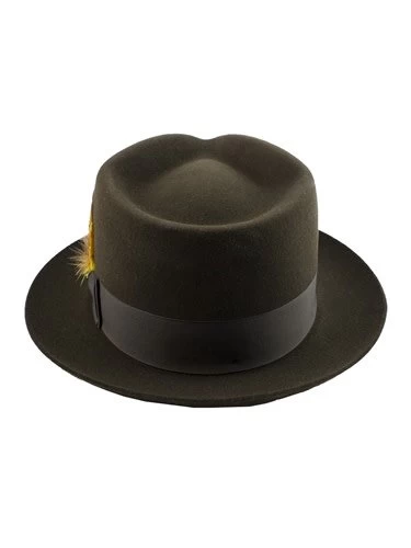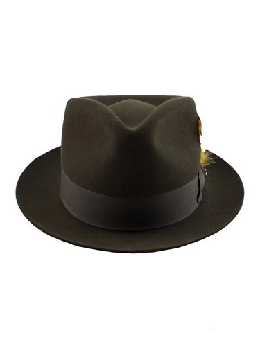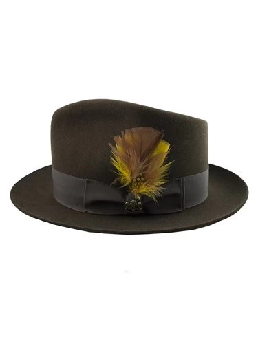 Structured water resistant wool felt hat with ribbon band and side feather detail.