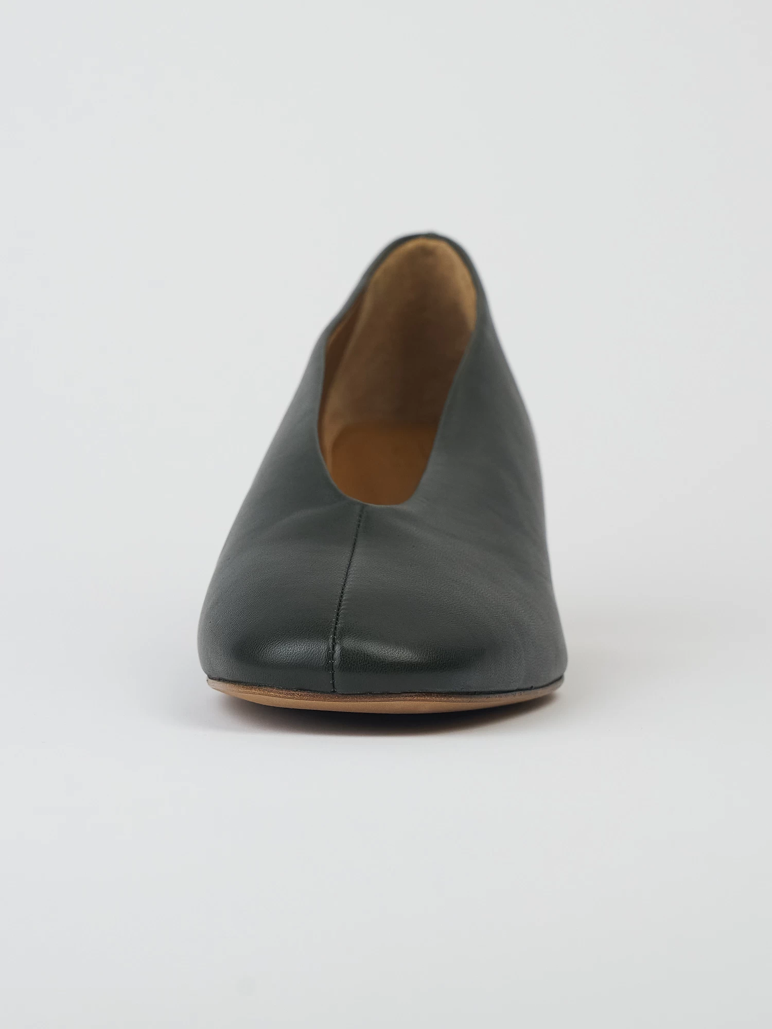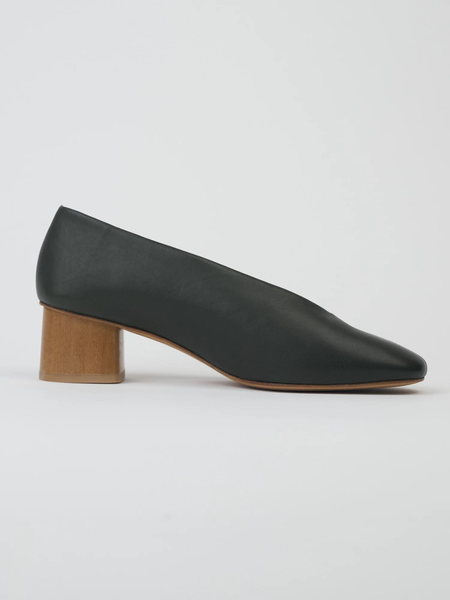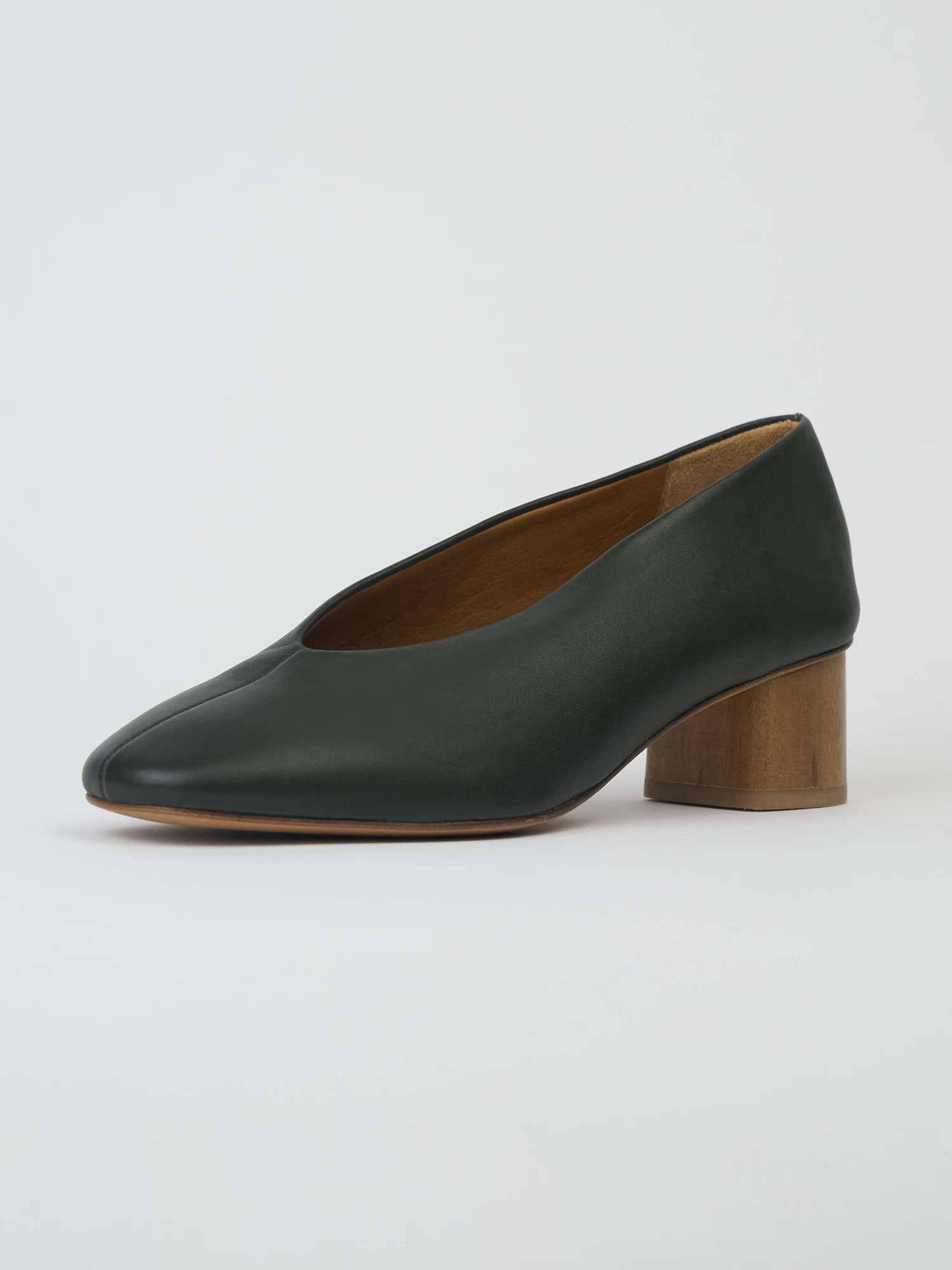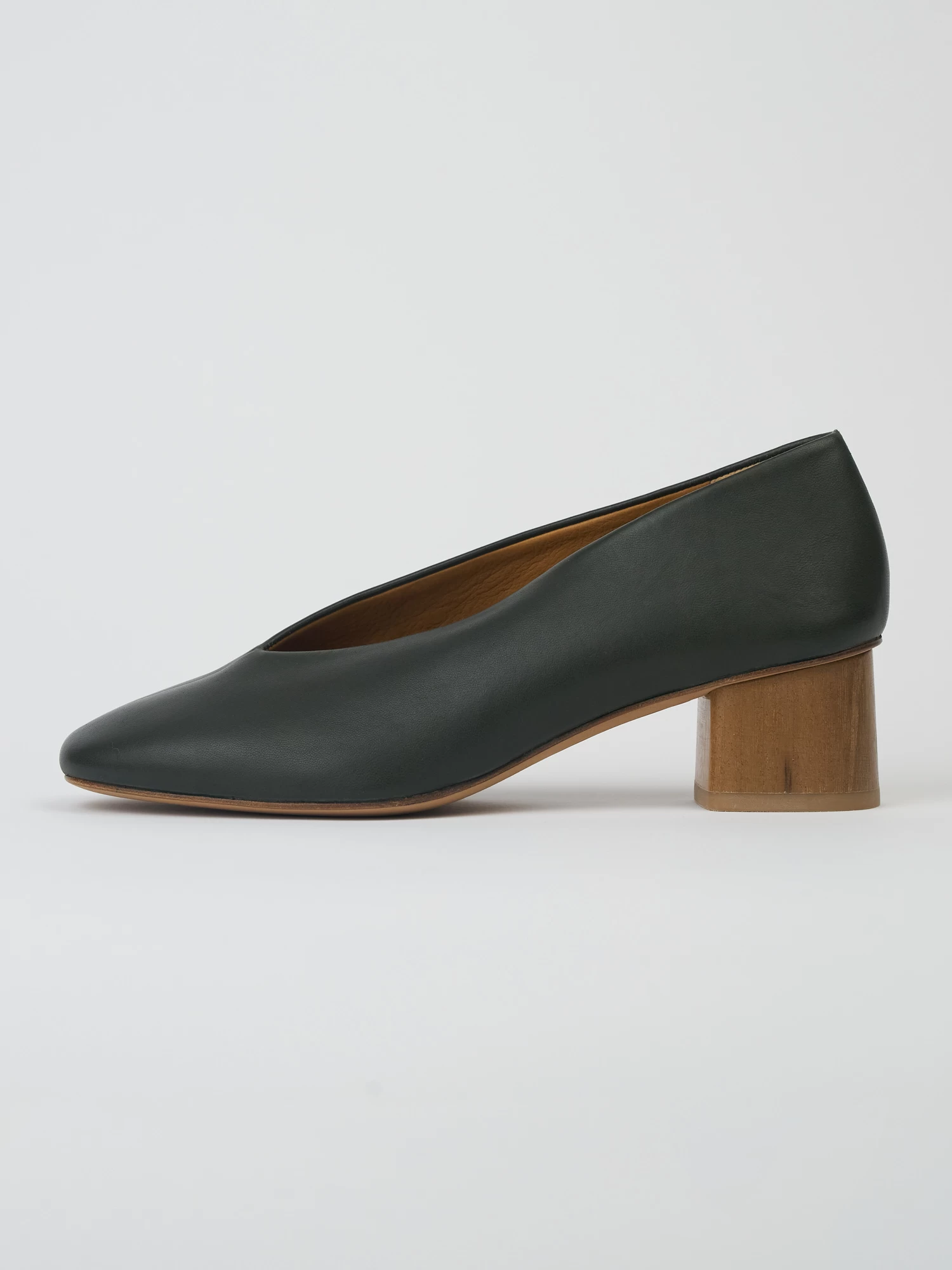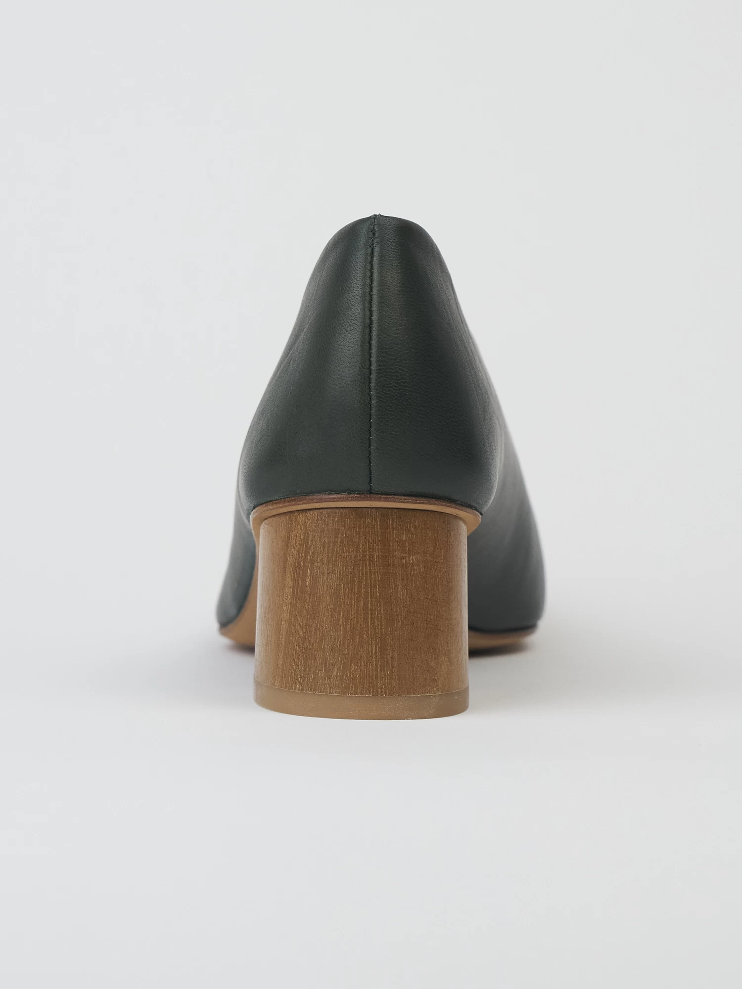 High vamped, sweetheart-cut, mid-heel pump in the prettiest deep green leather with seam detail and solid wood heel.