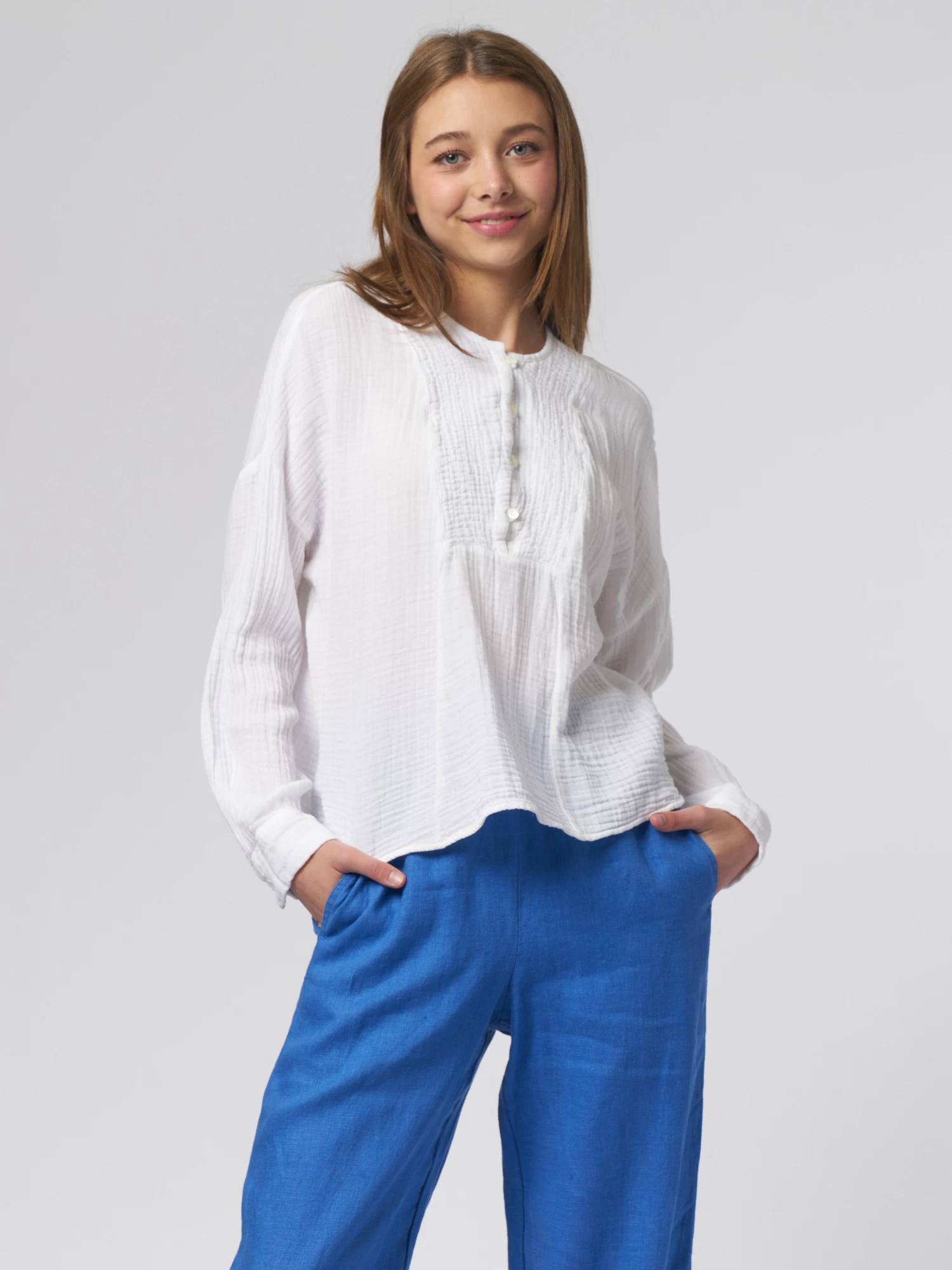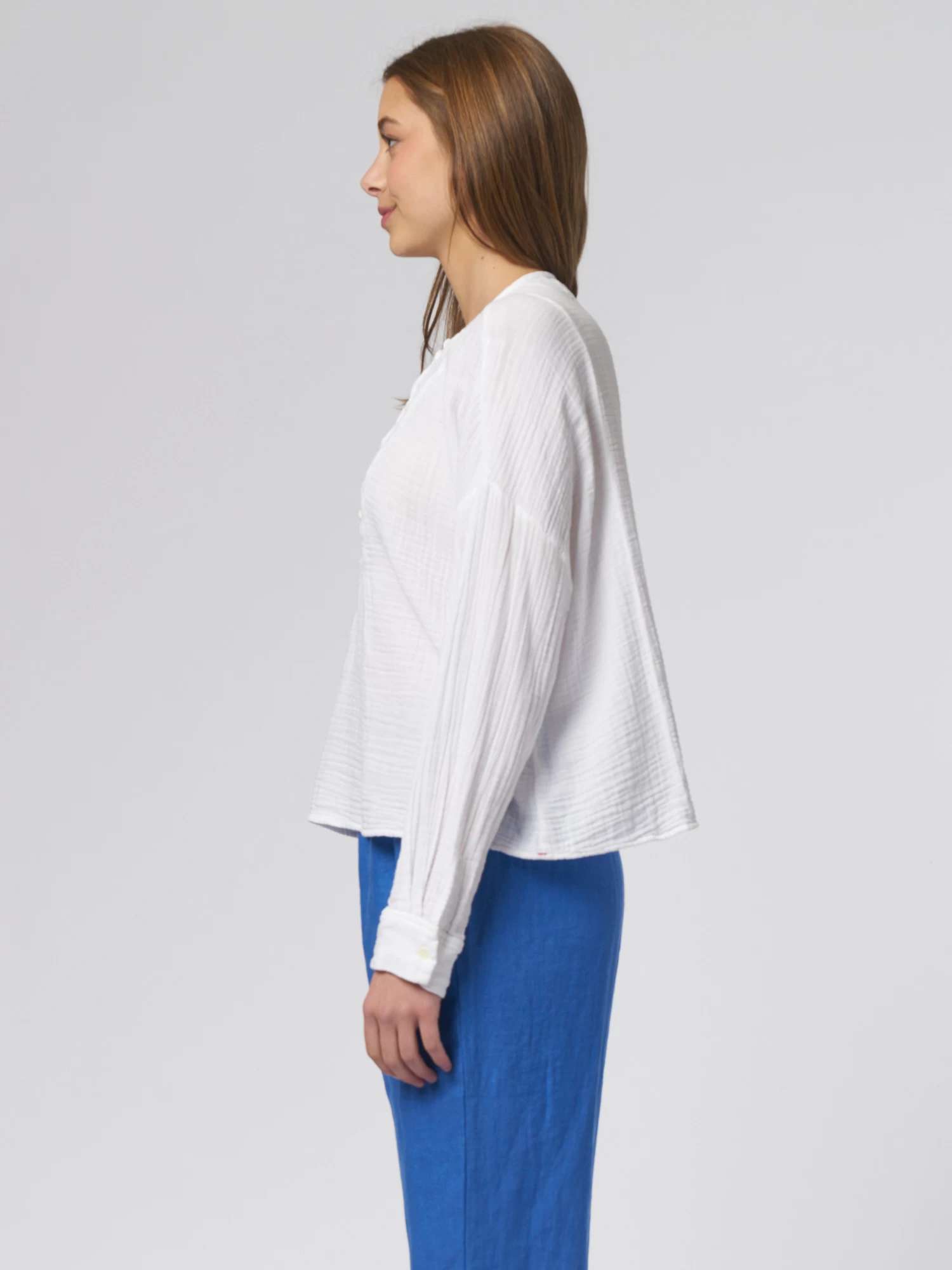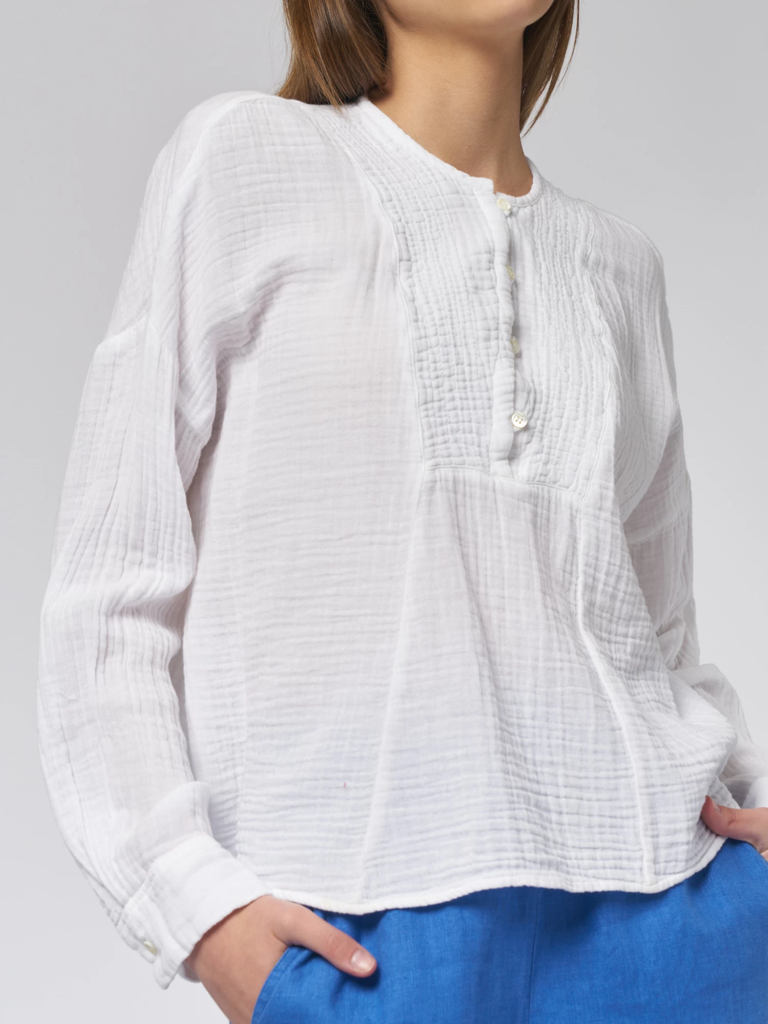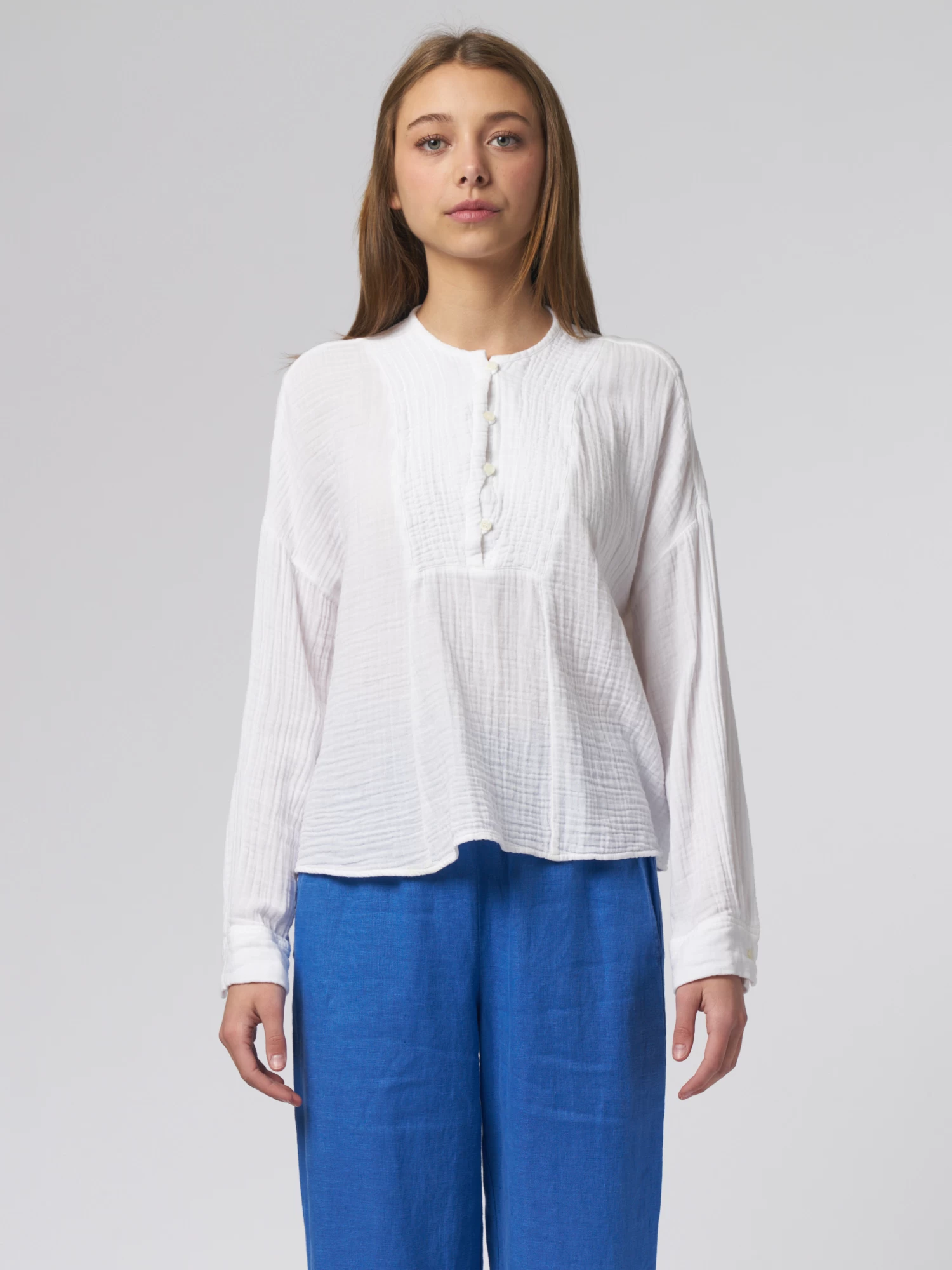 Cotton gauze, henley button-front top with a band collar, slightly blouson sleeves with button cuff.