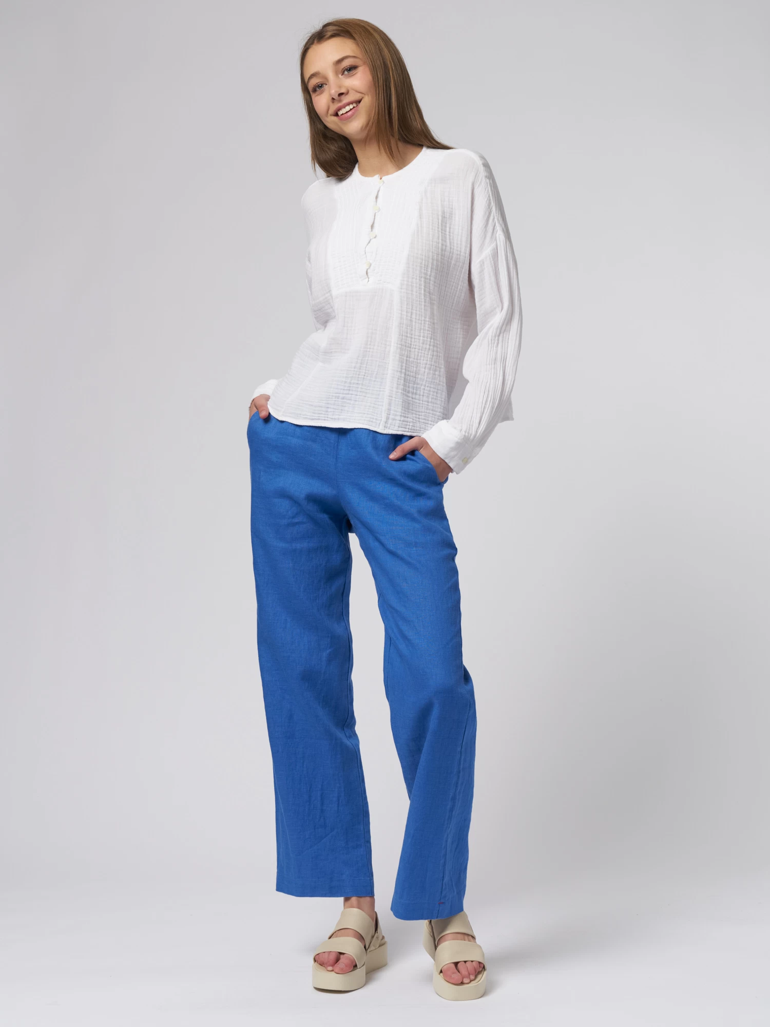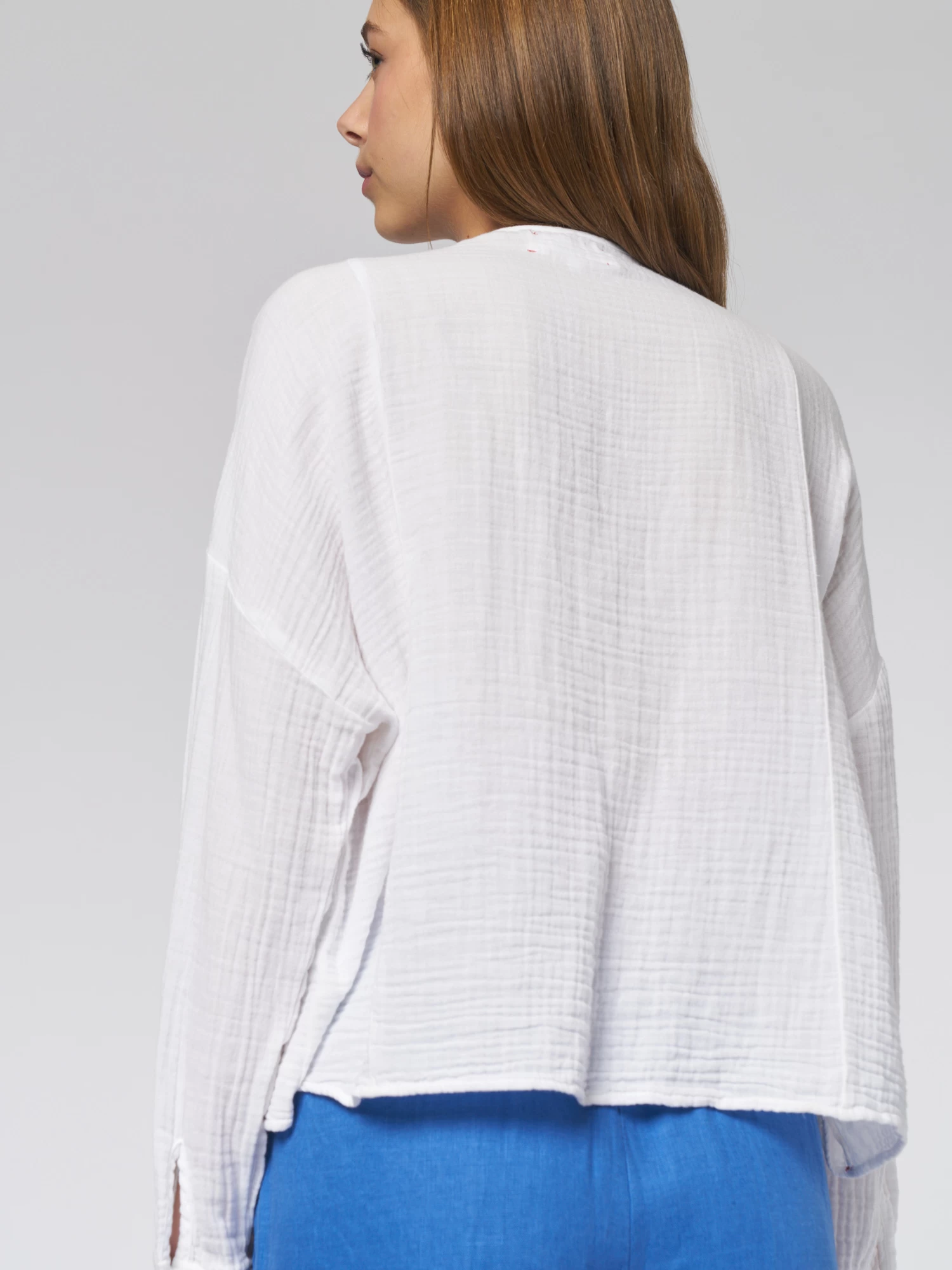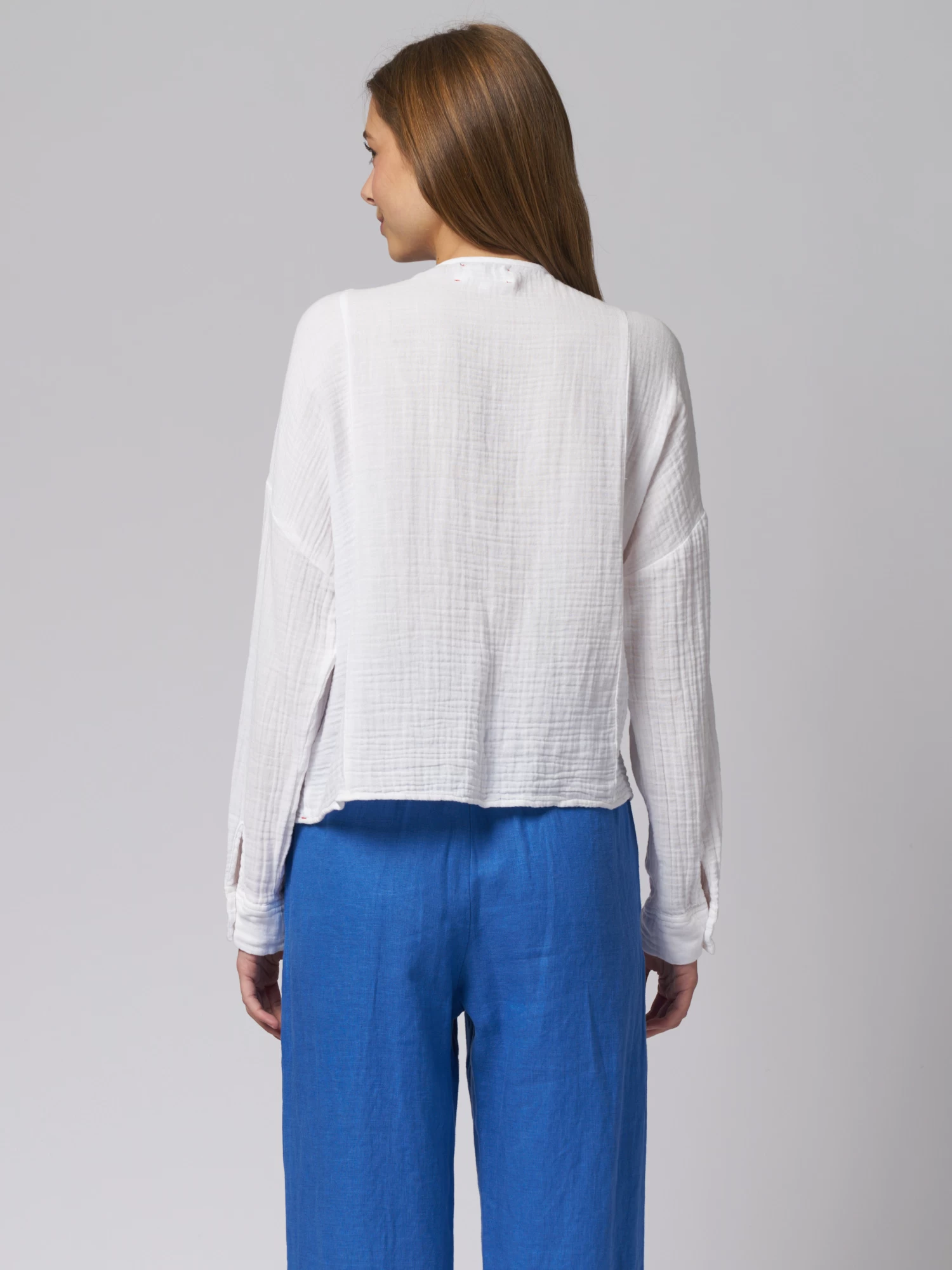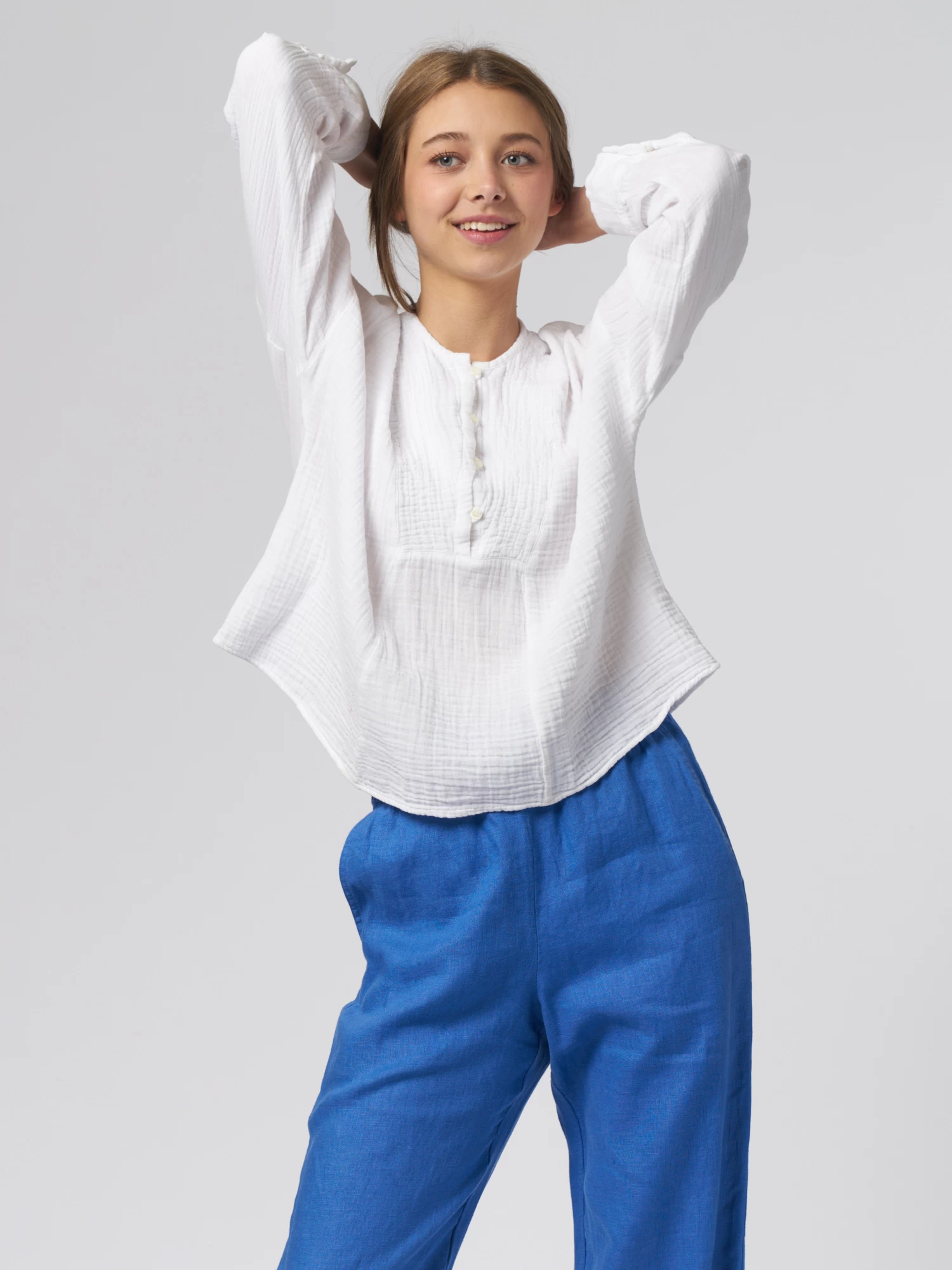 Cotton gauze, henley button-front top with a band collar, slightly blouson sleeves with button cuff.