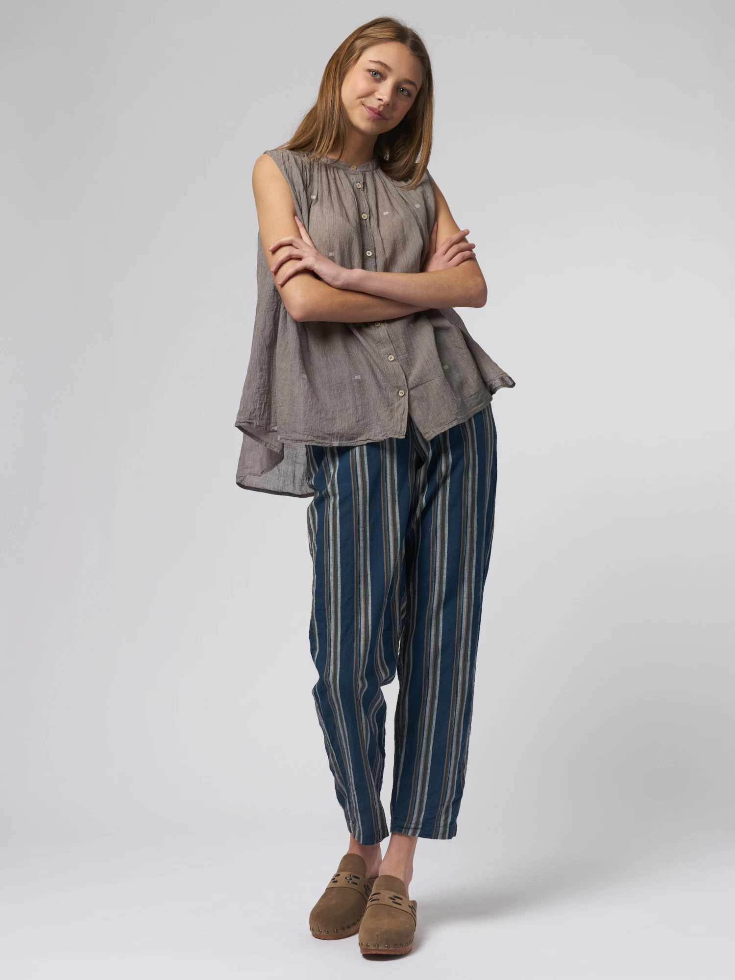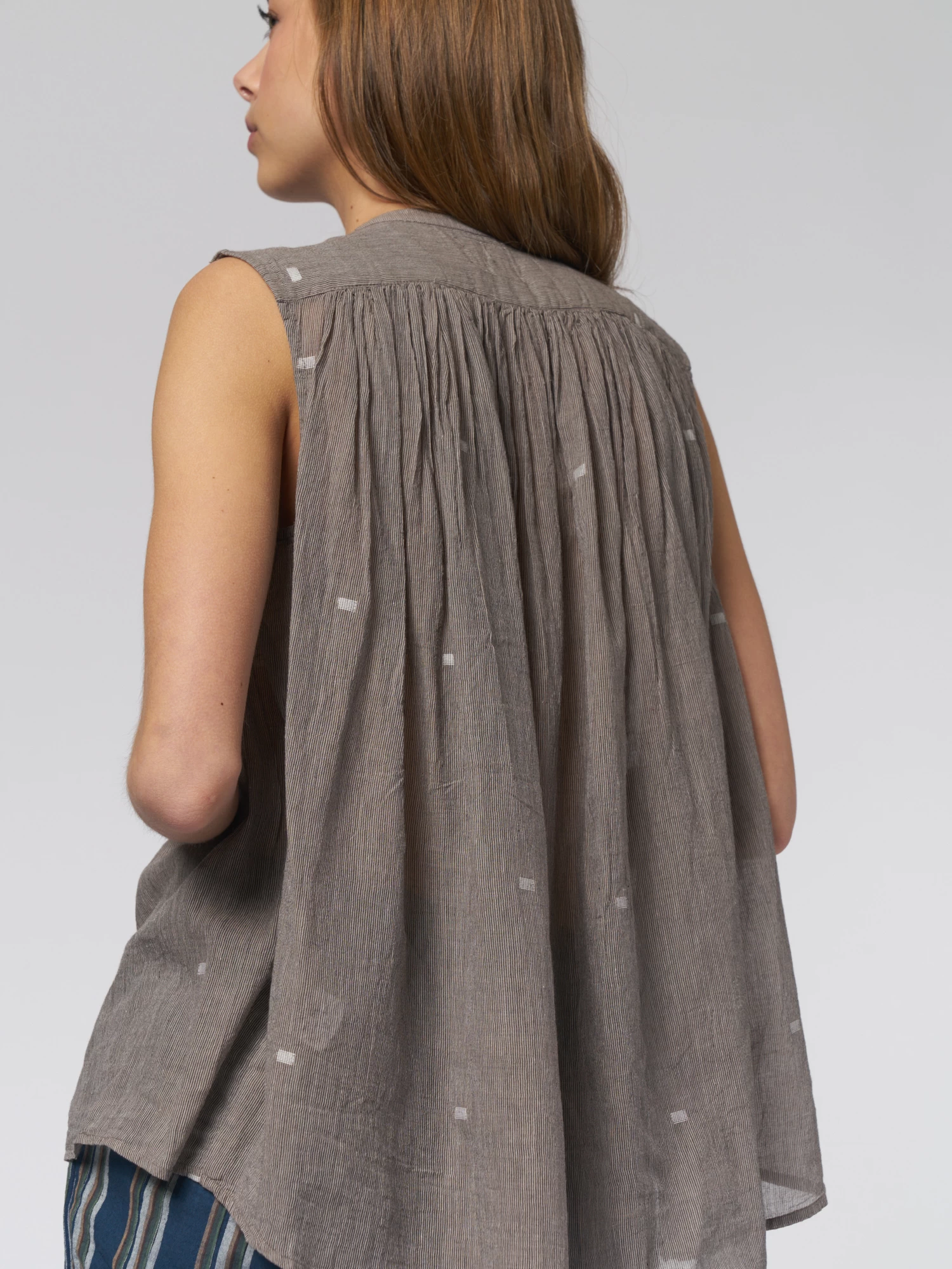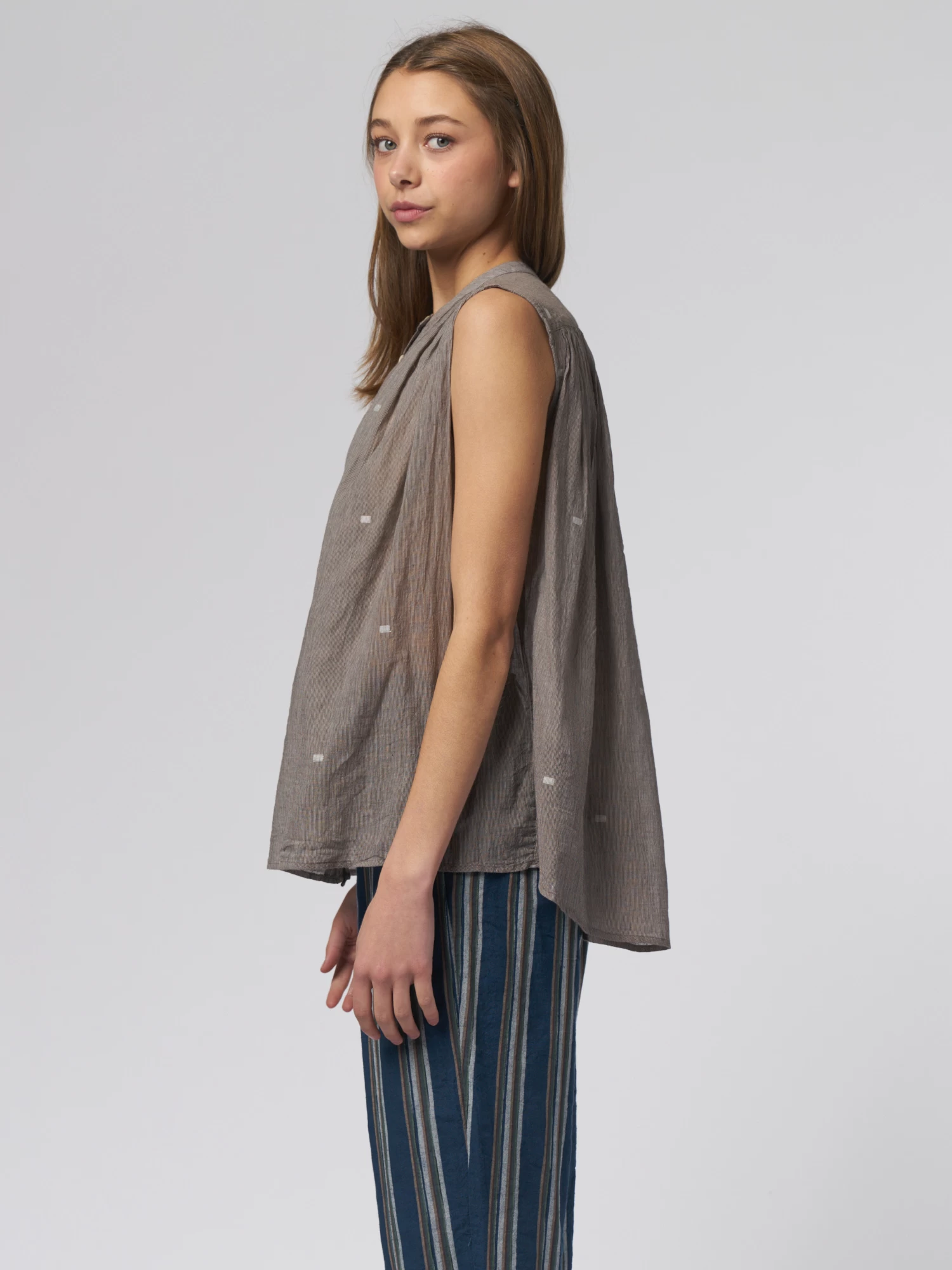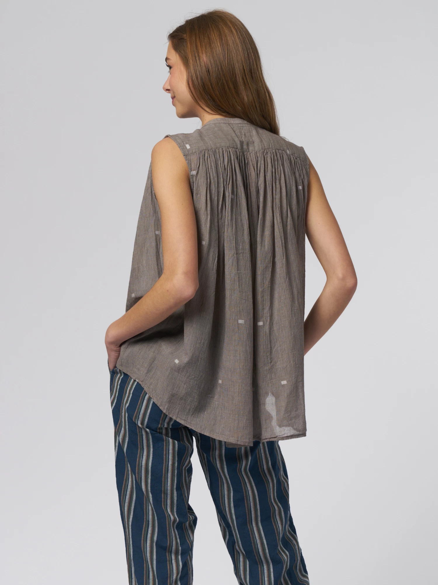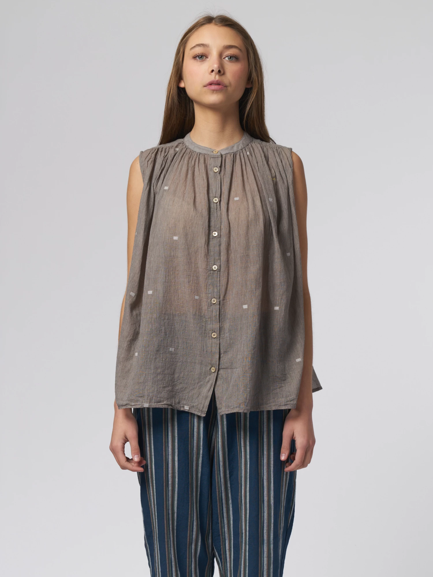Sleeveless Travis’s Embroidered cotton shirt with a button front in a loose bodice