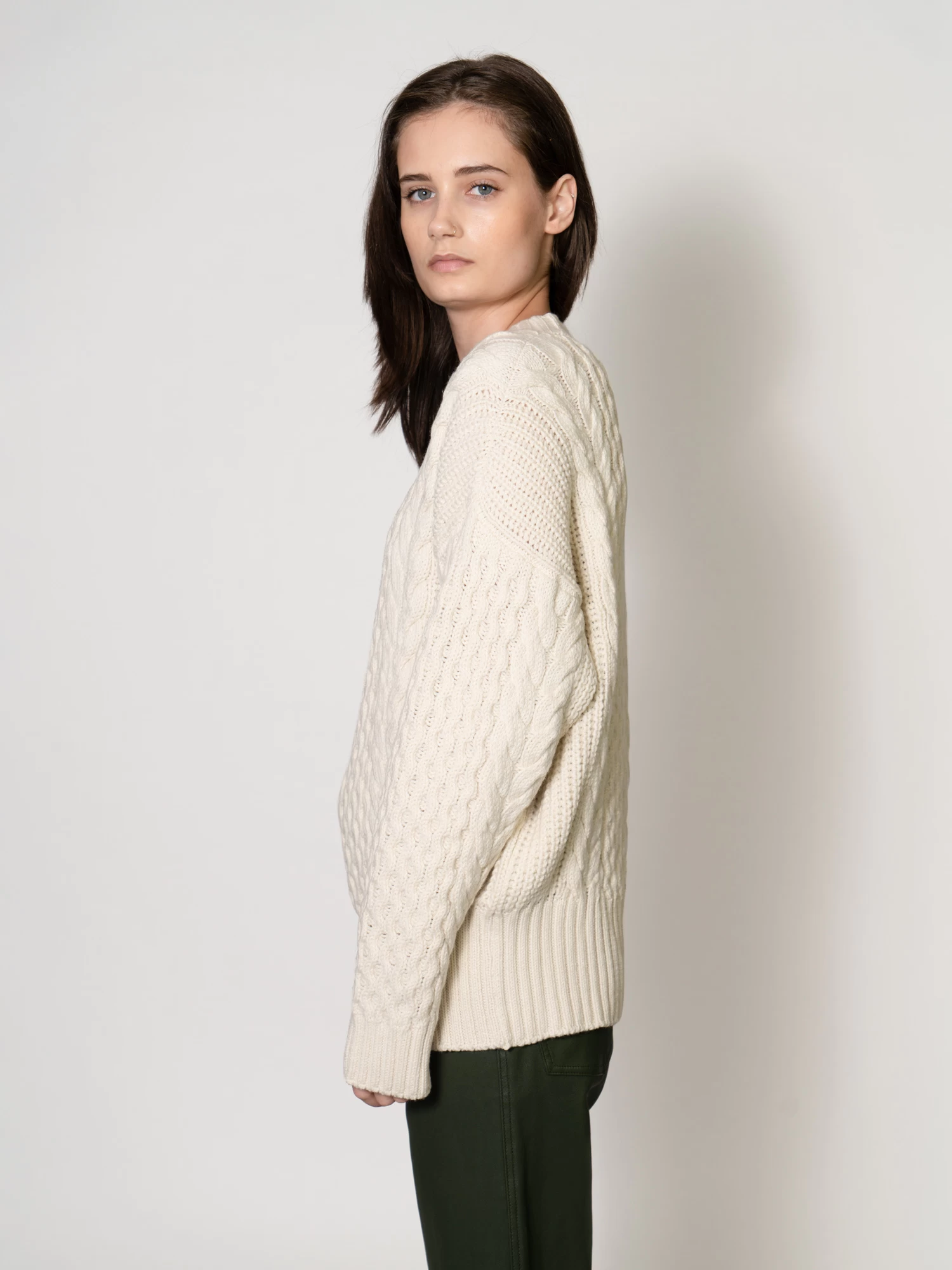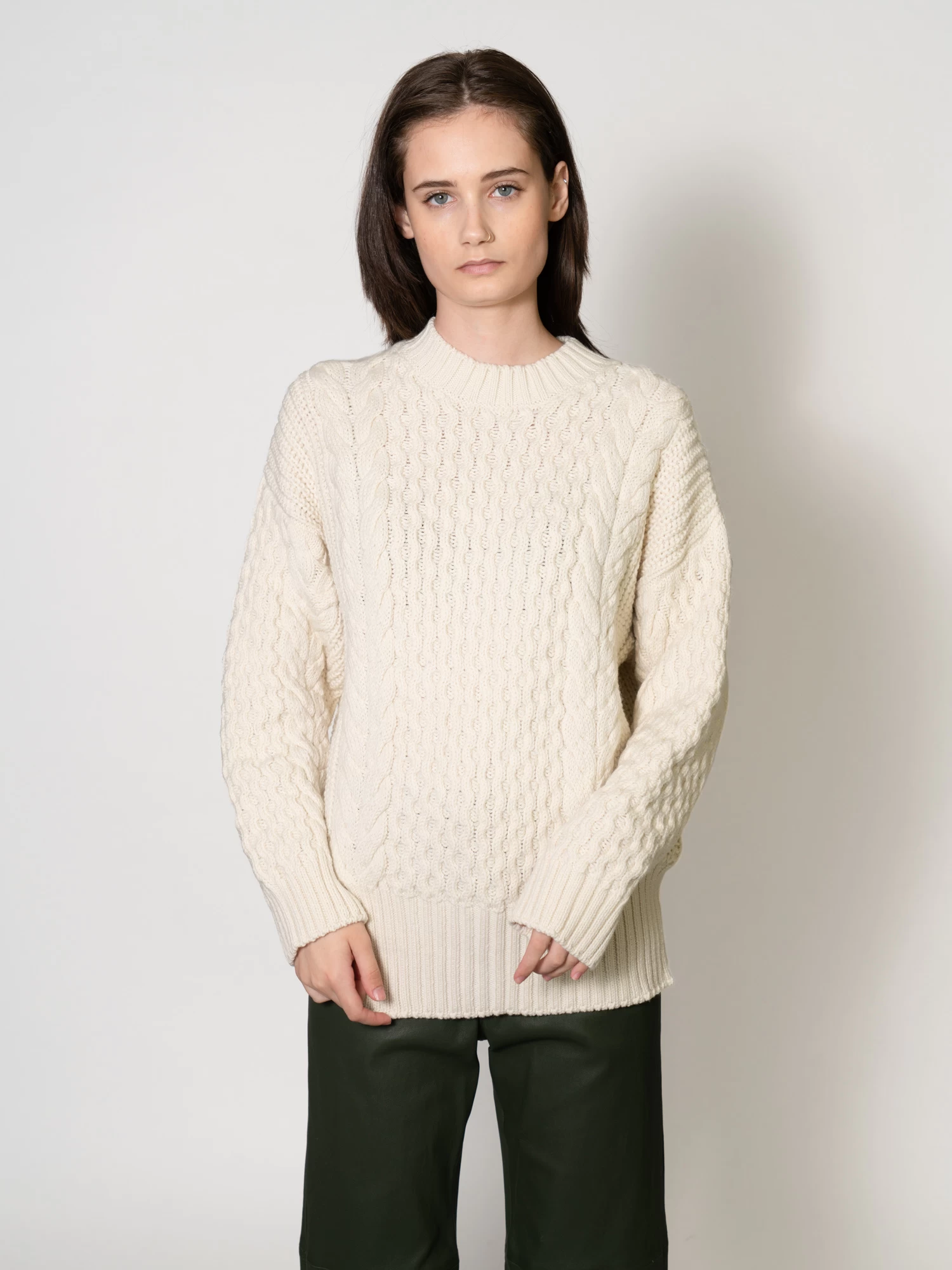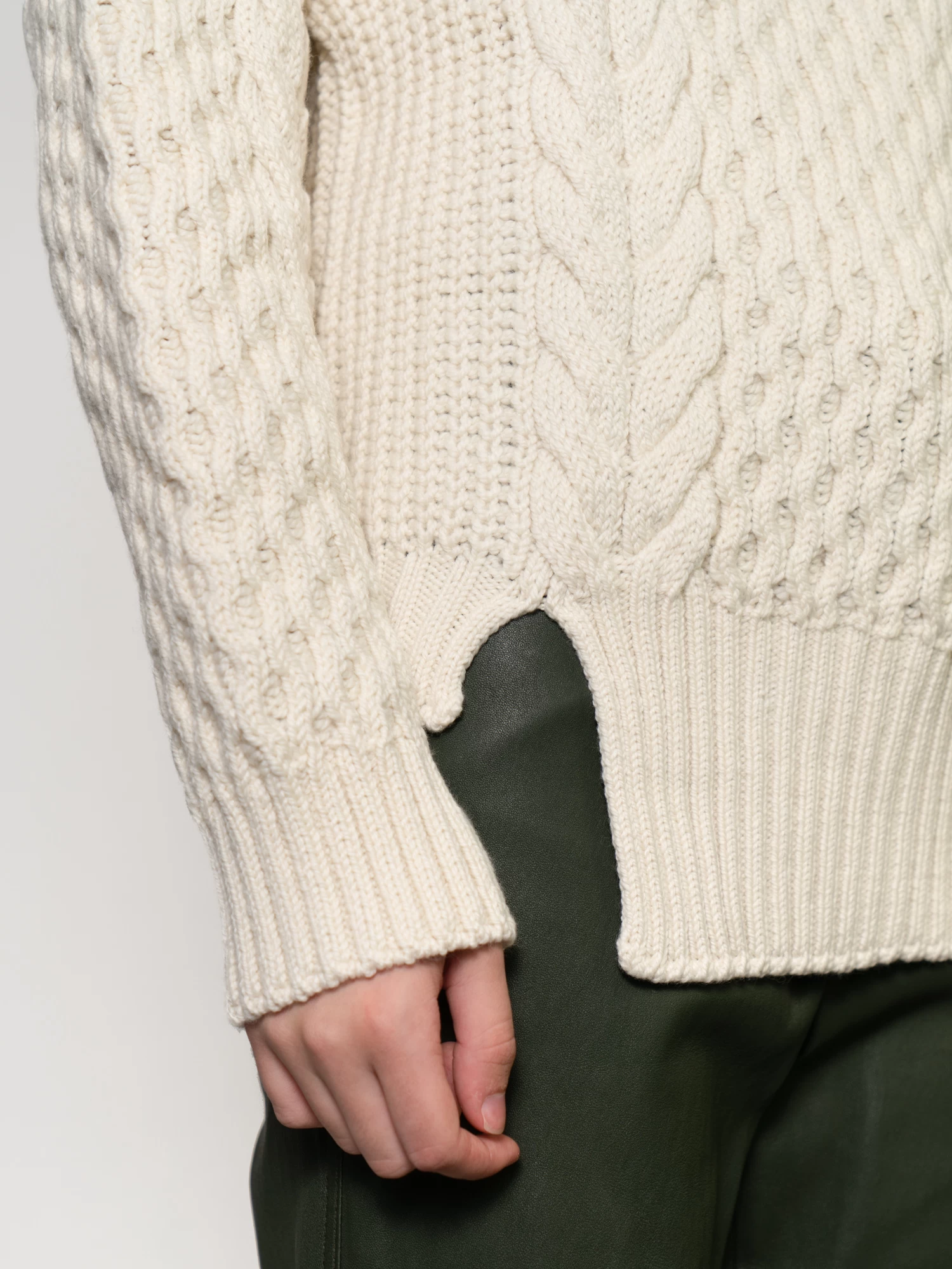Merino wool crew neckline sweater has ribbed edges, cable knit details, asymmetrical side-slit at the hem.