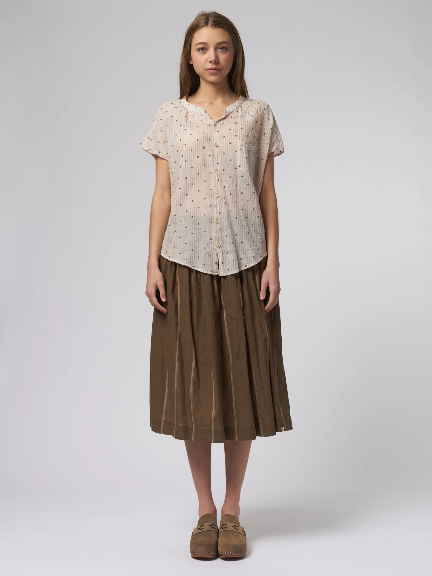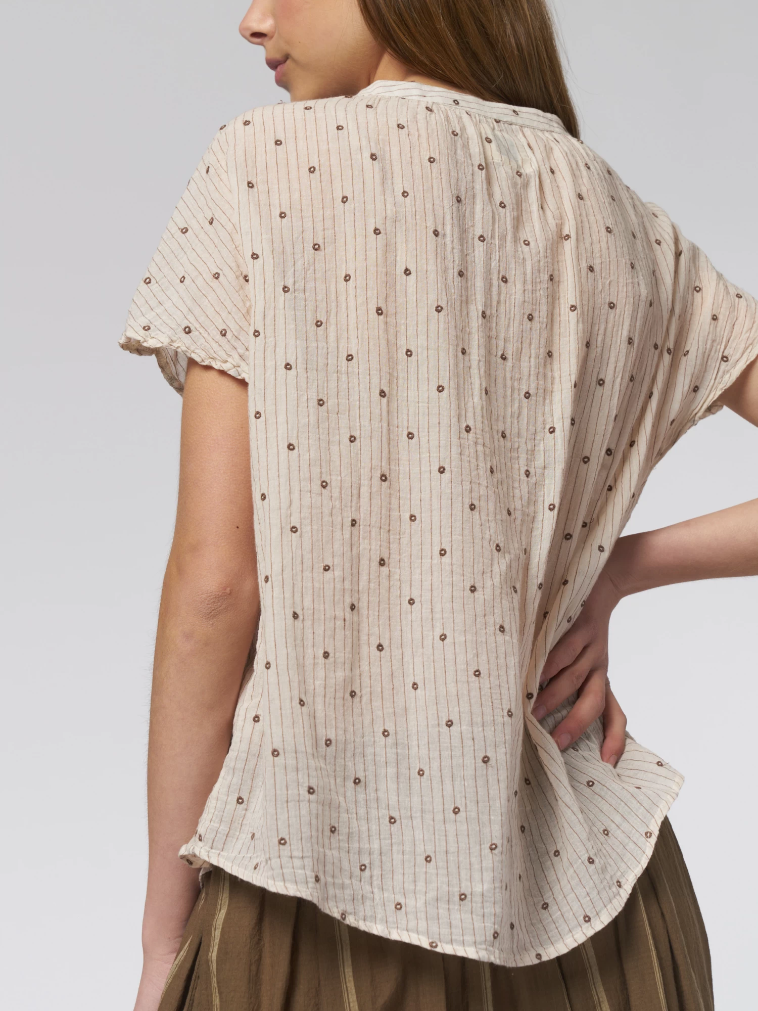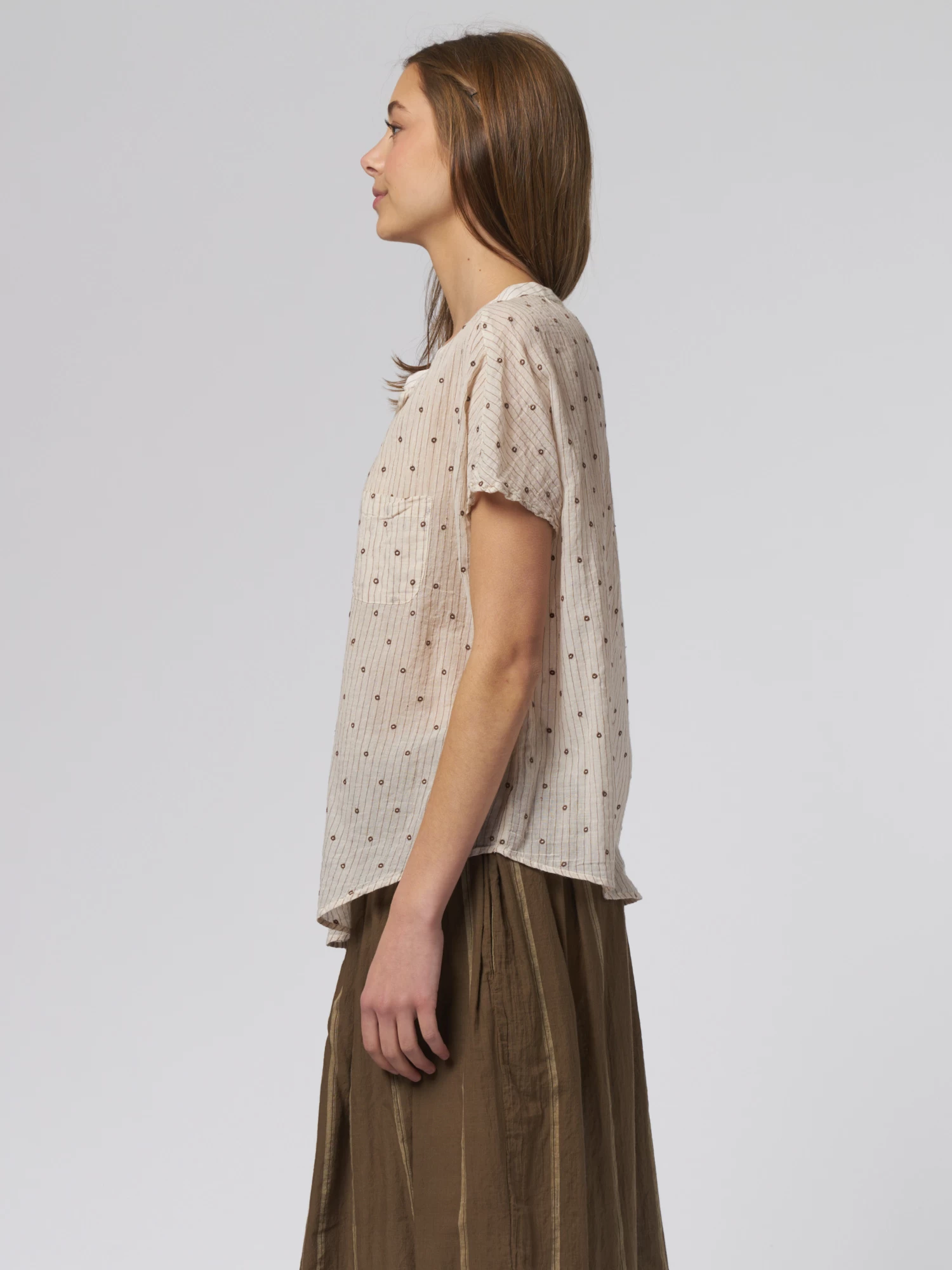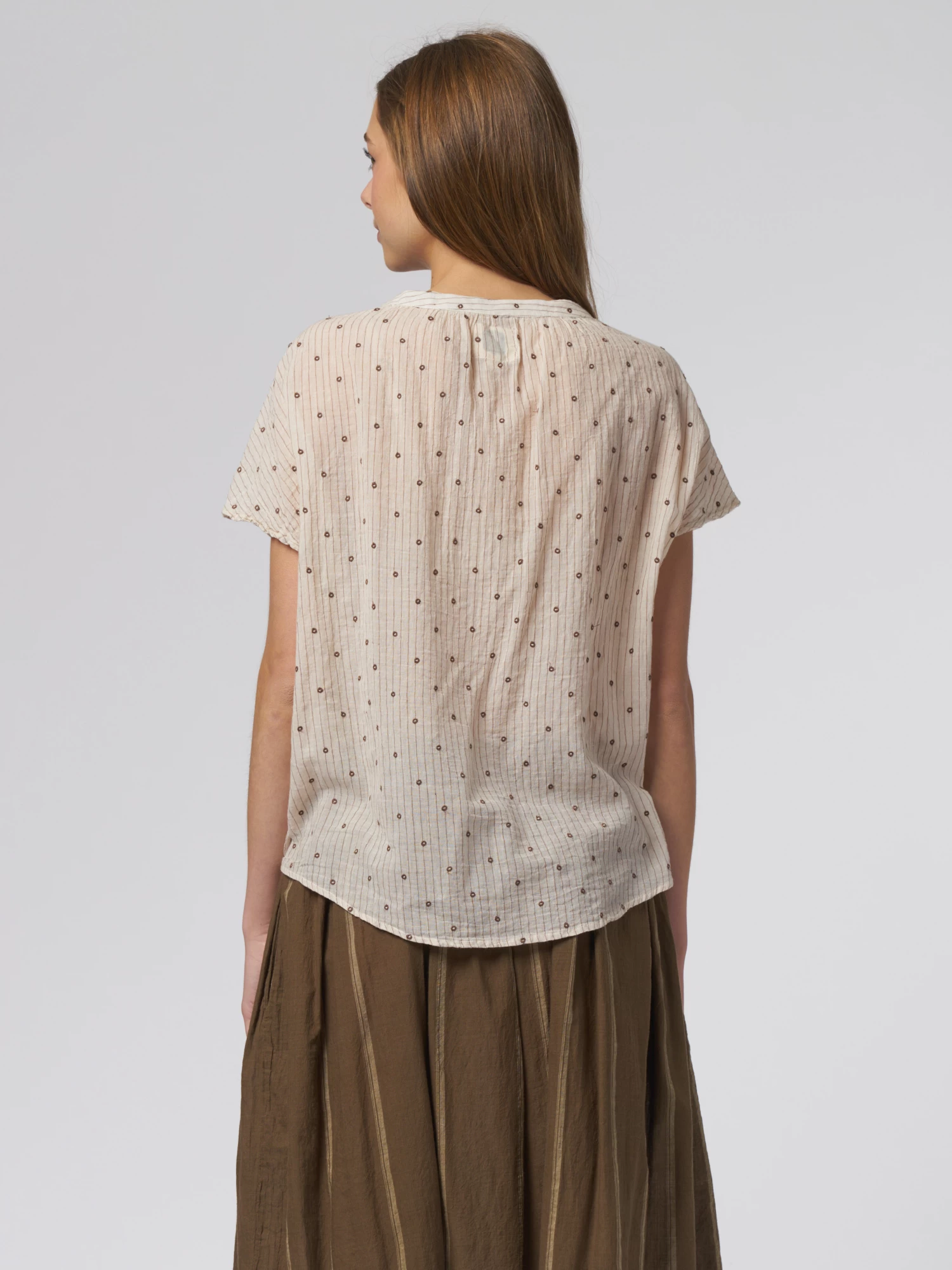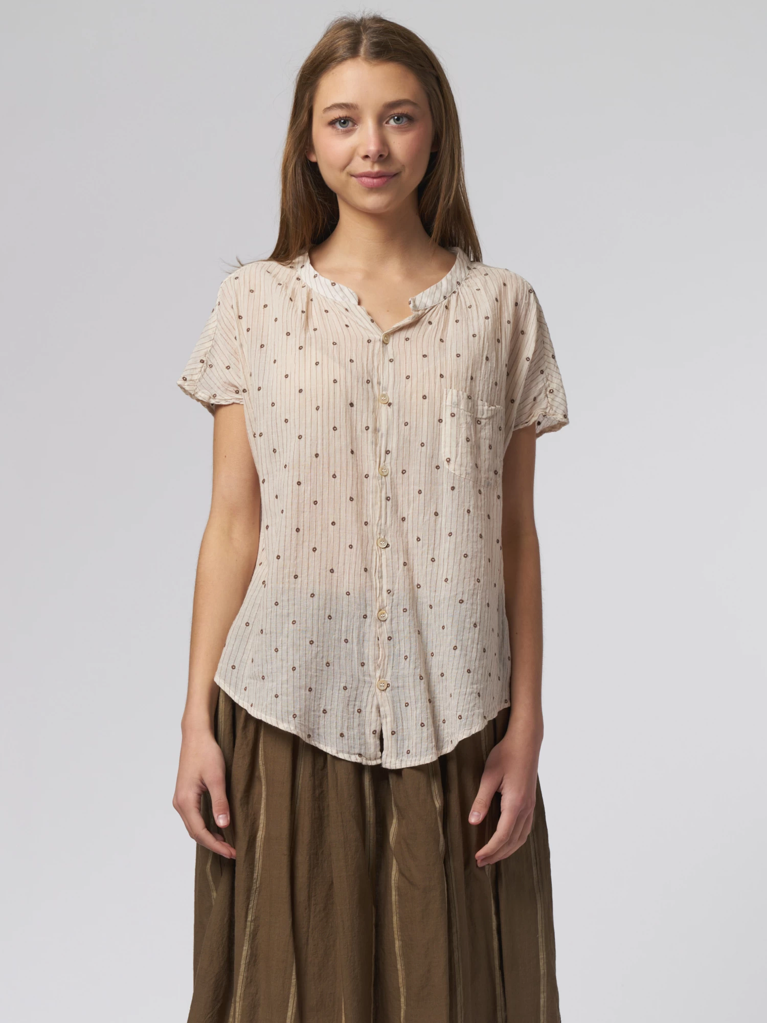 A very soft button-down cotton shirt in Kenna’s design has a slightly loose body with short sleeves