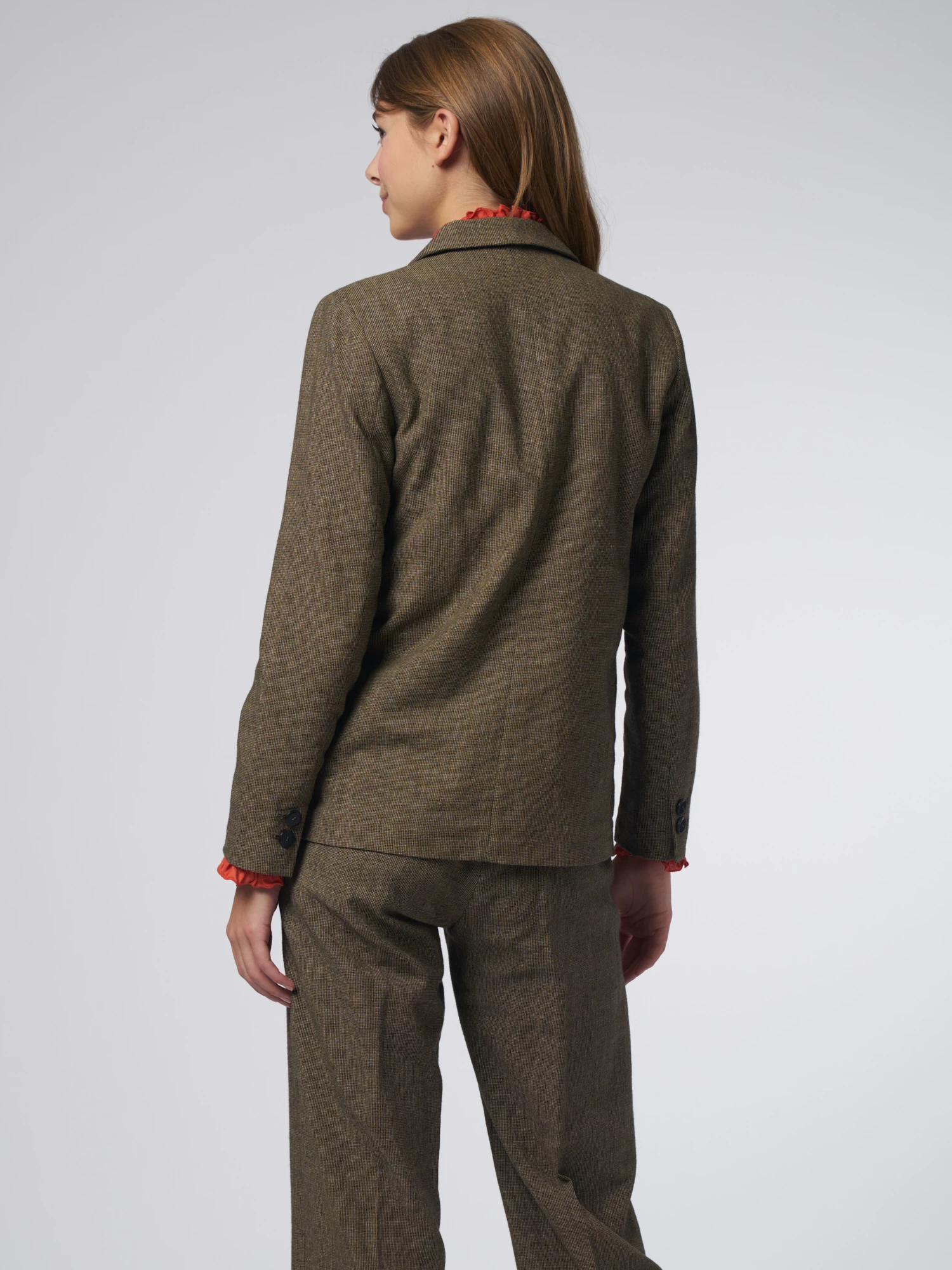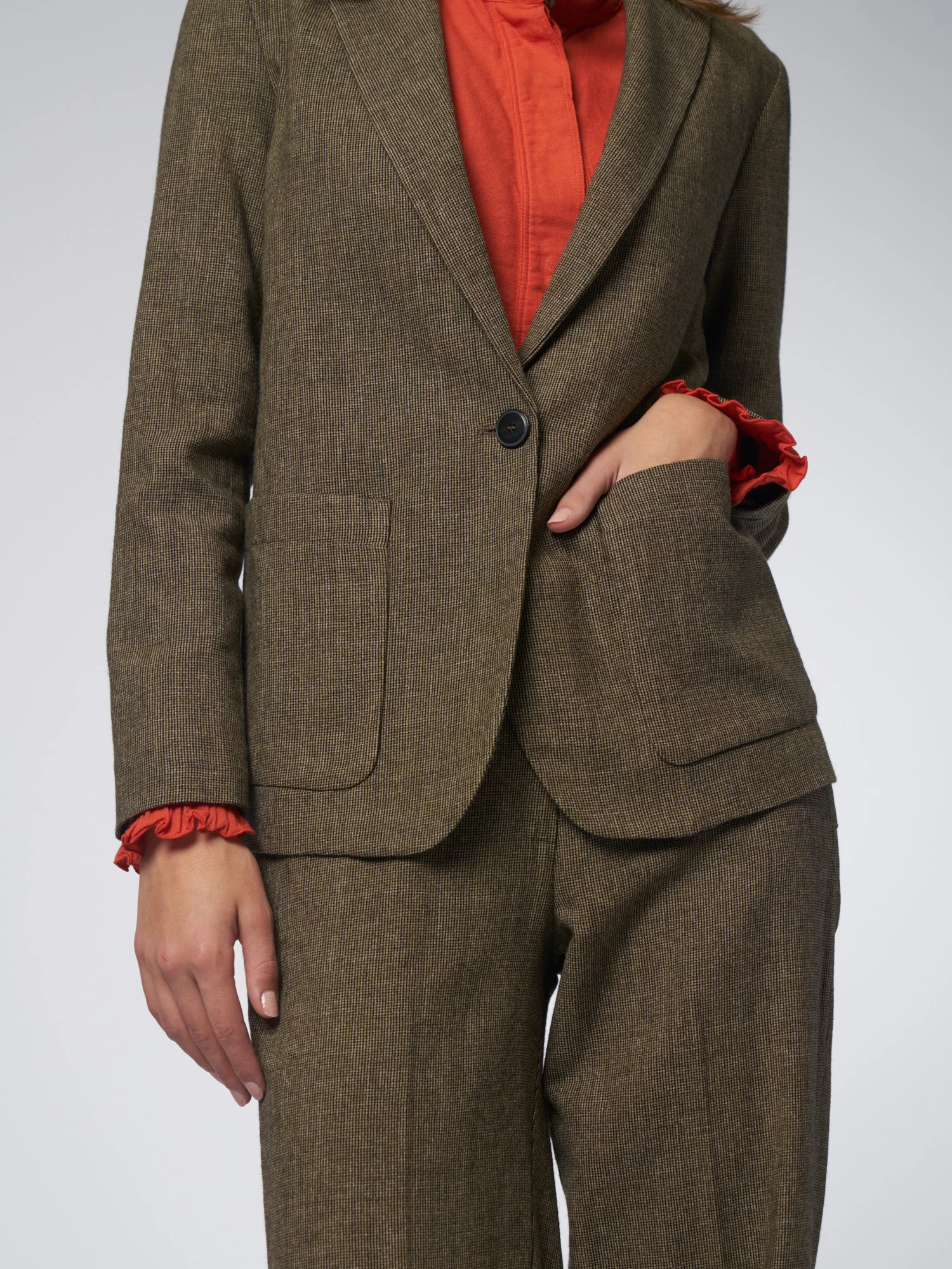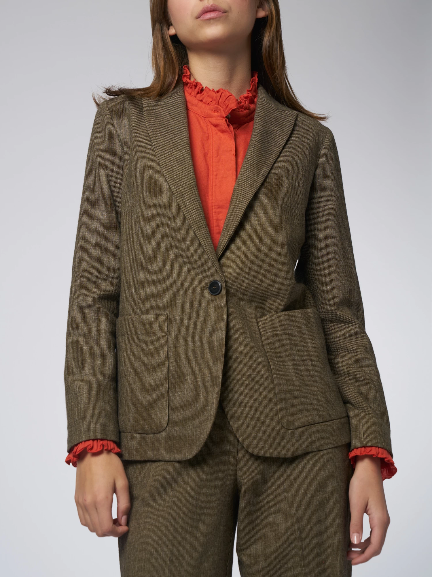 Wool and cotton blend single-breasted jacket with one button closure, collar with lapels, patch pockets.