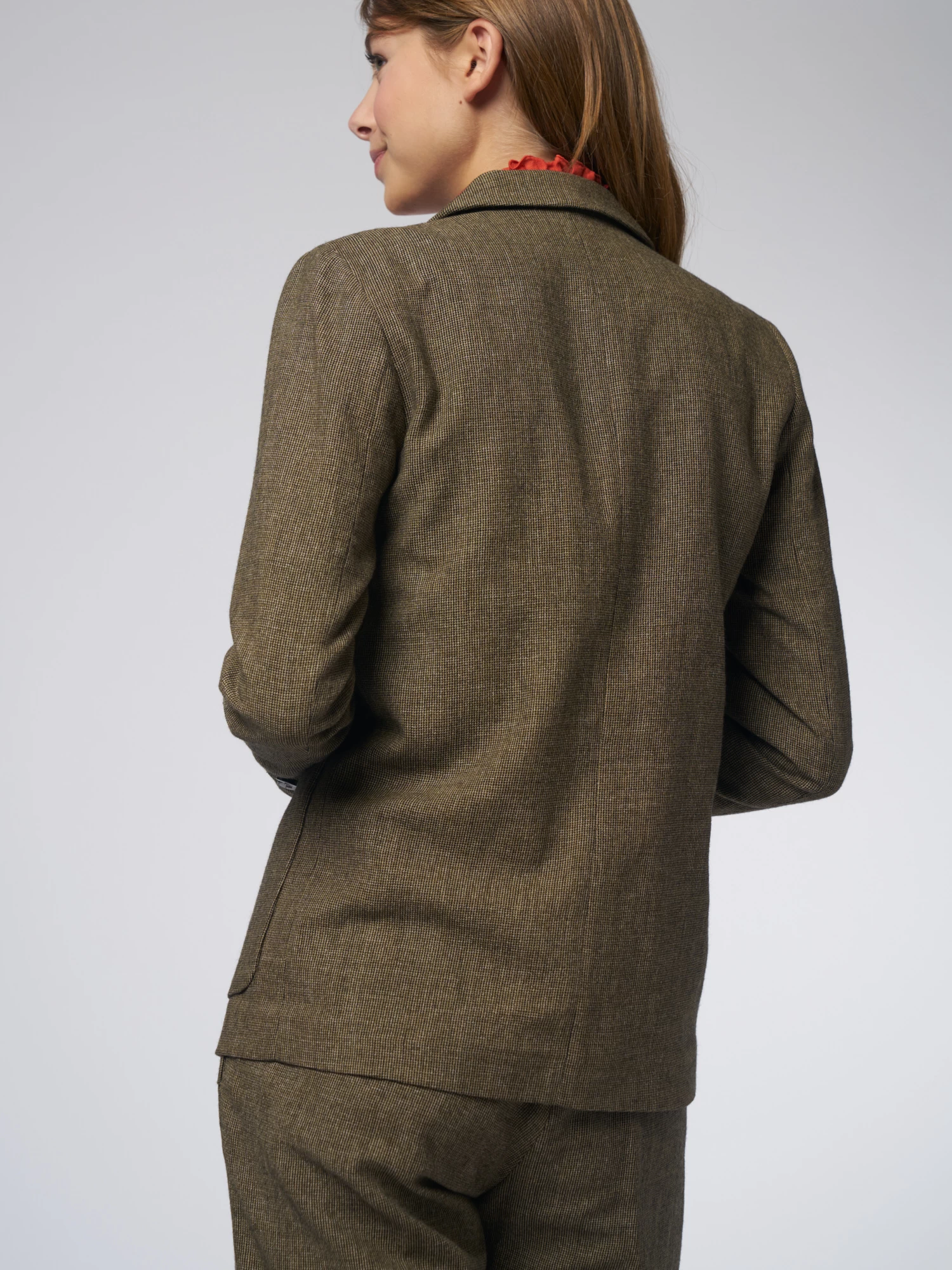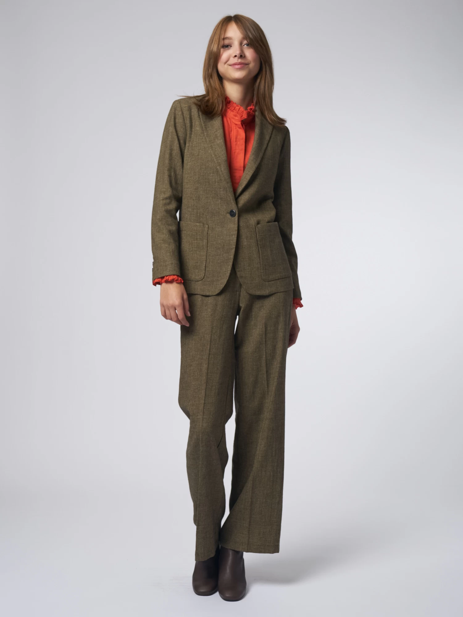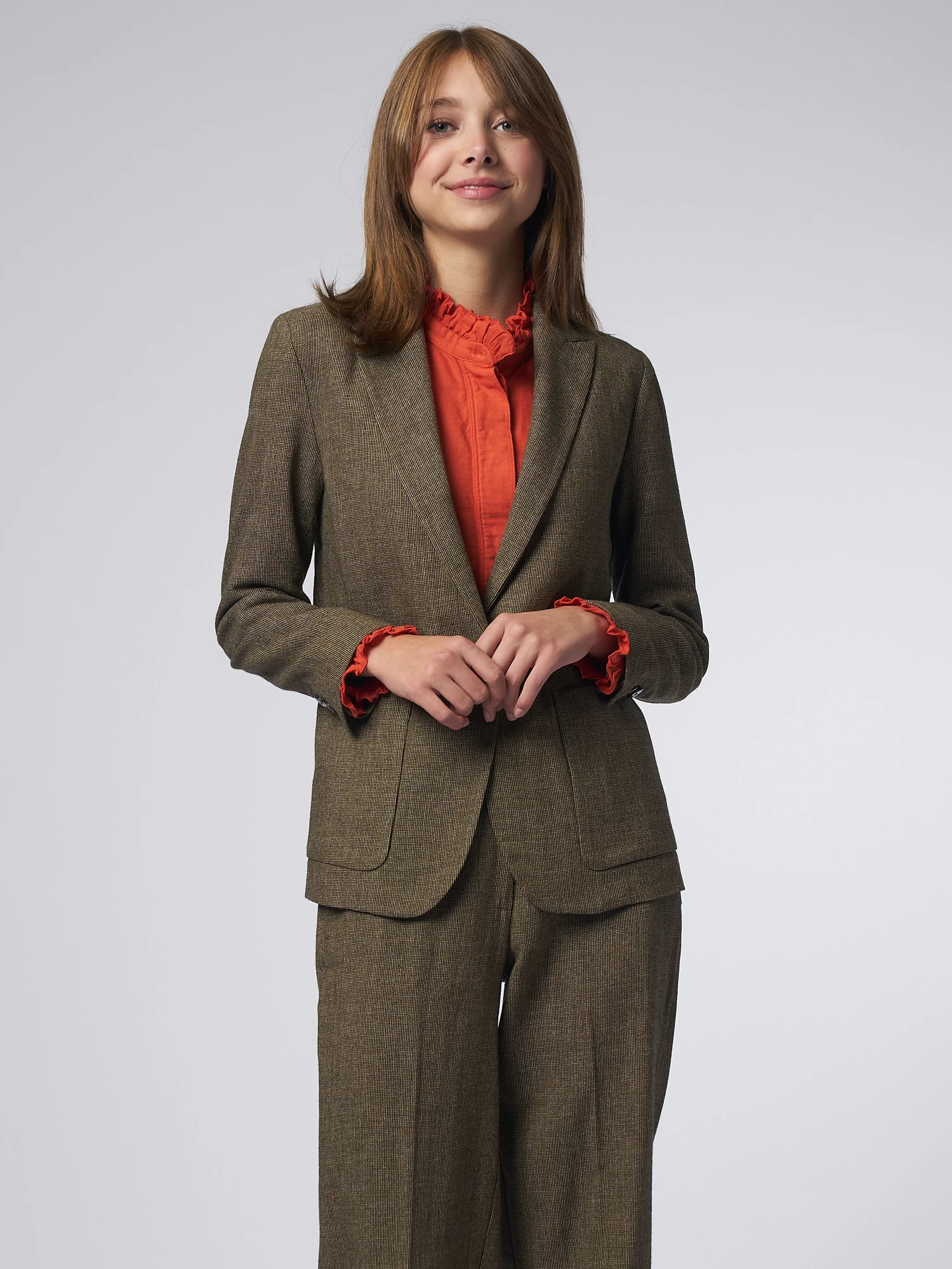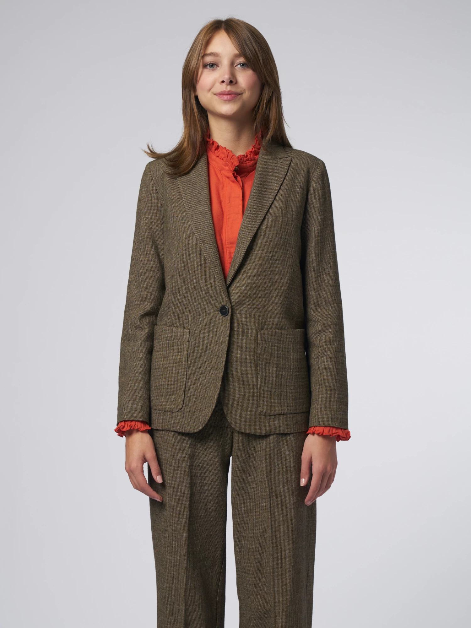 Wool and cotton blend single-breasted jacket with one button closure, collar with lapels, patch pockets.