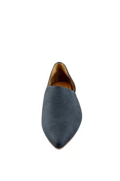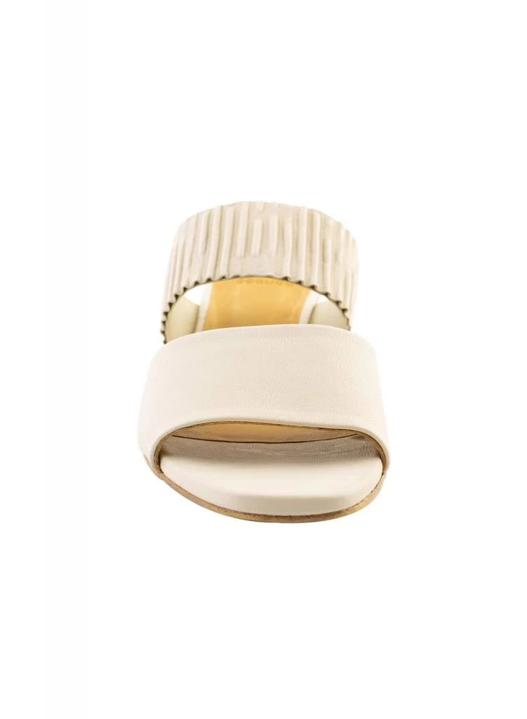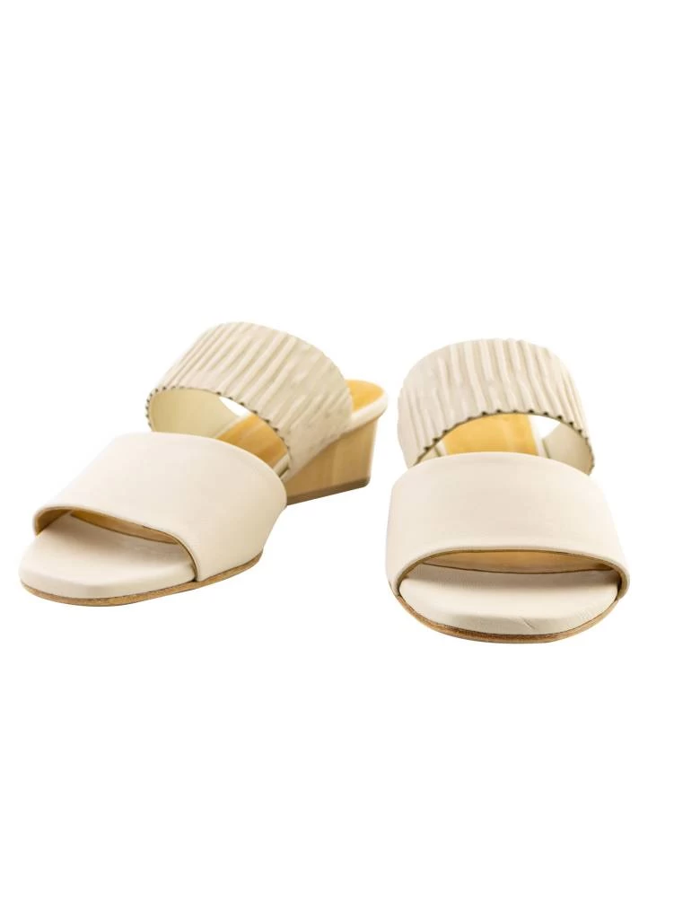 A leather sandal featuring a crinkled top strap and angled demi-wedge heel.