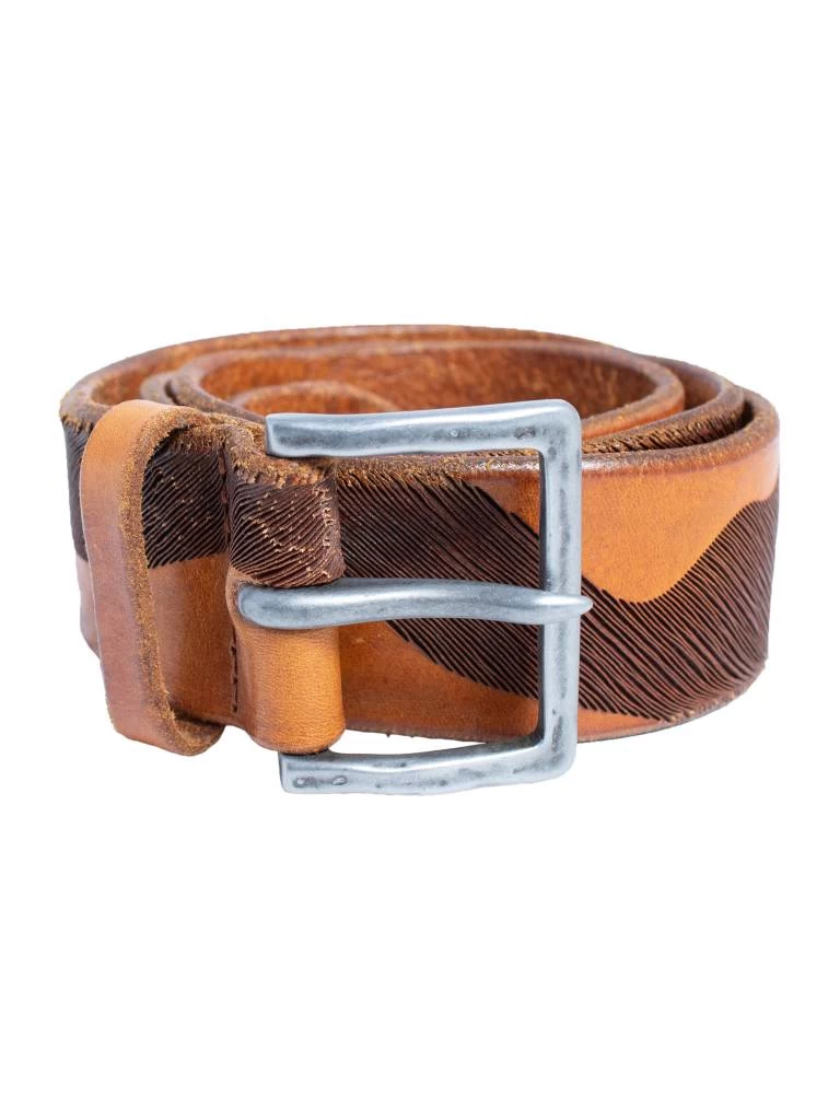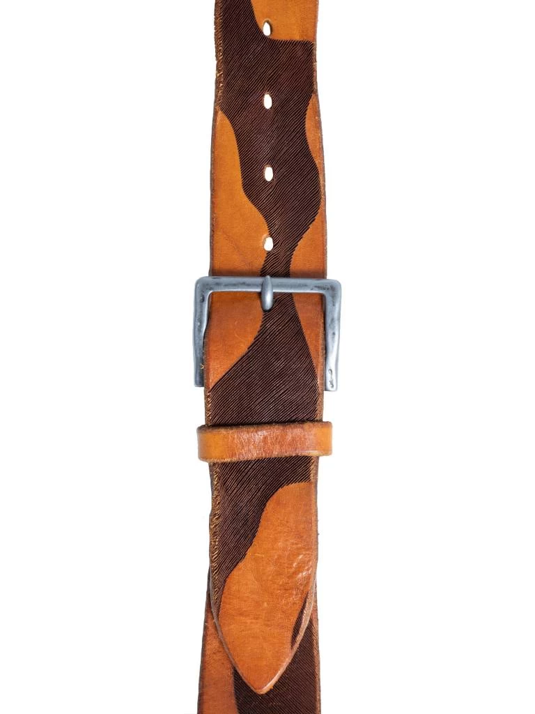 A leather belt with a matte silver buckle features an abstract textured pattern in light and dark miele brown.