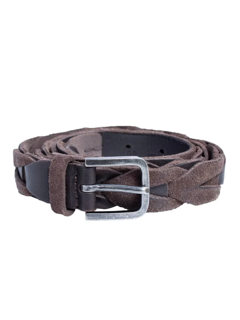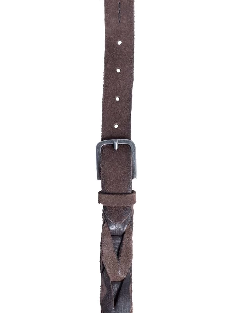 A woven leather belt with English finish silver buckle in T. Moro chocolate brown brushed suede.