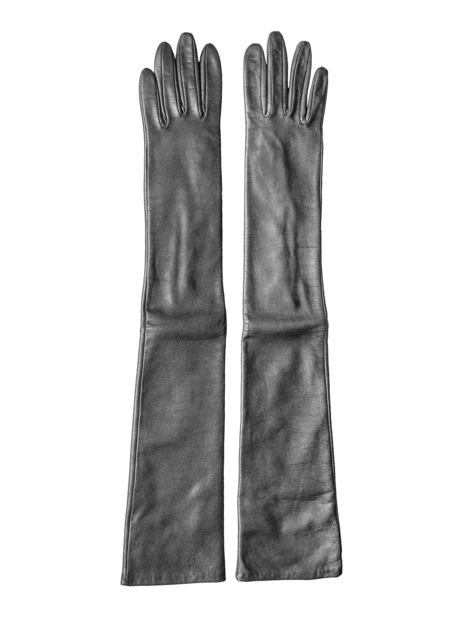 A pair of leather gloves feature three buttons at the wrist in an opera length metallic silver with a silk lining.