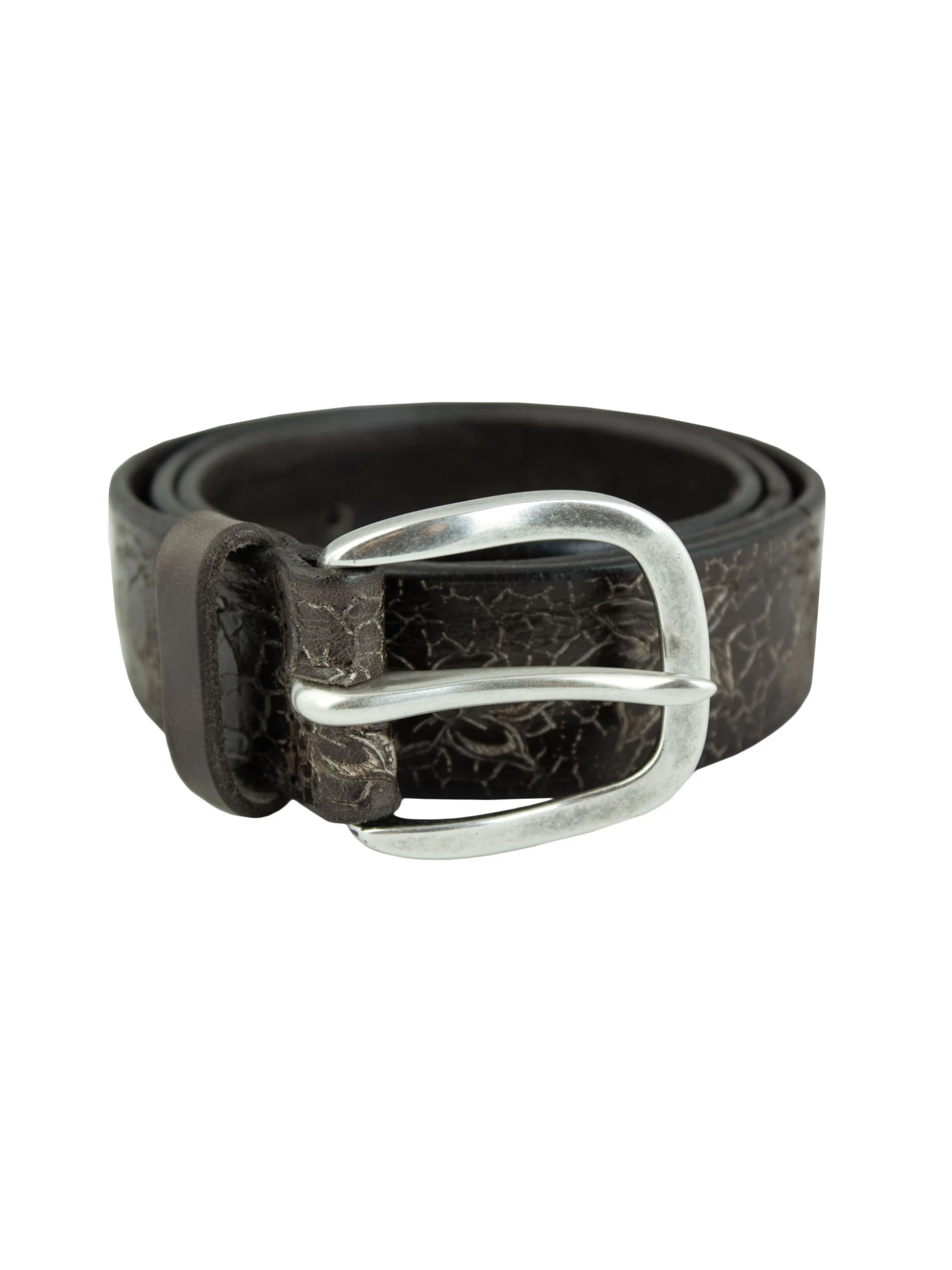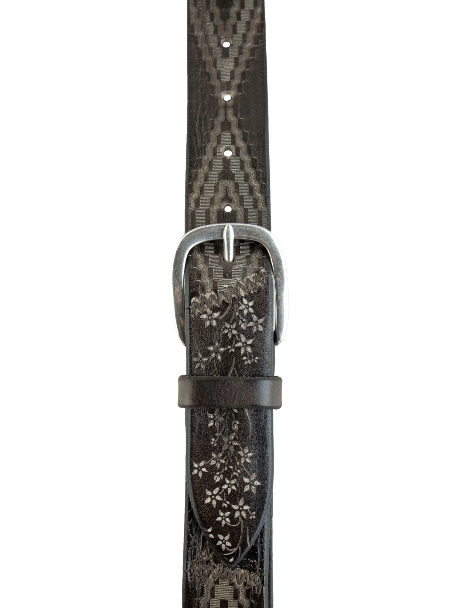 A brown leather belt with a soapy patch pattern and stunning floral pattern.