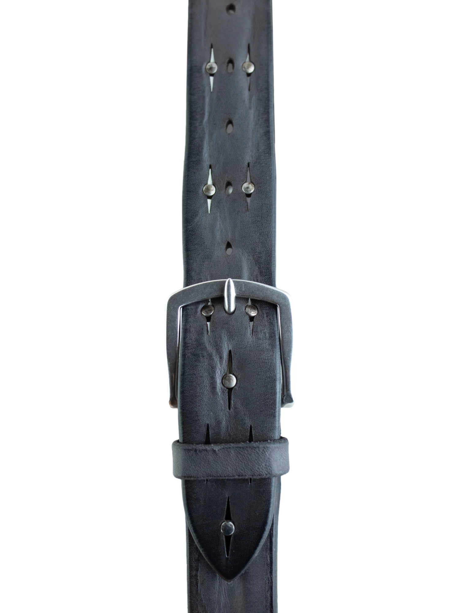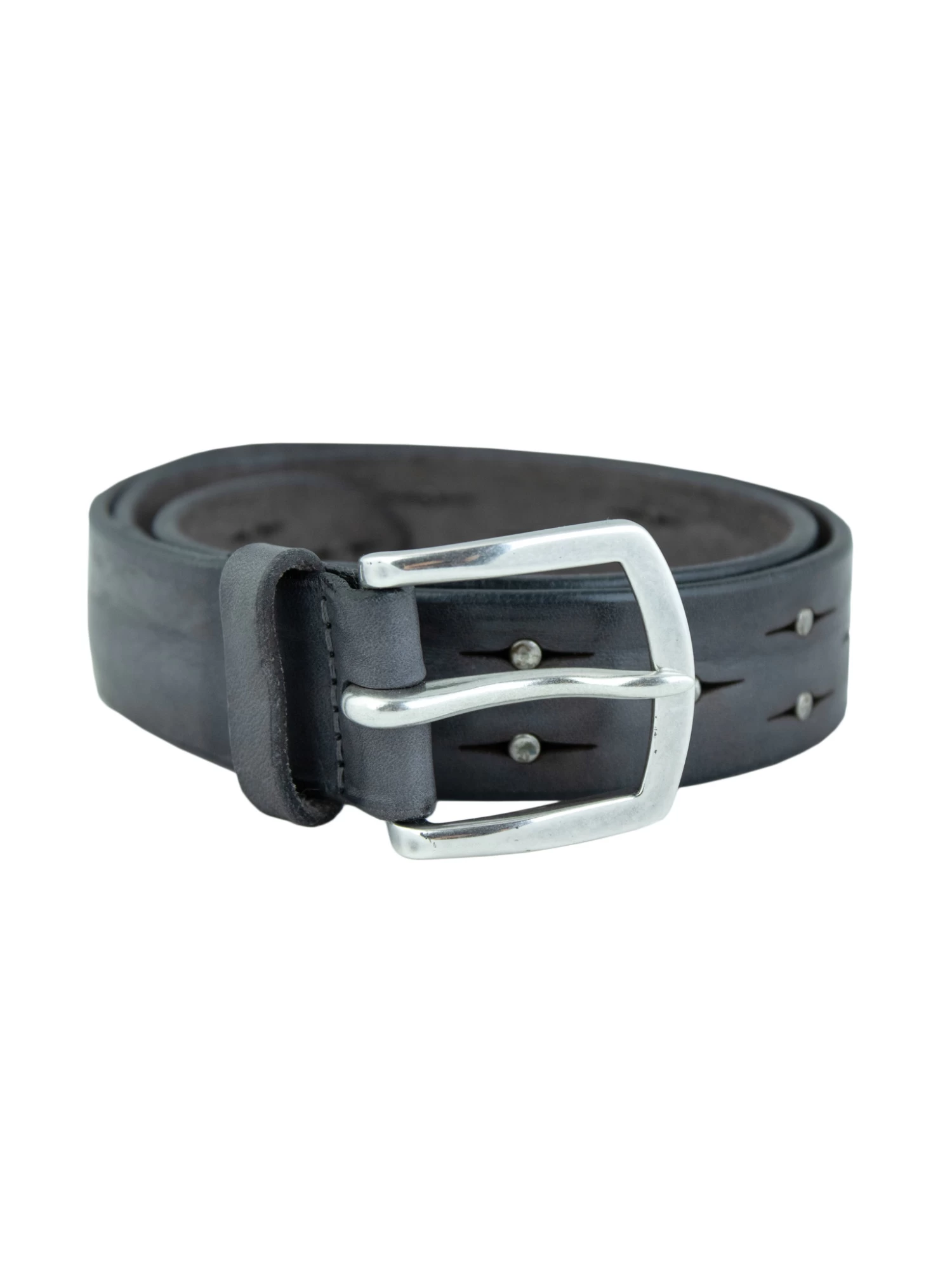 An elegant grey leather belt with studs.