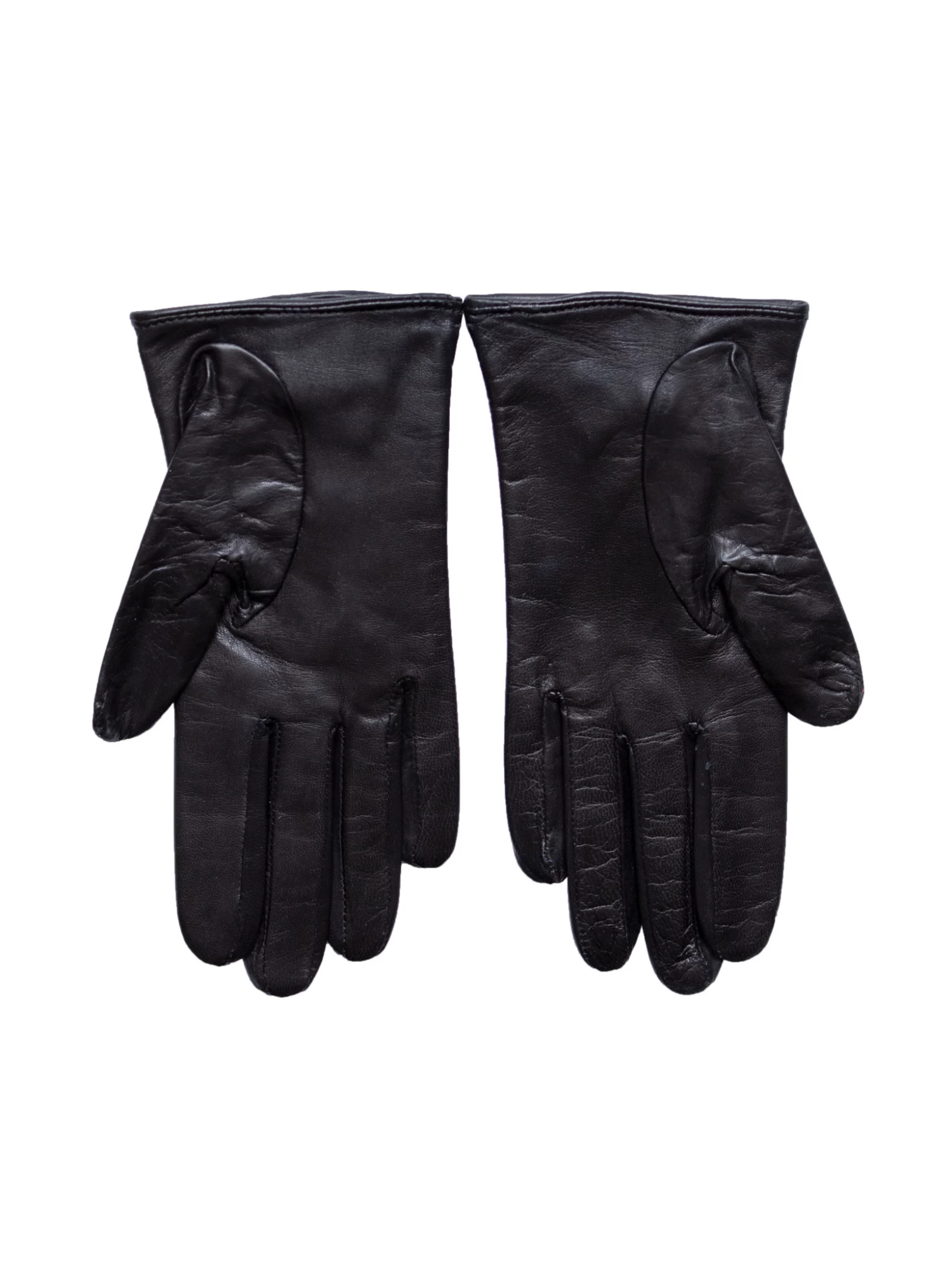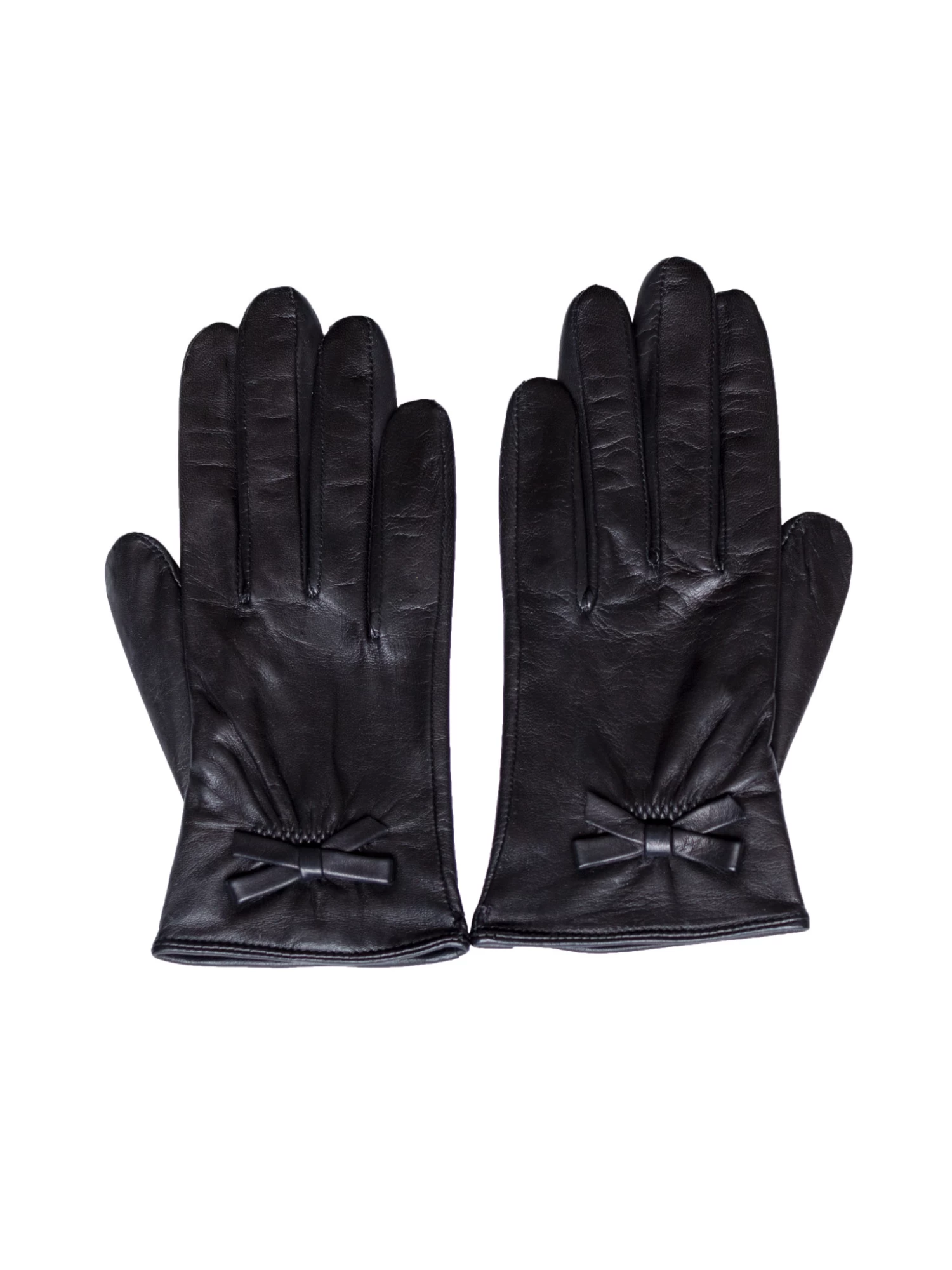 A pair of black leather gloves with a wrist bow detail and silk lining.