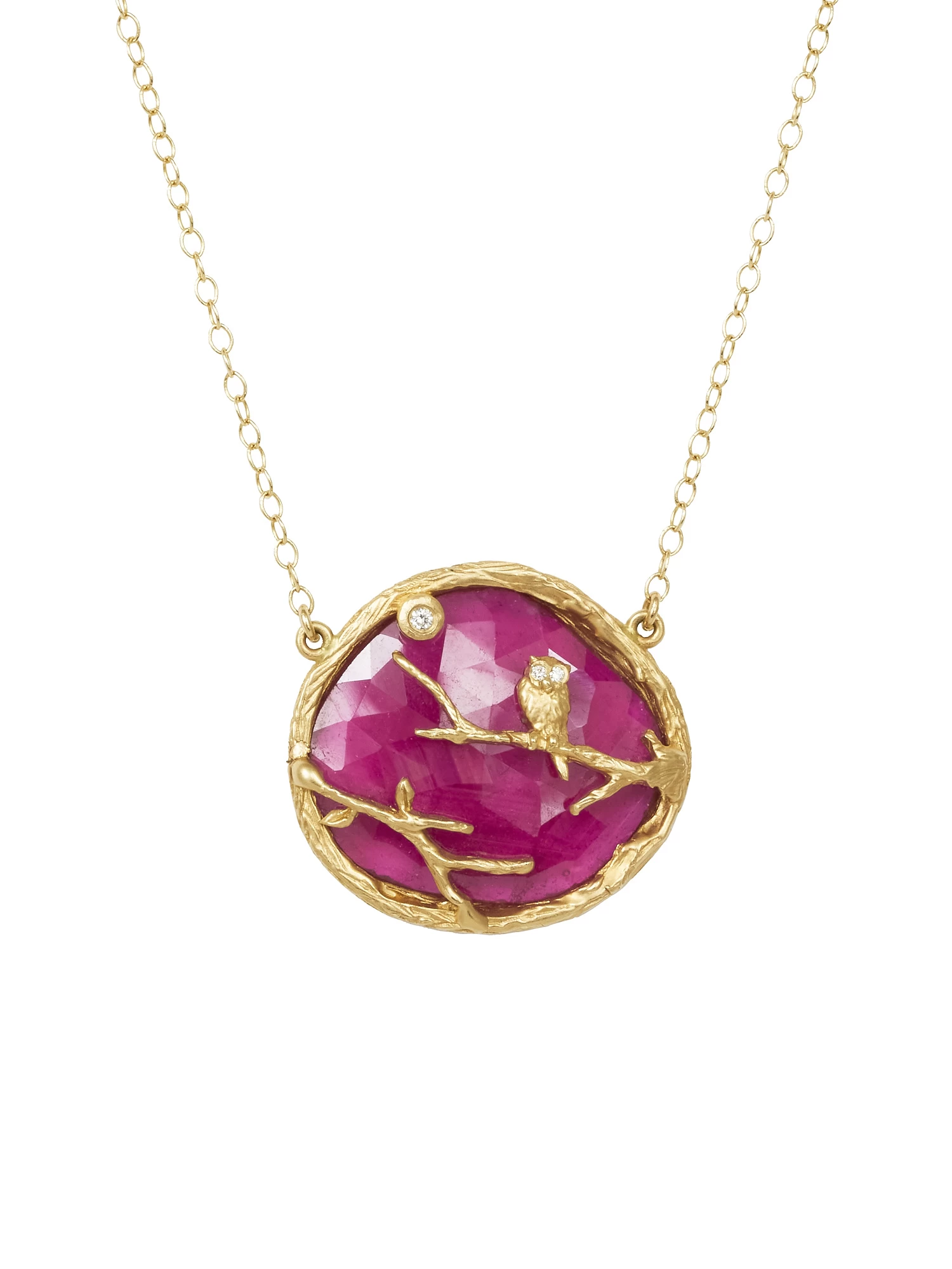 14K Gold Necklace with beautifully designed owl with diamond eyes, the branch and diamond moon over the faceted ruby pendant,