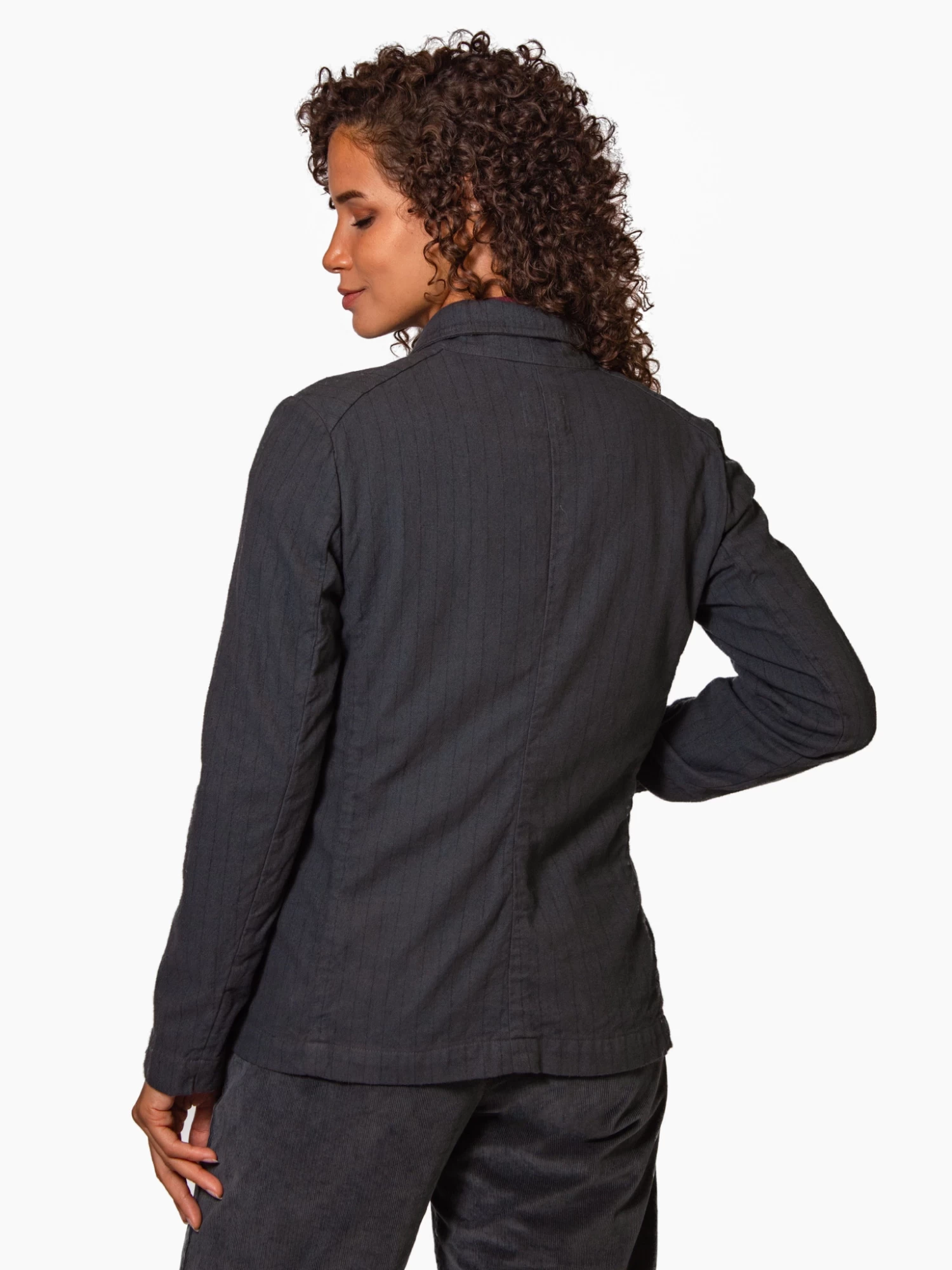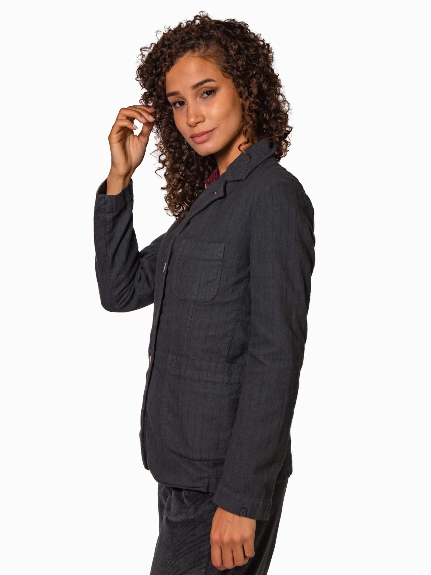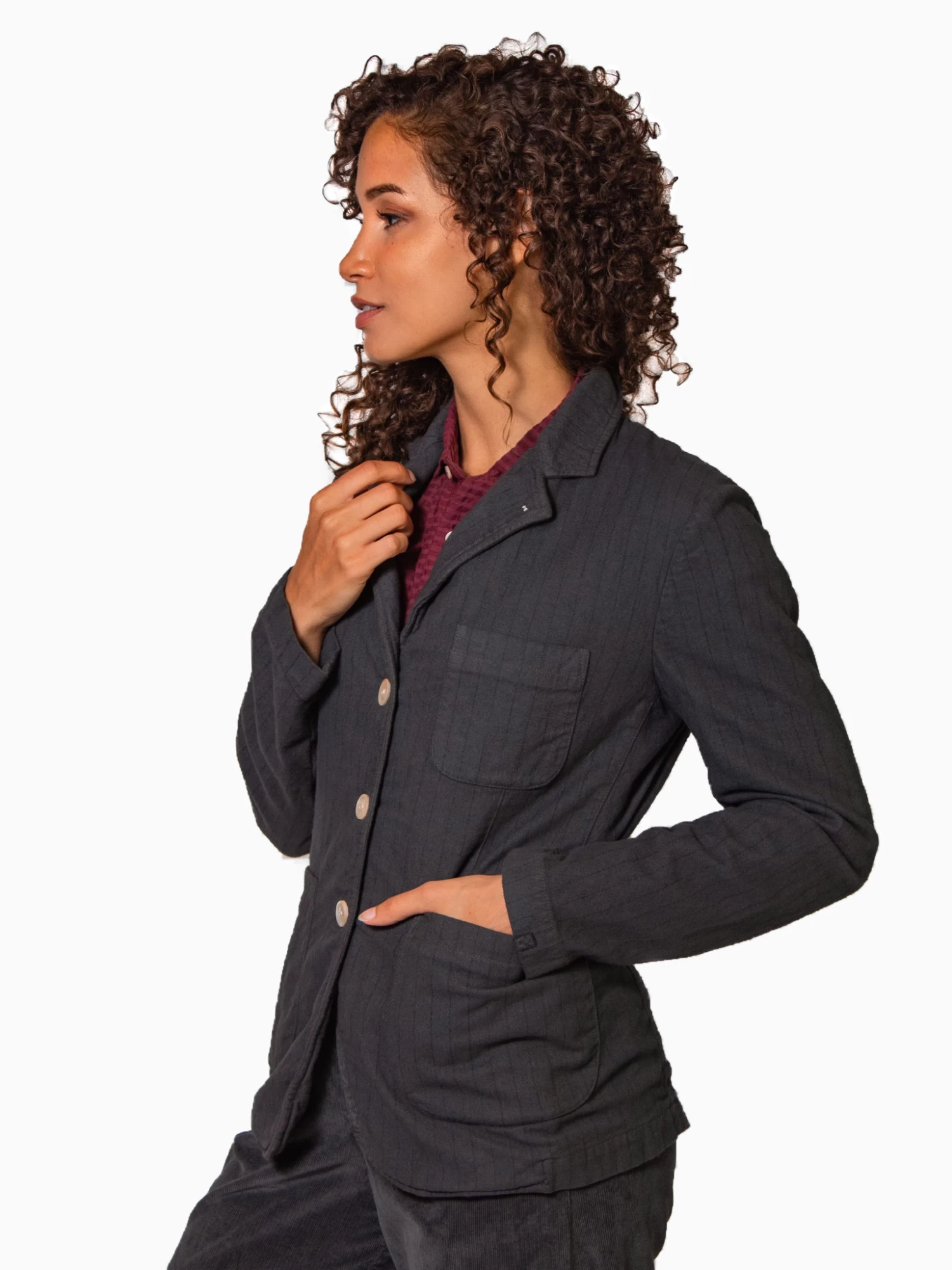 A collared jacket with button closure, one breast pocket, and two front pockets.