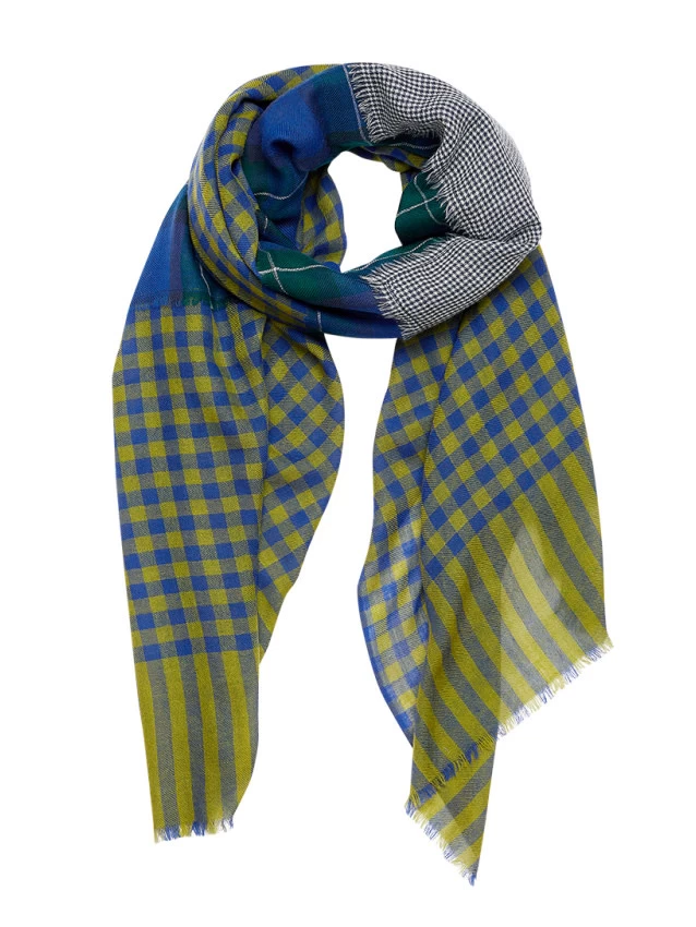 A wool scarf with patched plaid checks, mat weave, woven borders, and fringed edges in mossy yellow, green, and blue.