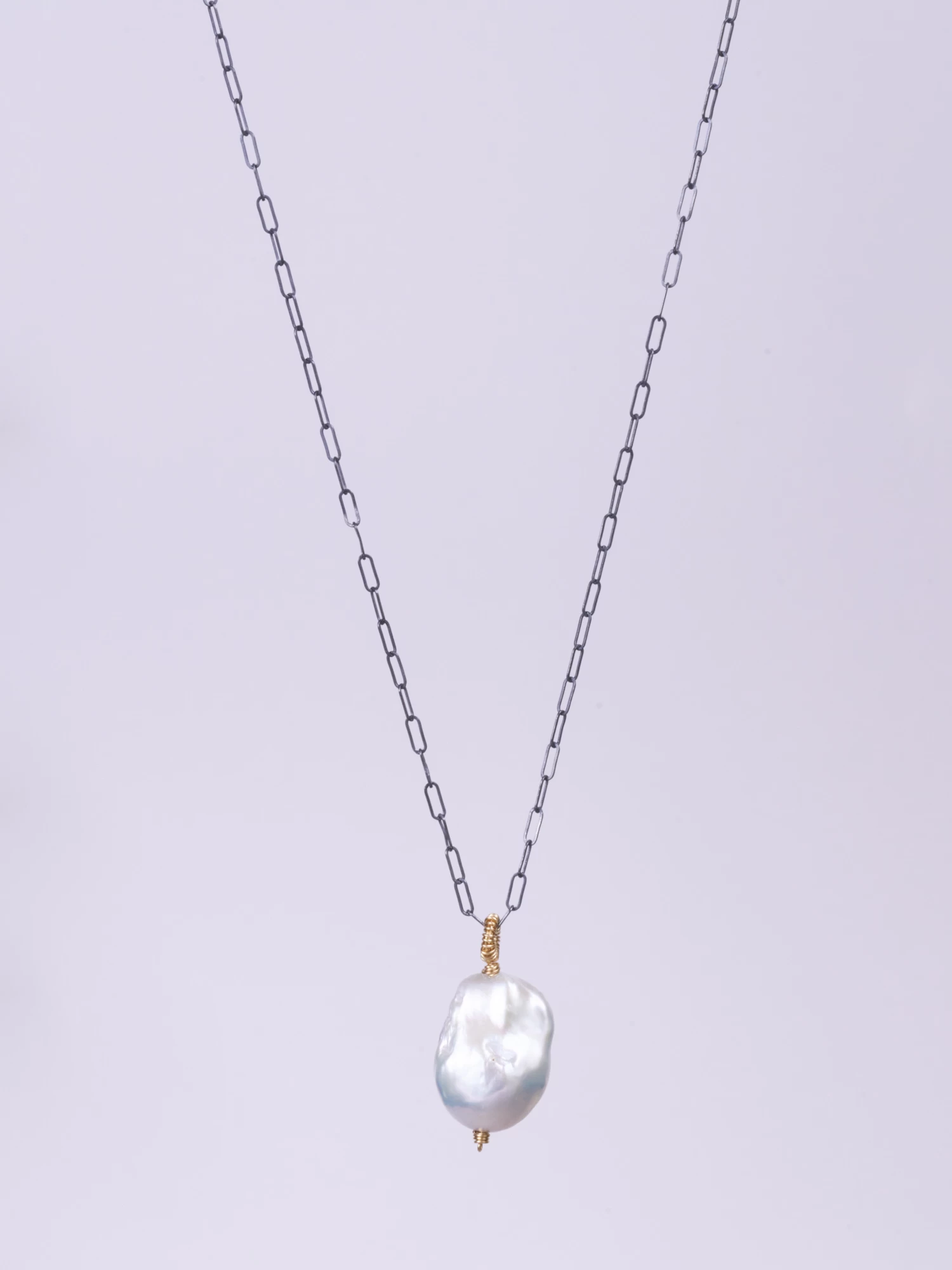 Fresh Water Chunky Pearl Pendant delicately gold wire wrapped to oxide sterling silver chain