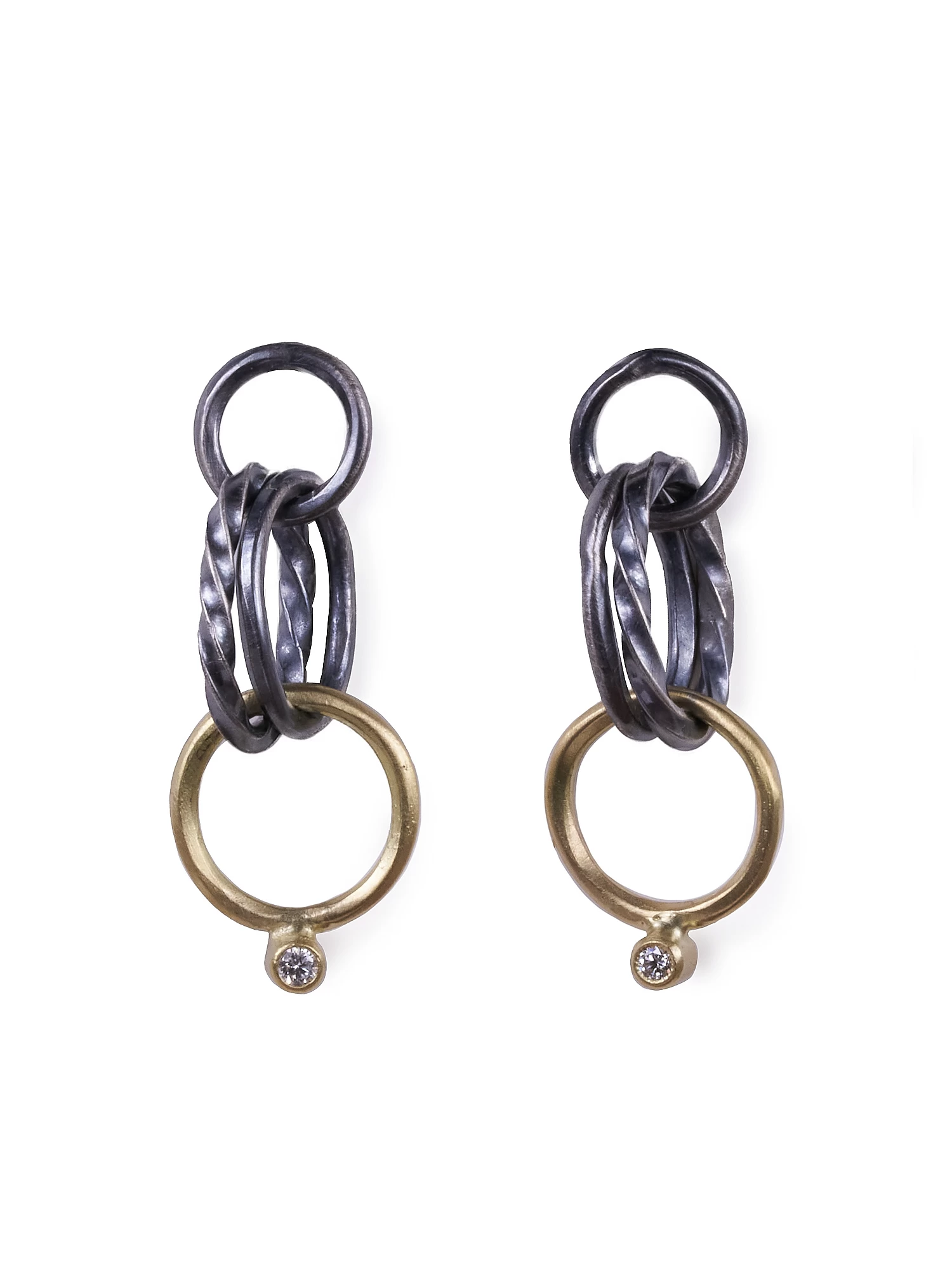 A pair of post earrings feature handmade and twisted 18k gold and oxidized silver links with 1.5mm bezel set white diamonds.