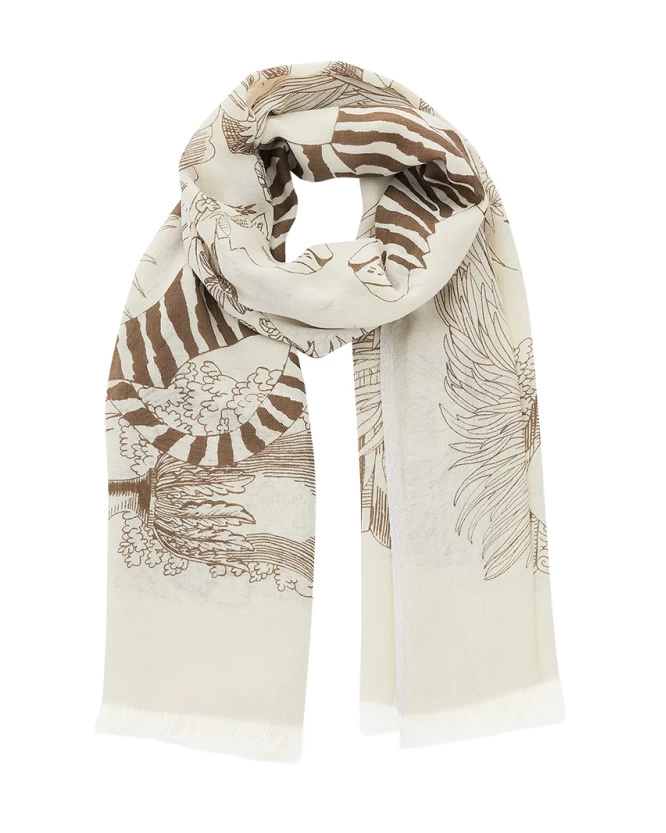 A wool and cashmere scarf with a Bengali tiger in the royal forest, on its way to pick its favorite flower.