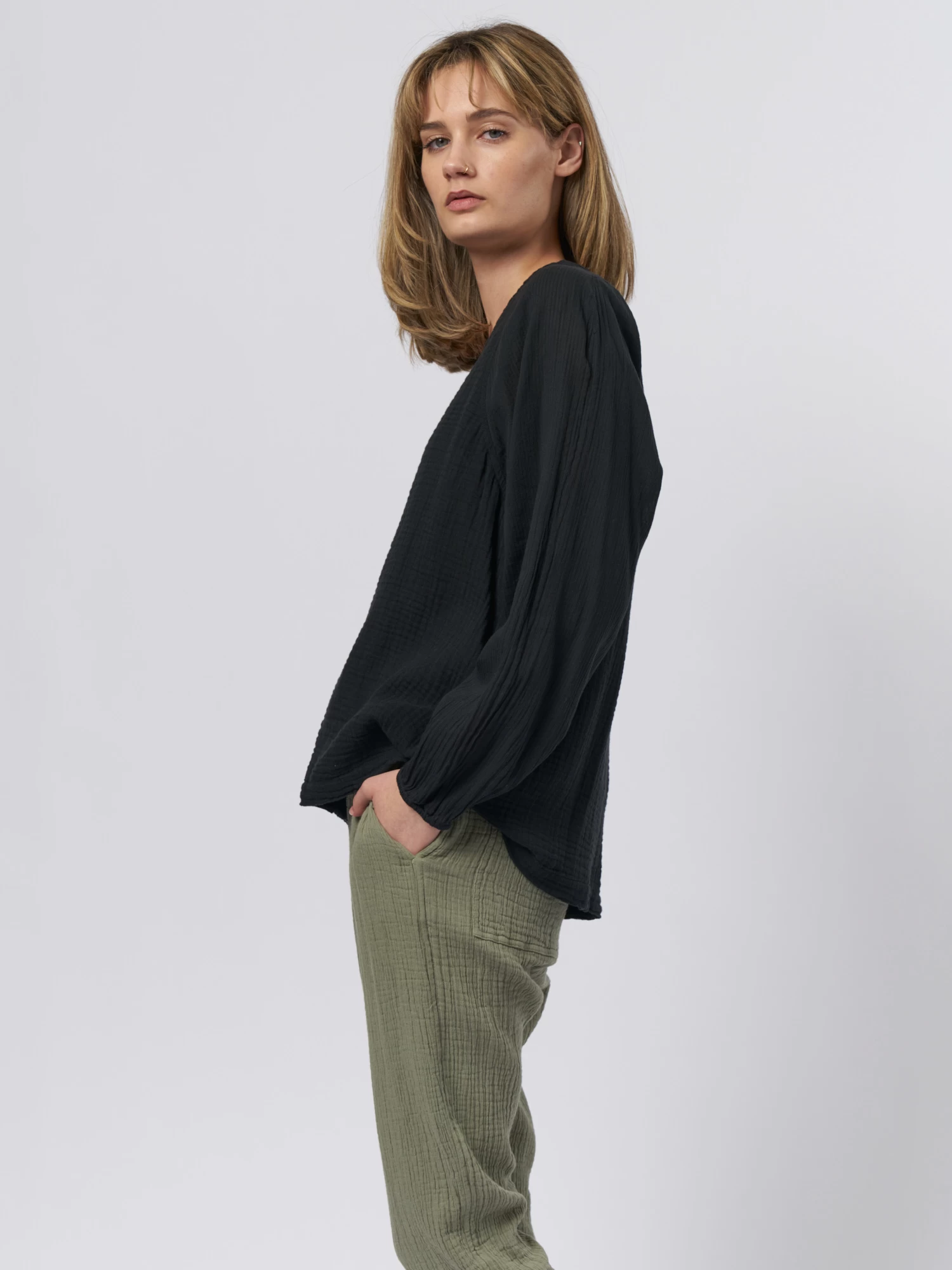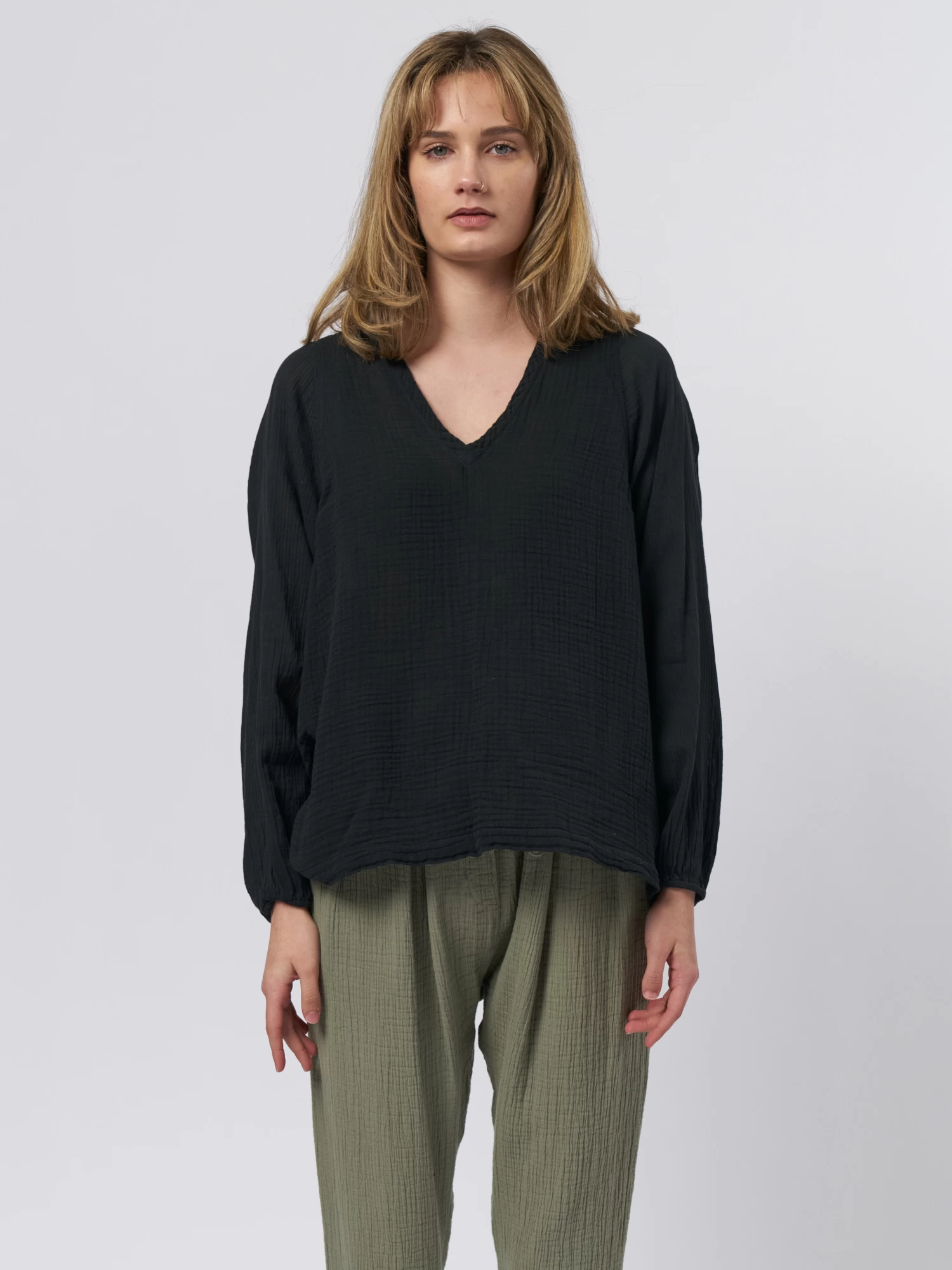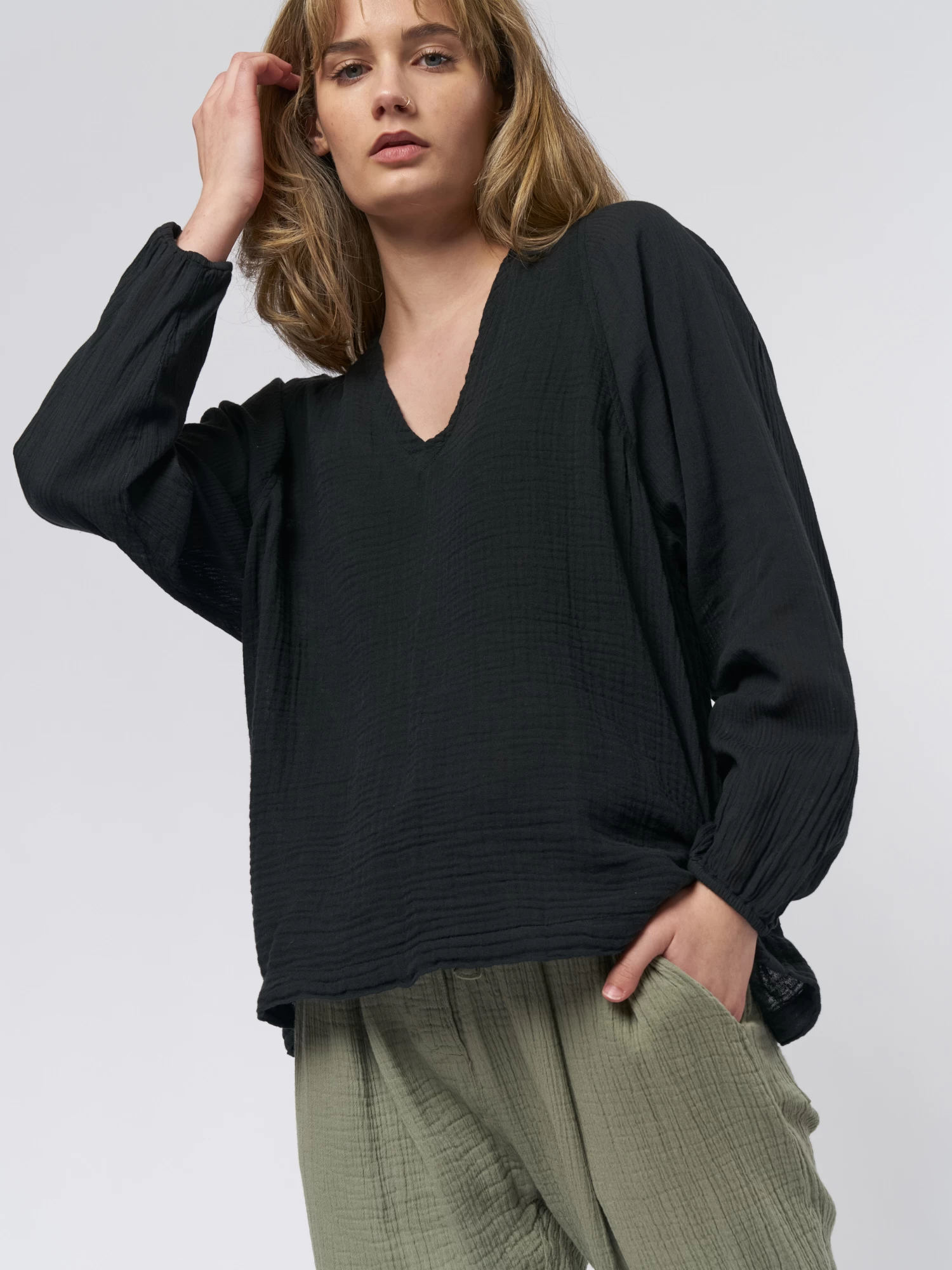 A relaxed drape top in a double gauze body has a v-neckline and single gauze long sleeves.