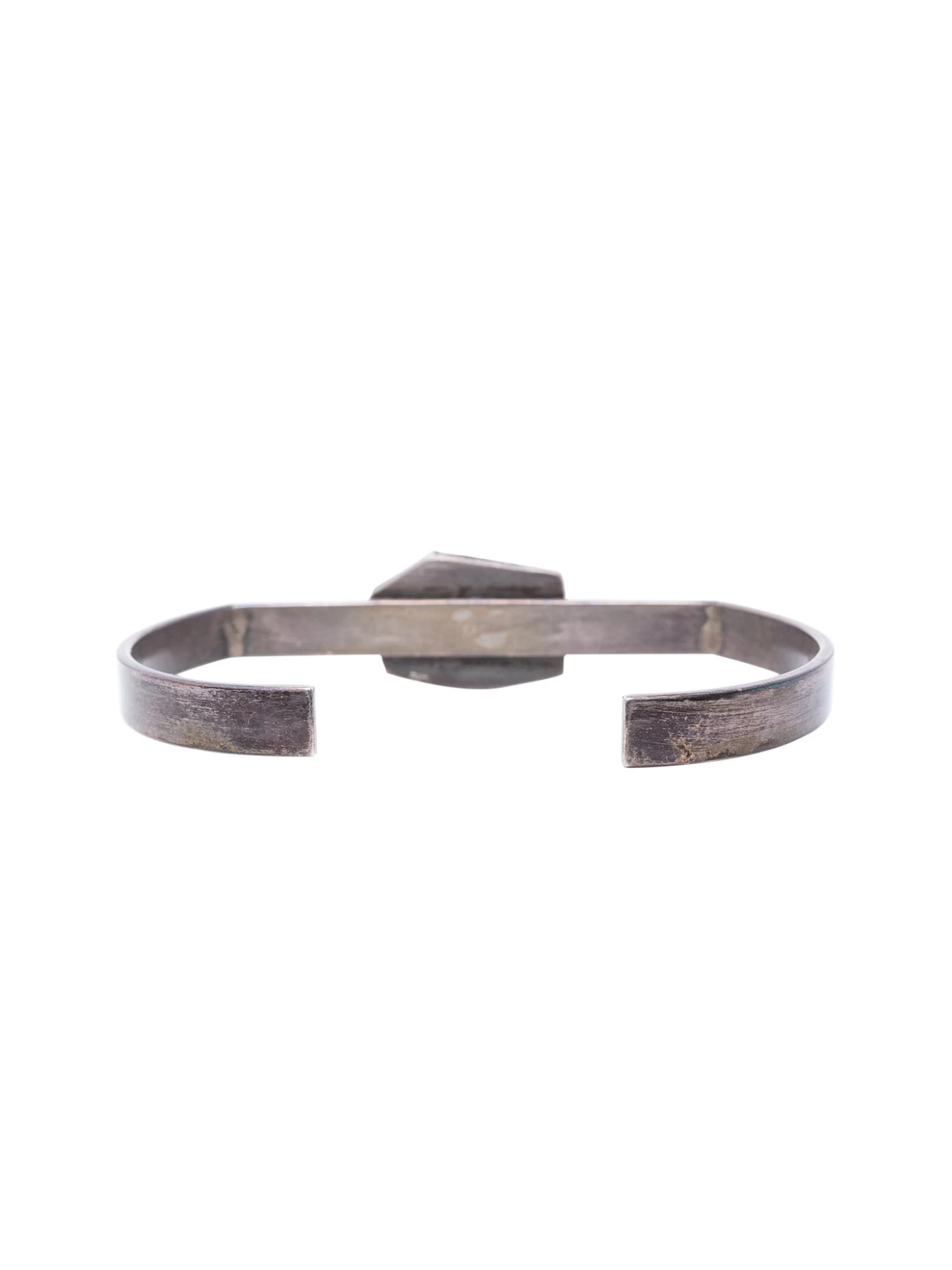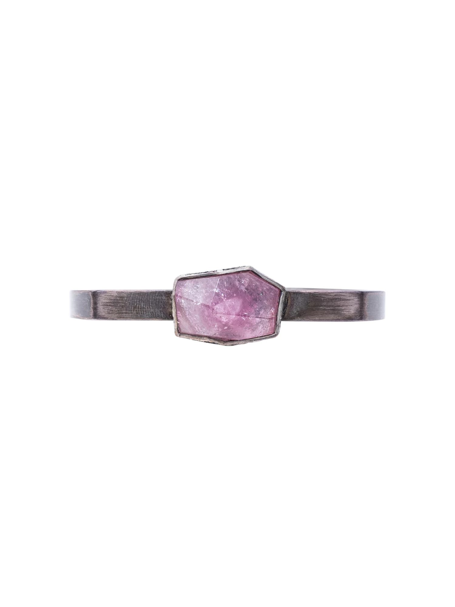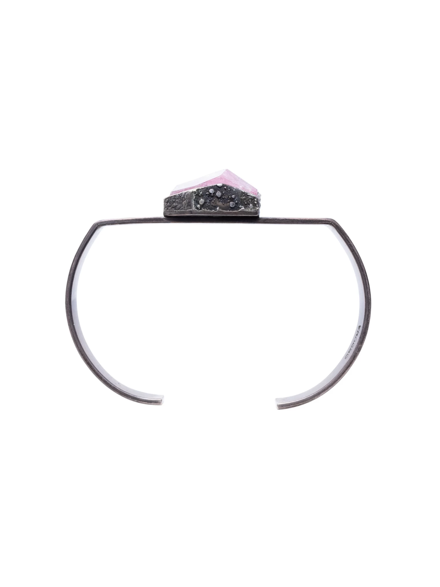 Pink morganite stone bezel set in brass, on square-shaped sterling silver cuff.