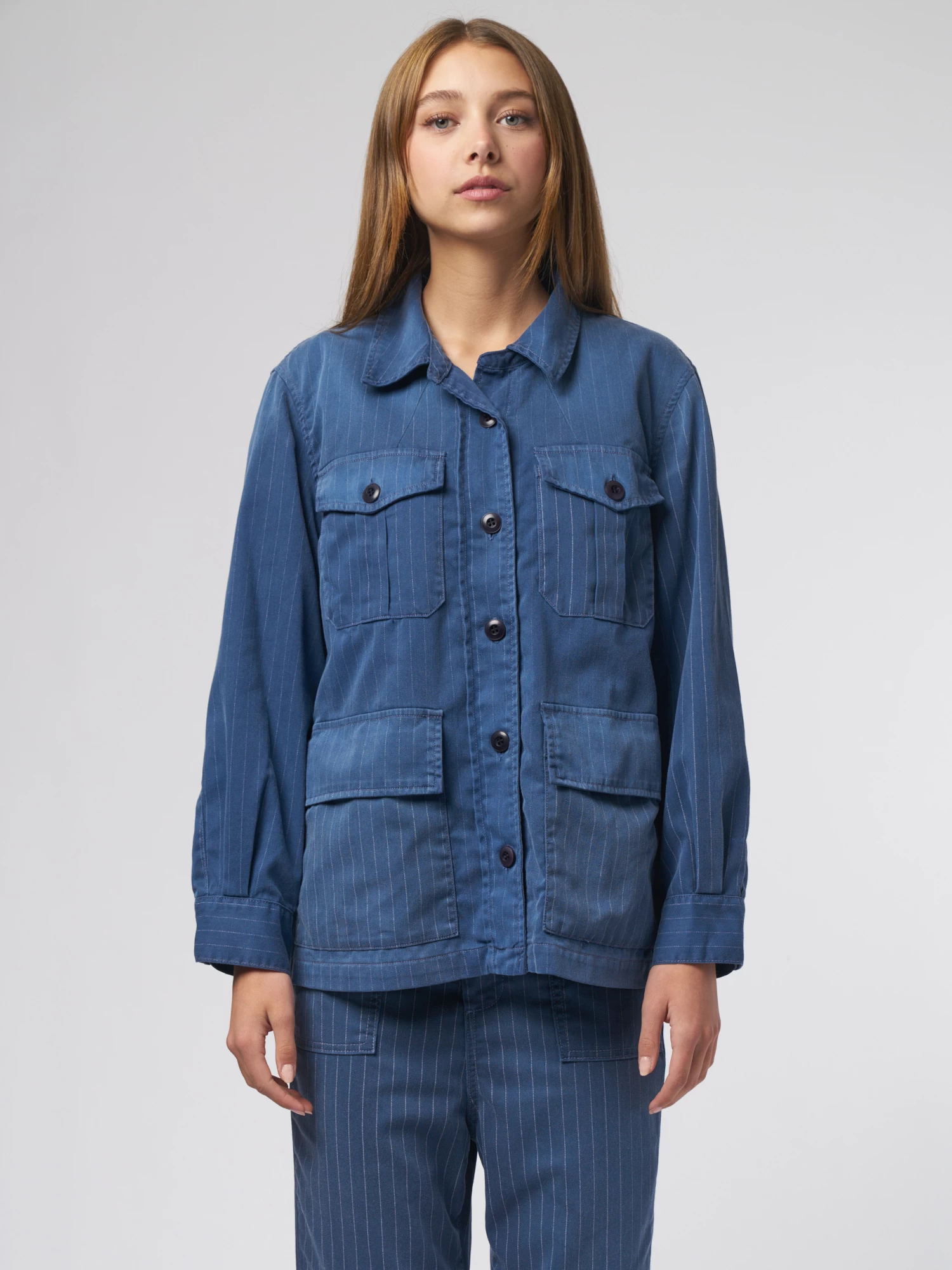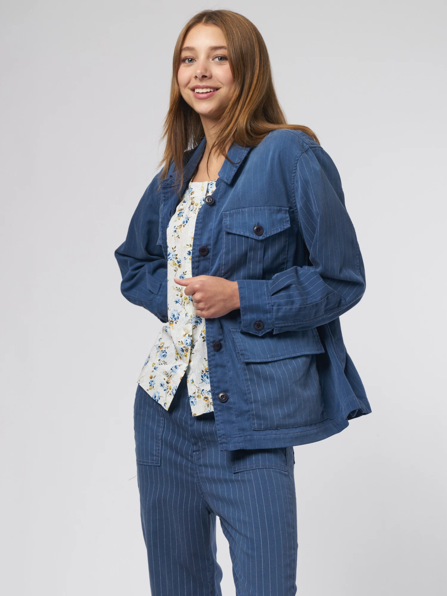 Very soft herringbone pinstripe jacket has utilitarian pockets, corozo buttons, and pleated sleeves