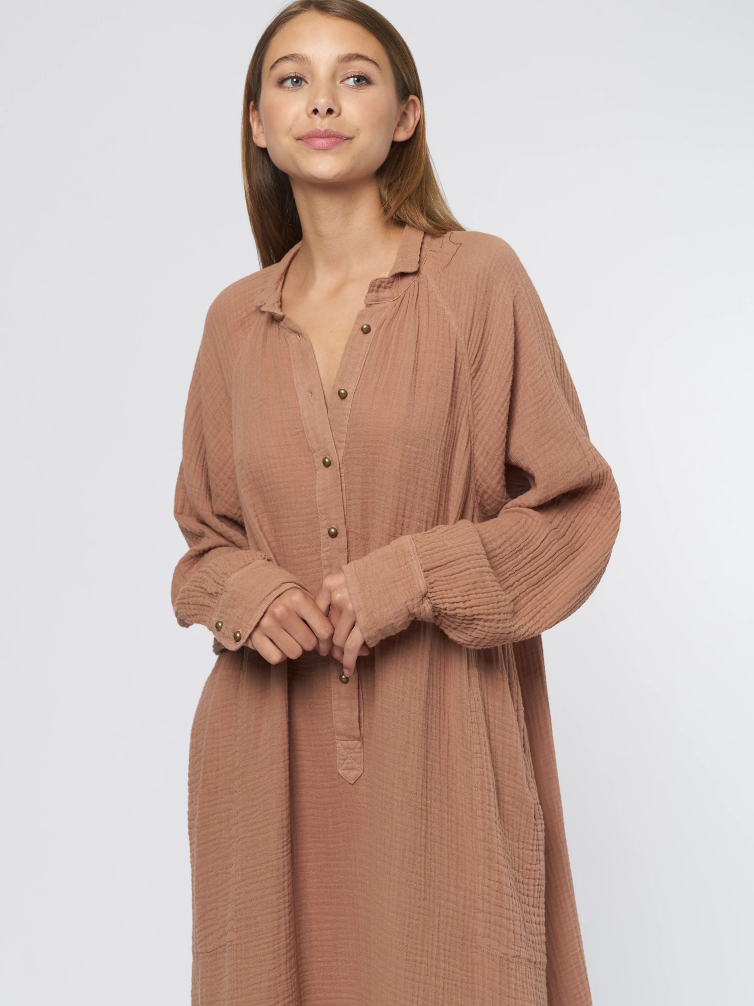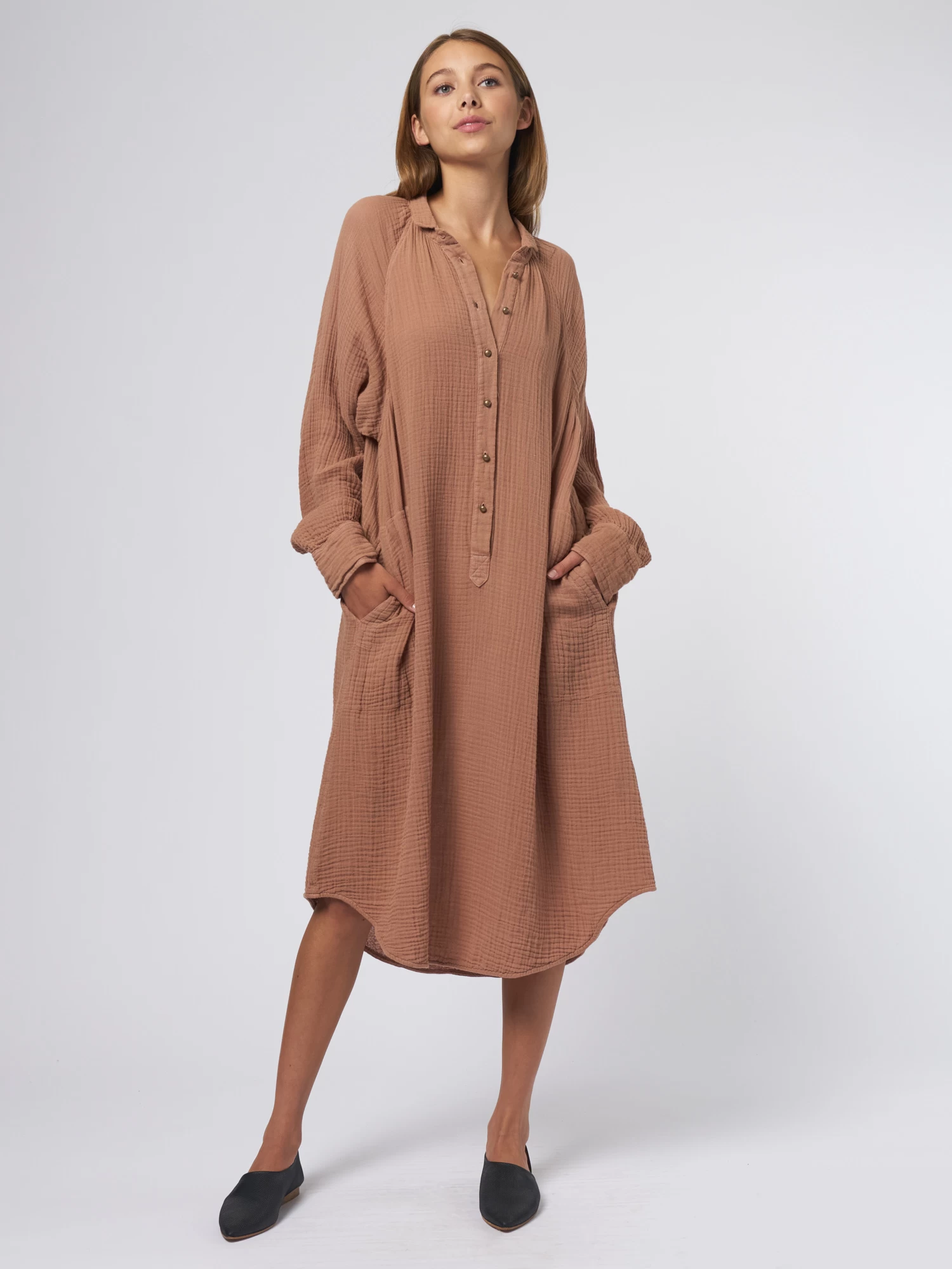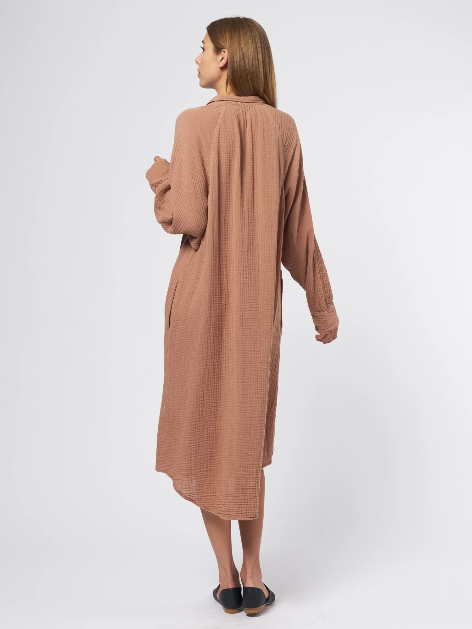 Cotton Gauze dress designed with long billowy sleeves, a button-up neckline, curved hem, and pockets