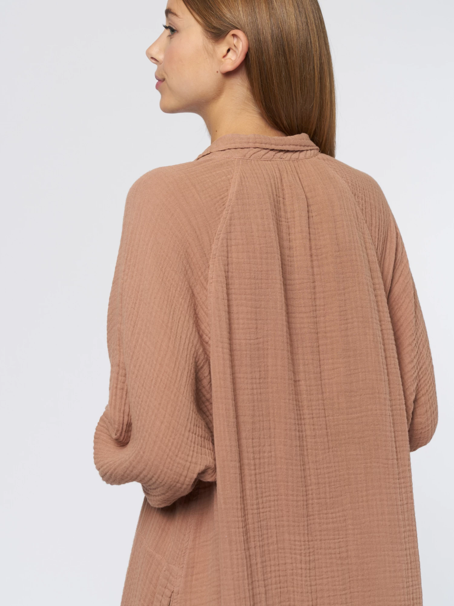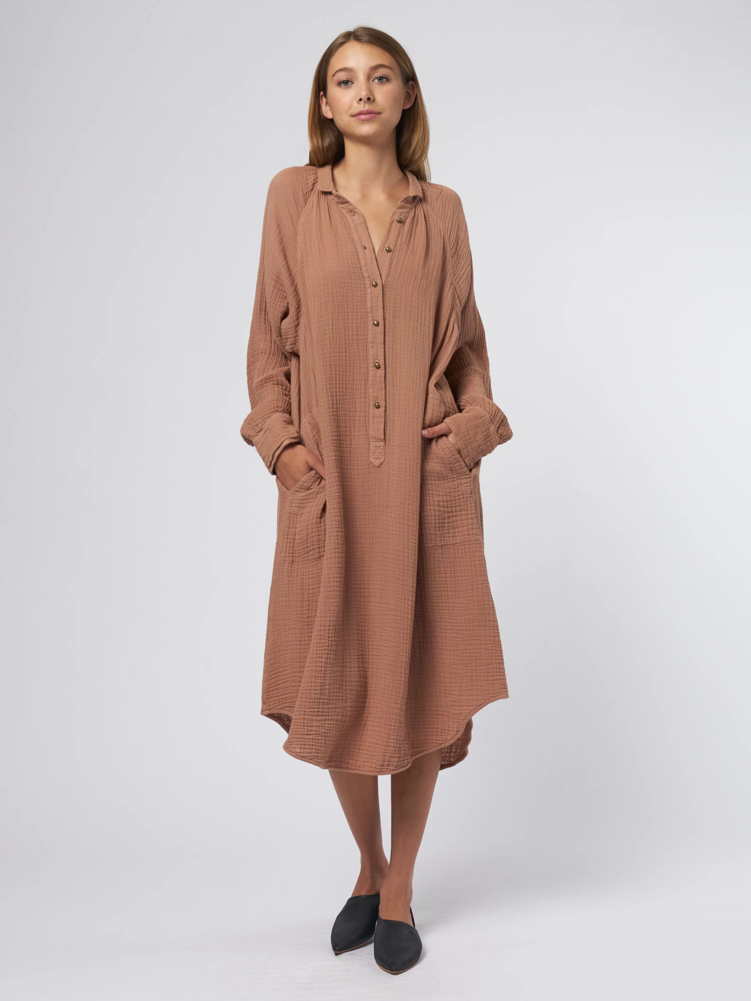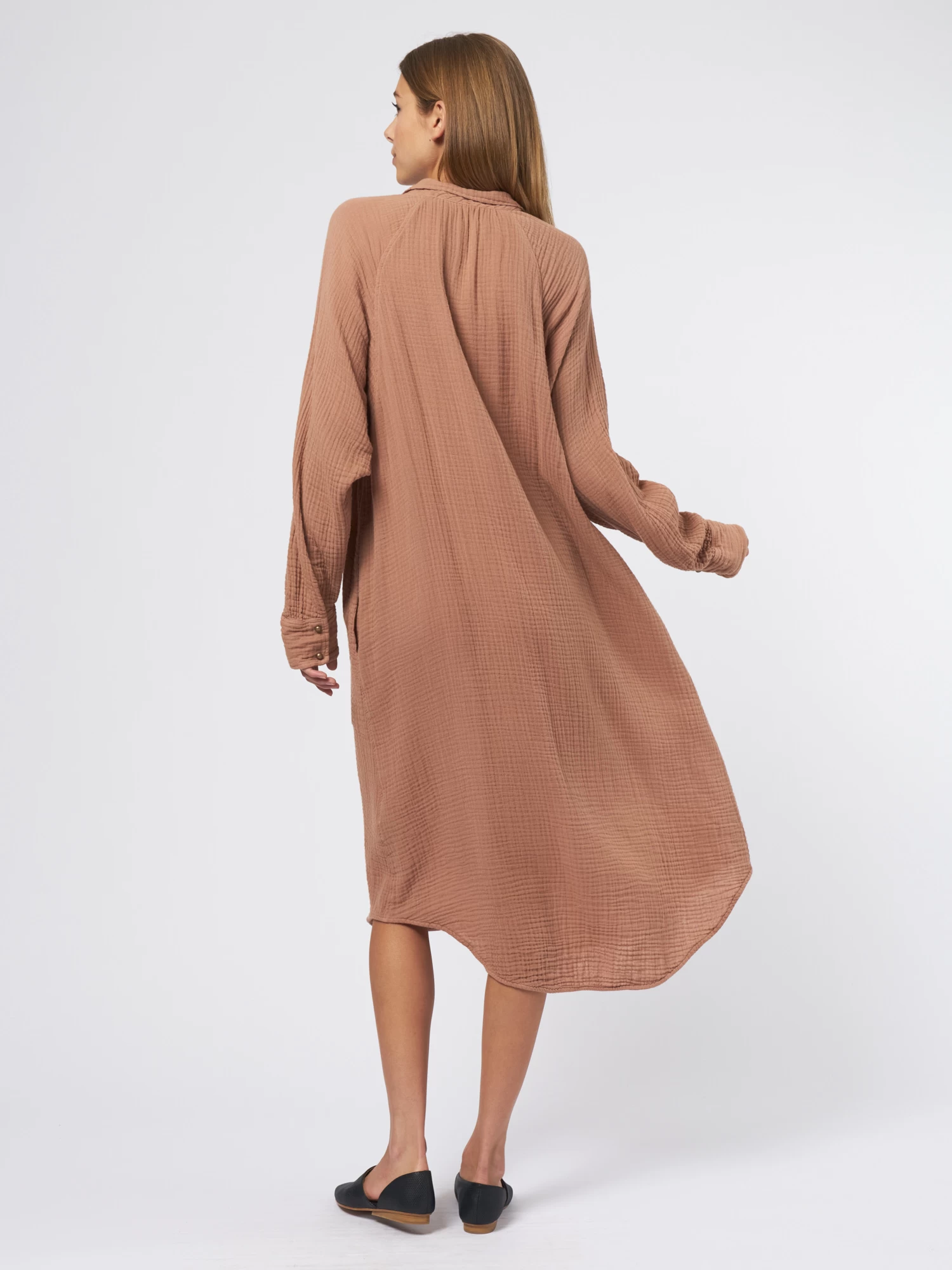 Cotton Gauze dress designed with long billowy sleeves, a button-up neckline, curved hem, and pockets