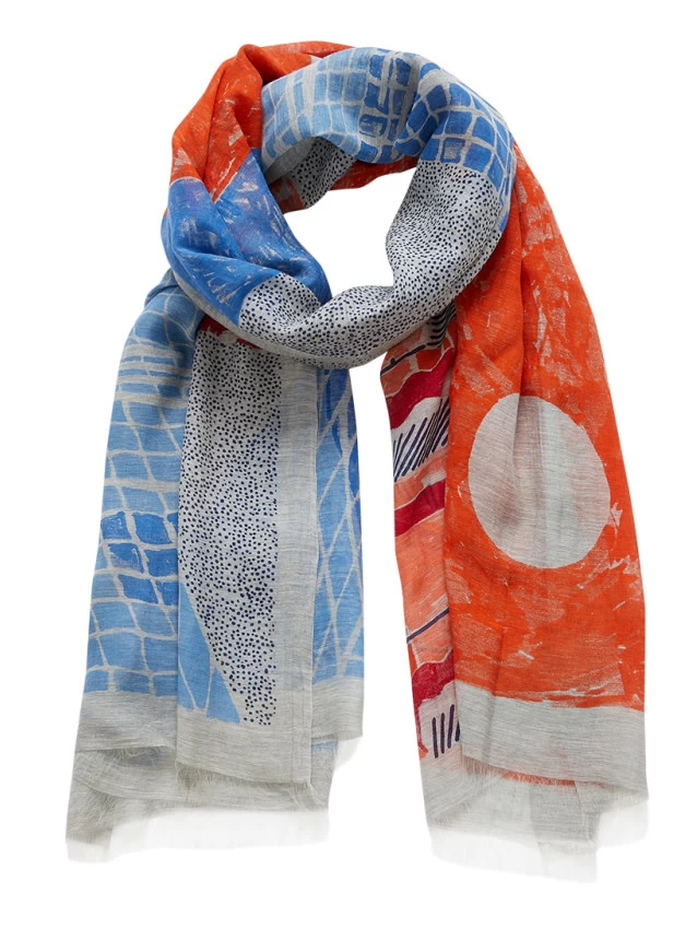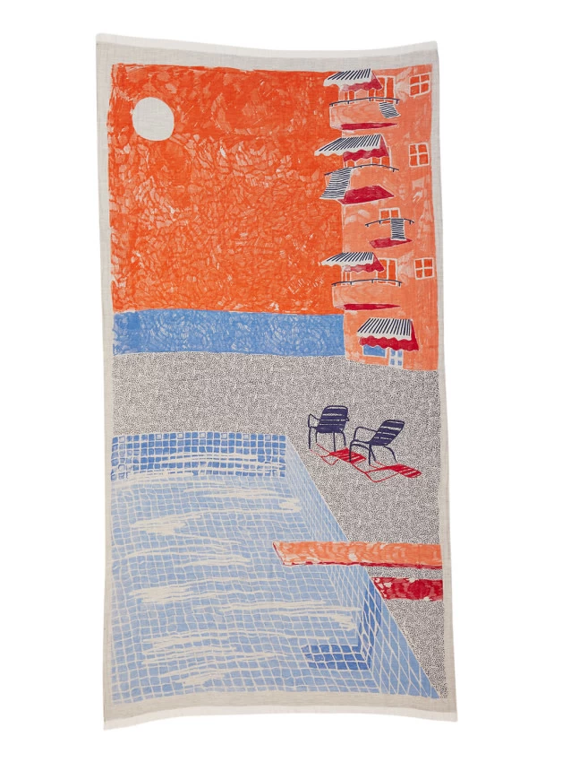A cotton blend scarf with a colorful outdoor swimming pool graphic, mat weave, and fringed edges.