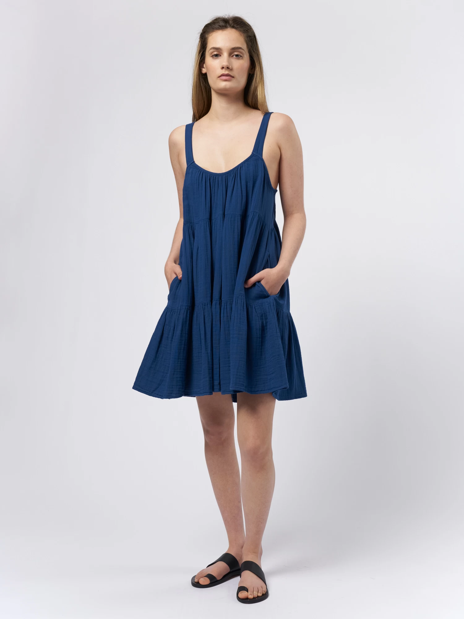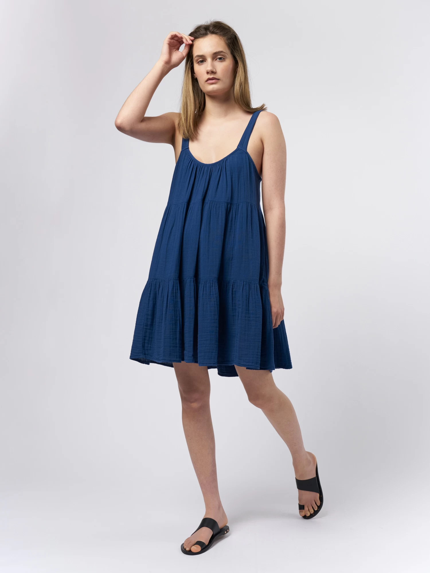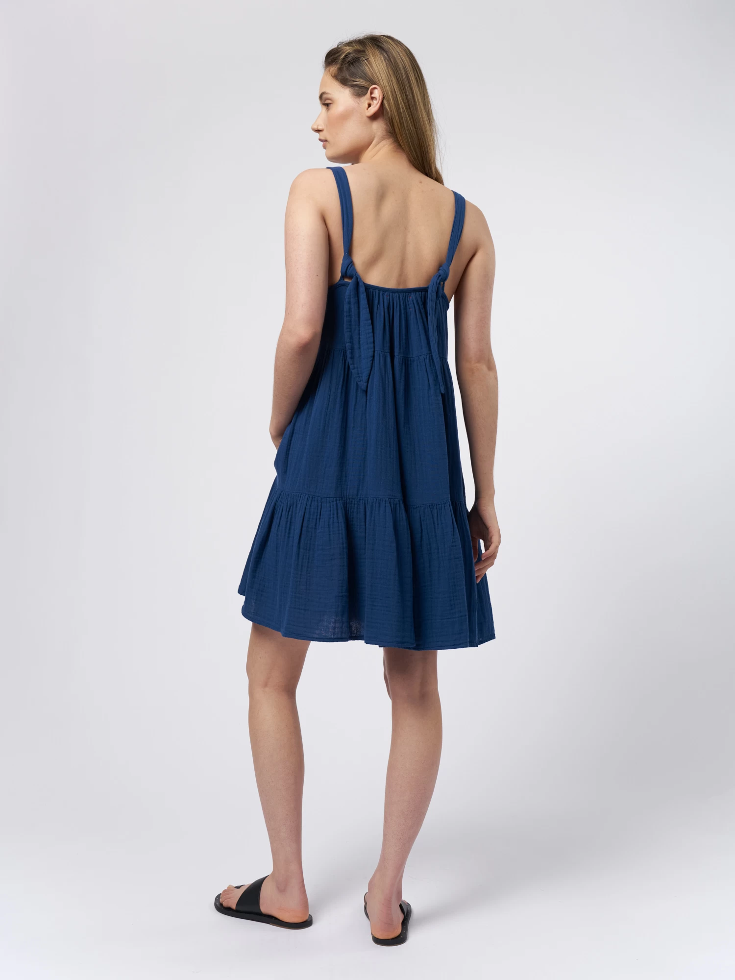 Mini dress in cotton gauze dress with a scoop neck, ruffled hem, side seam pockets, and shoulder straps with back ties.