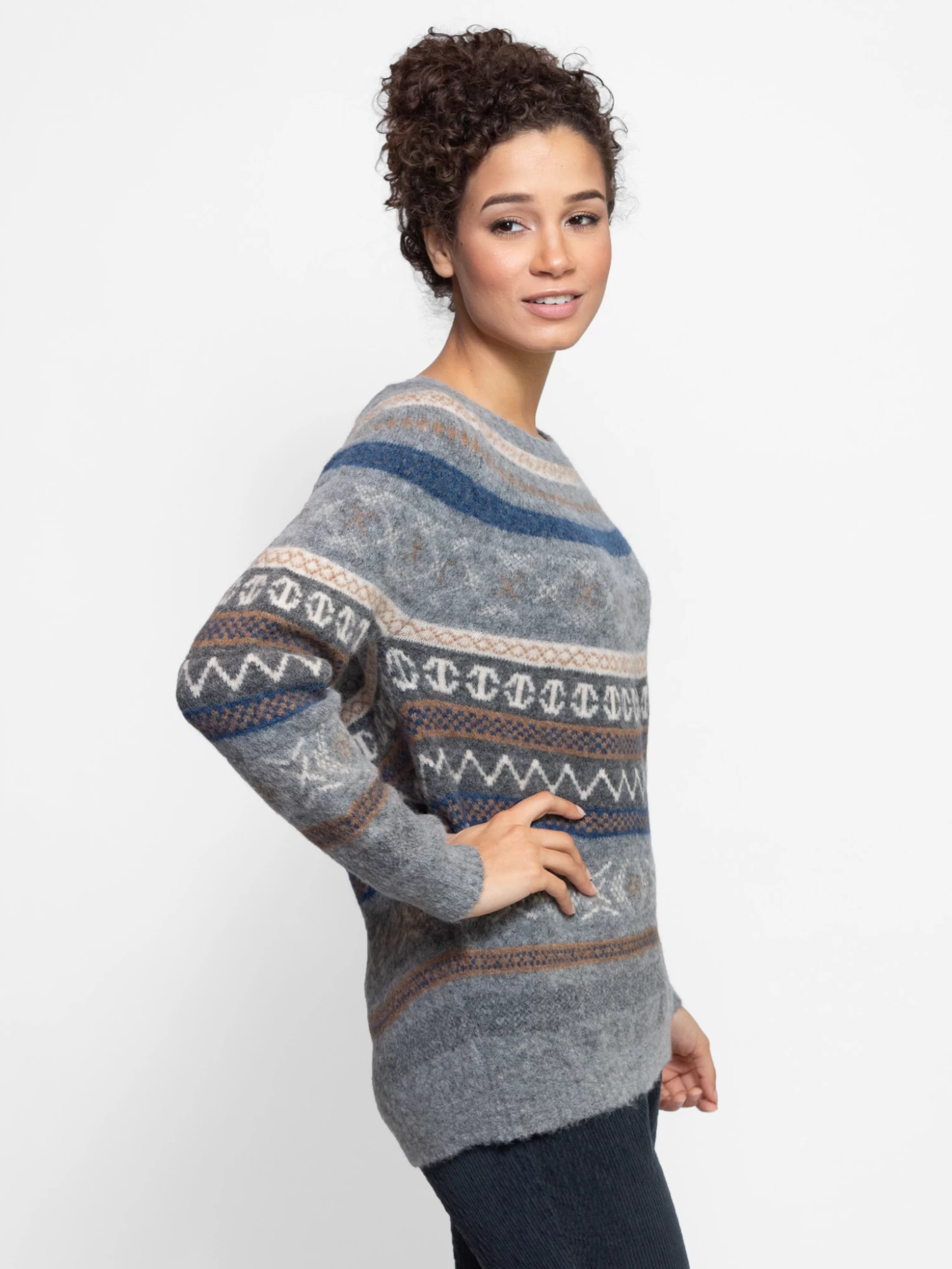A crew neck sweater features raglan sleeves and an allover patterned stripe in a grey, blue, brown, and cream wool blend.