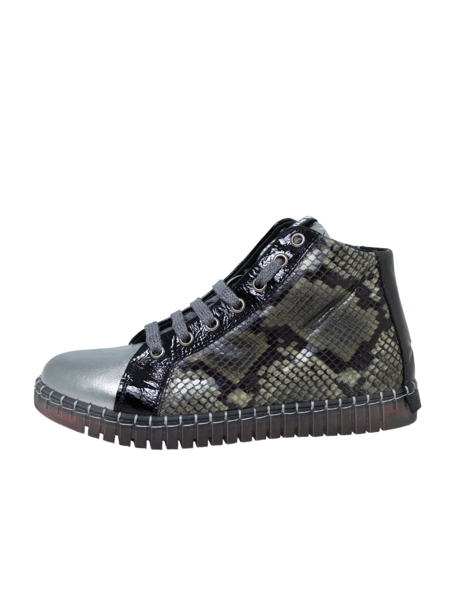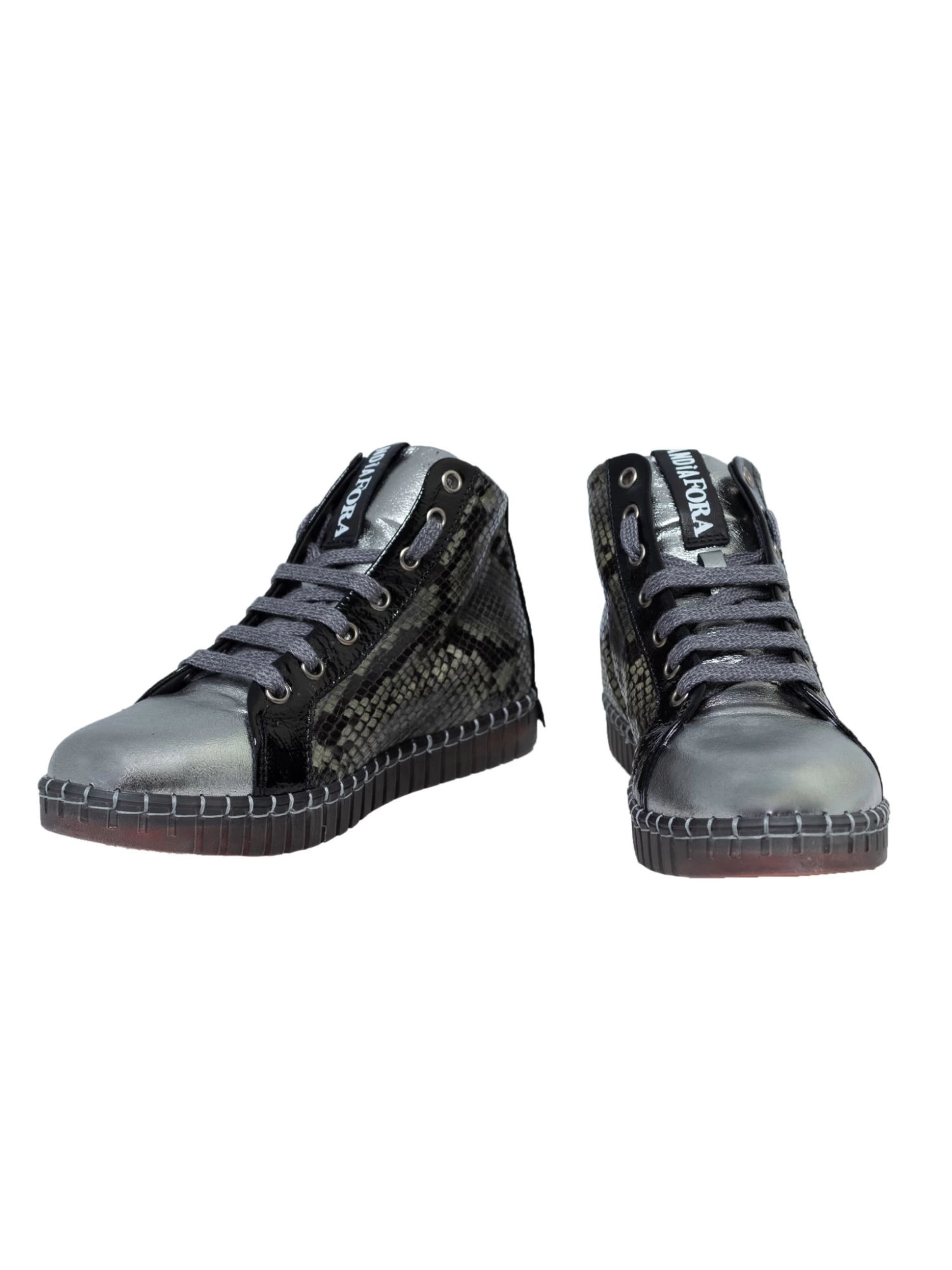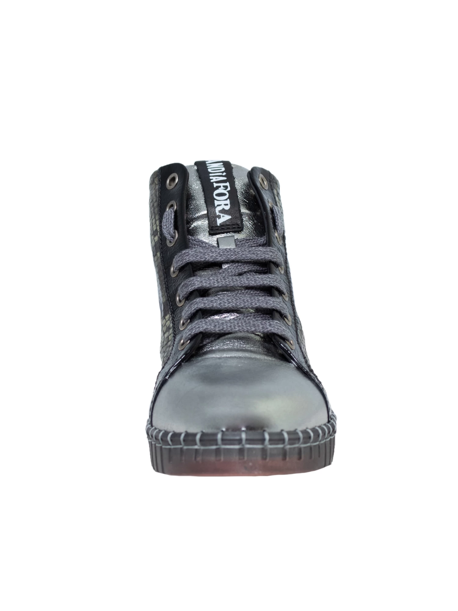 A high-top sneaker with clear soles and a hidden wedge heel in snakeskin embossed leather with a silver toe cap.