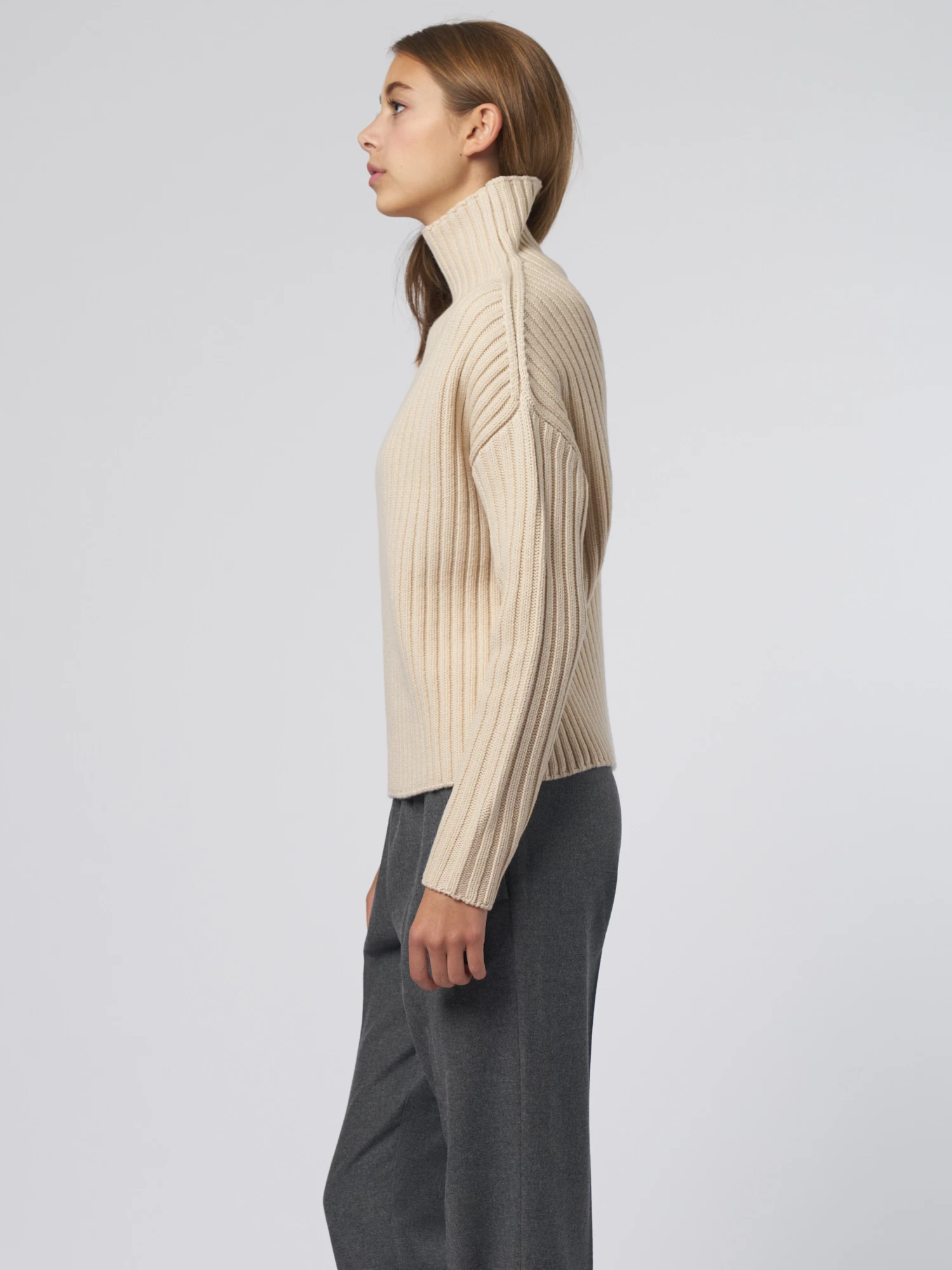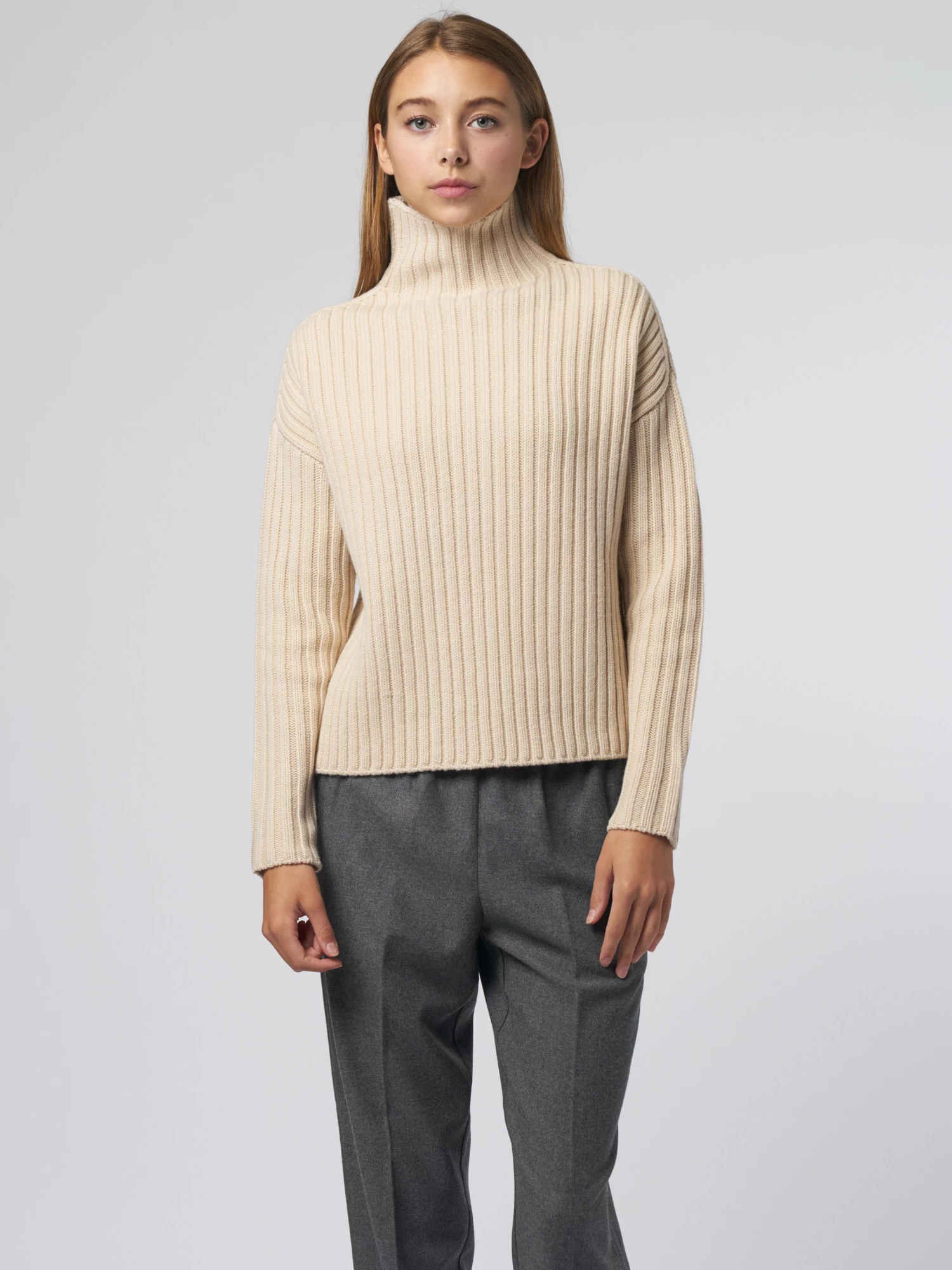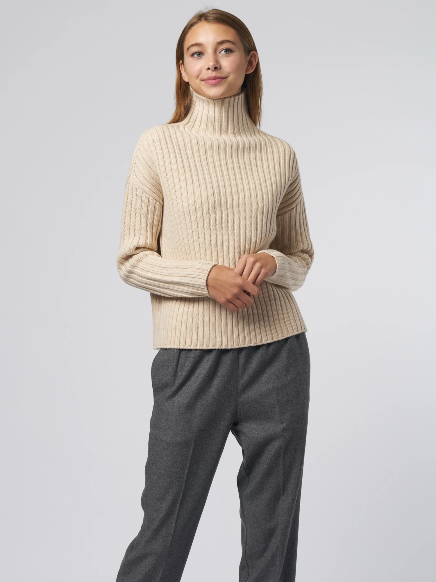 English rib crewneck in wool has drop shoulder sleeves with an oversize fit.