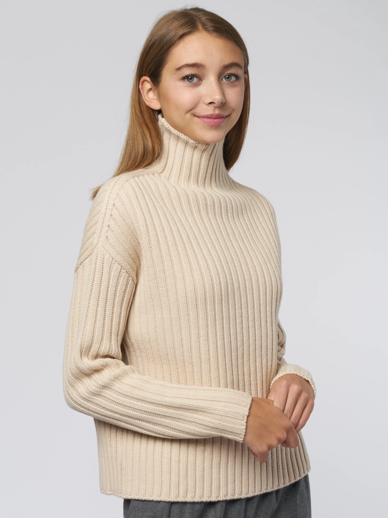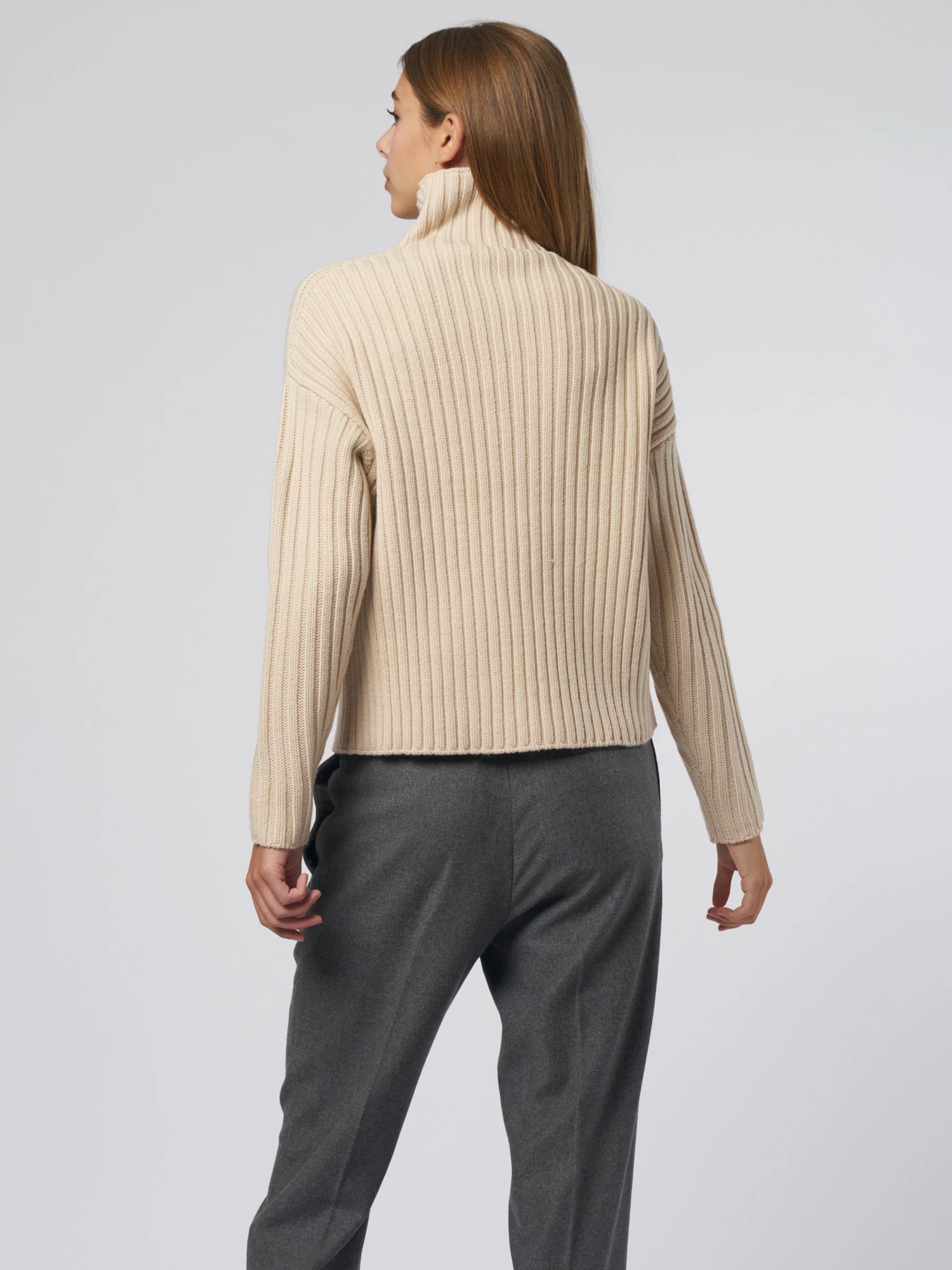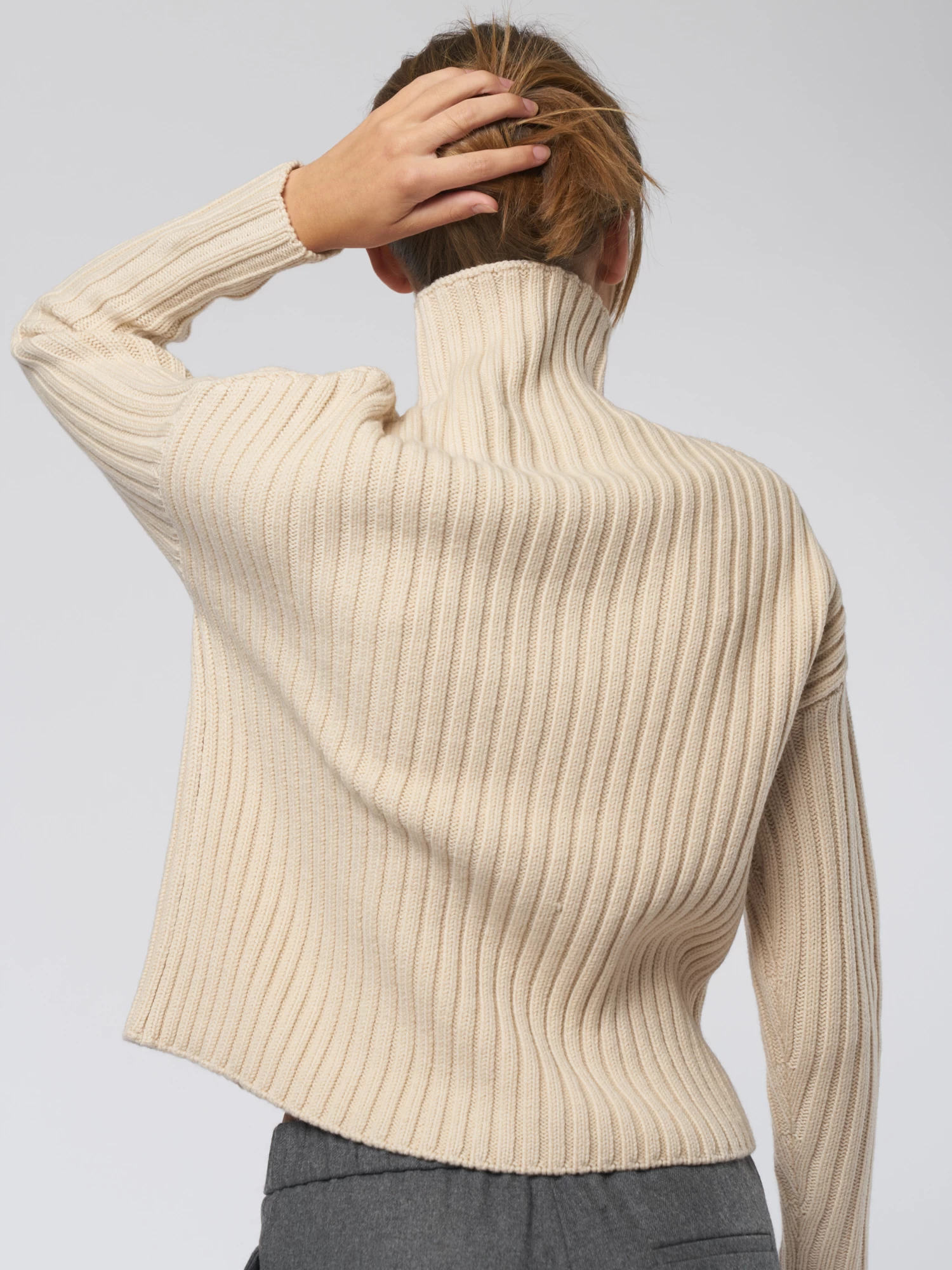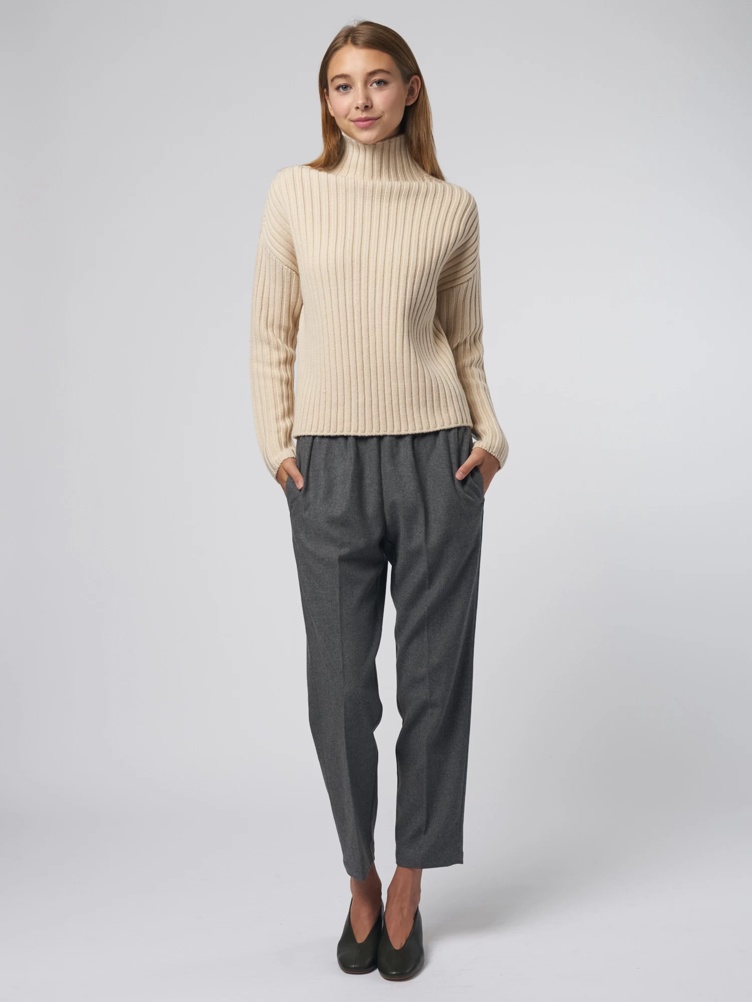 English rib crewneck in wool has drop shoulder sleeves with an oversize fit.